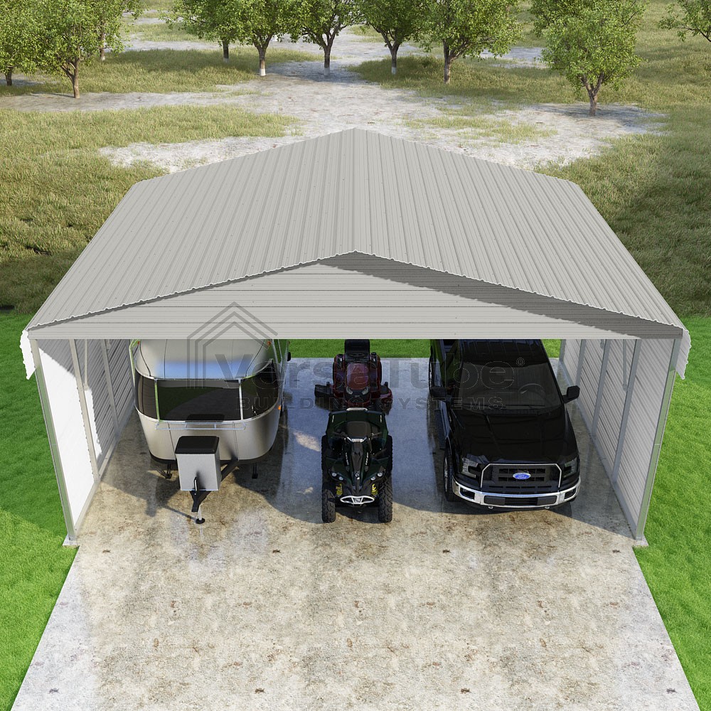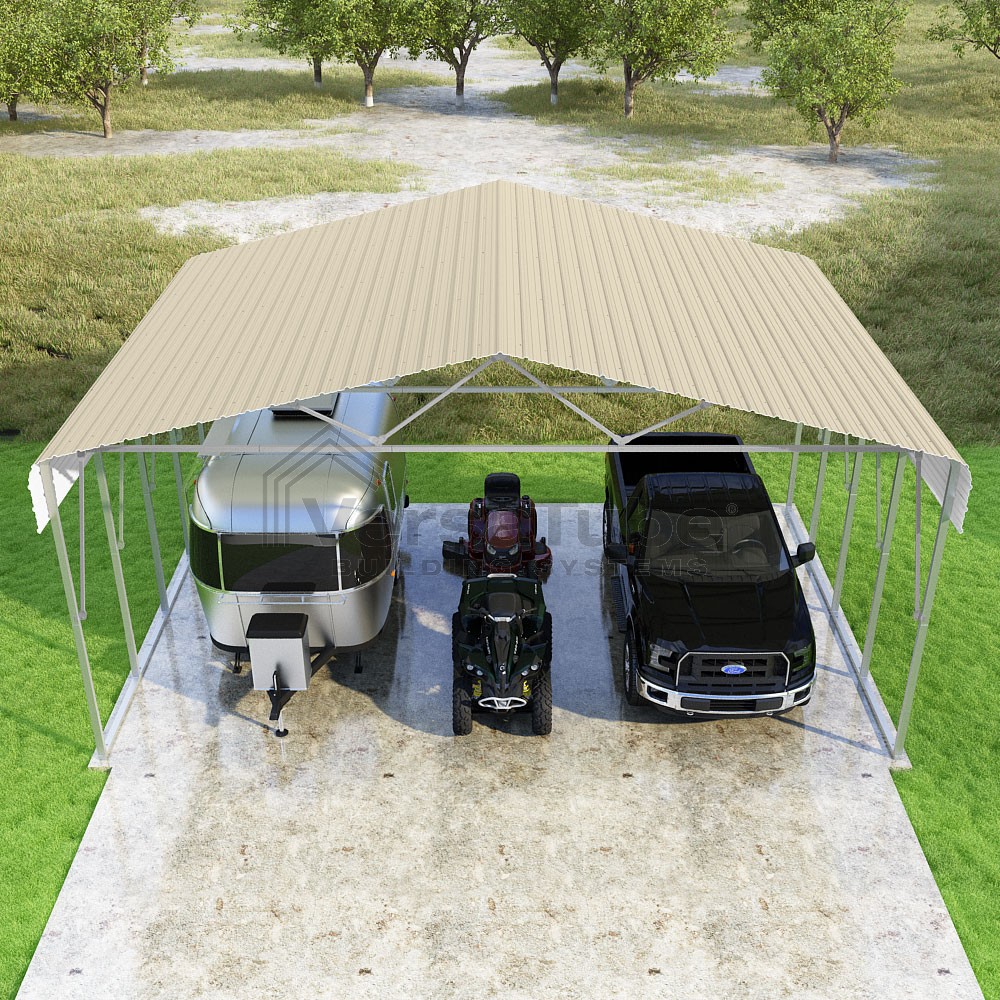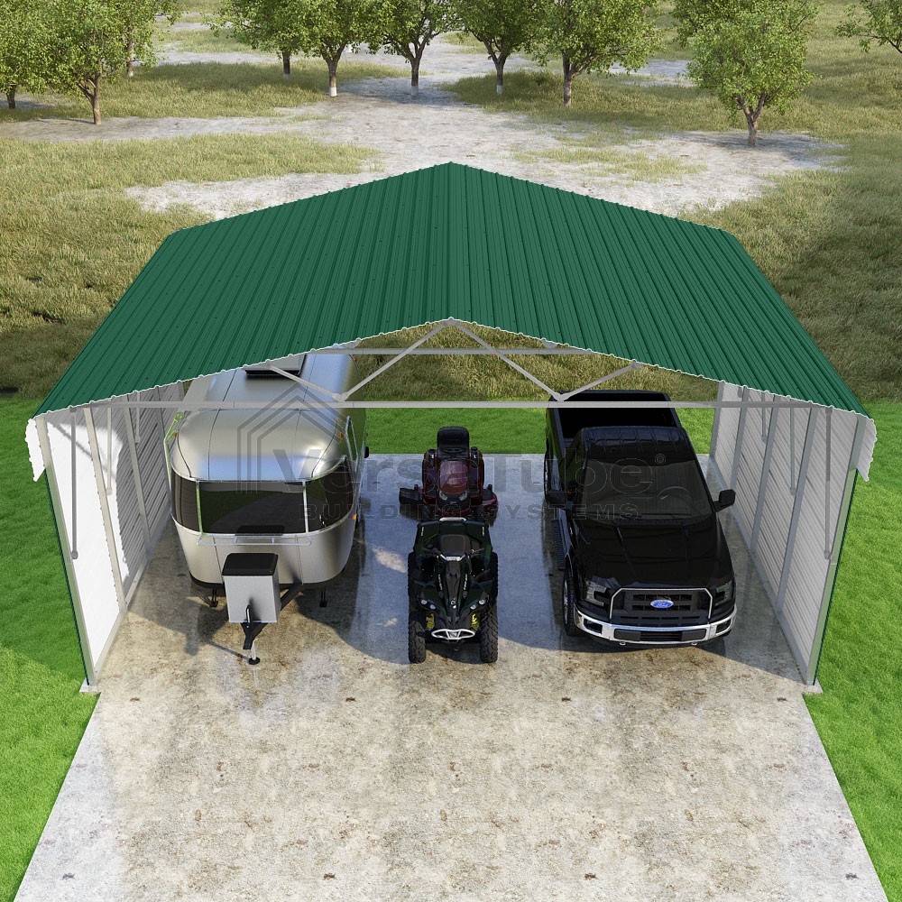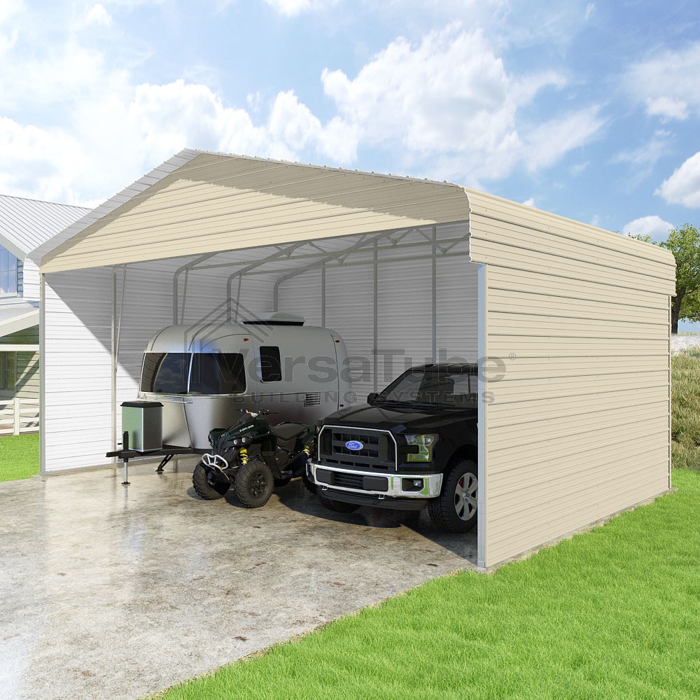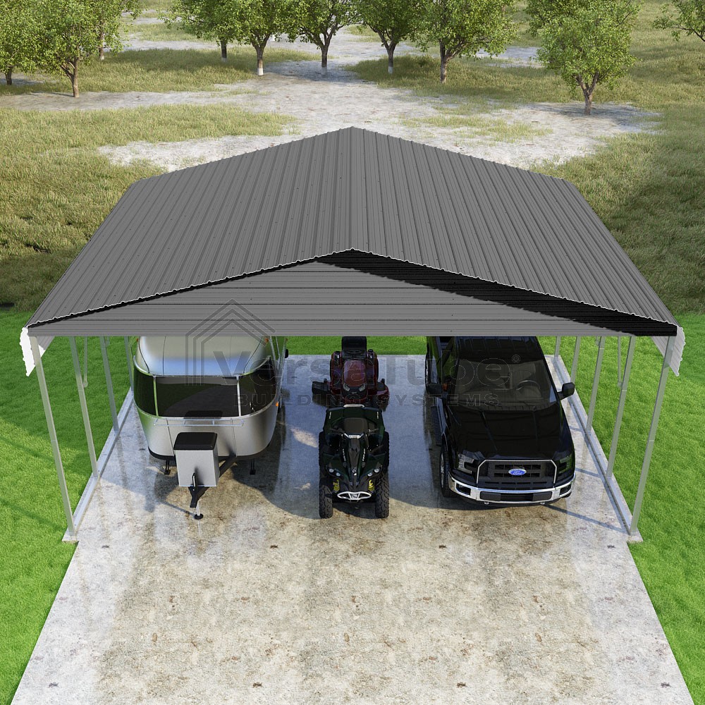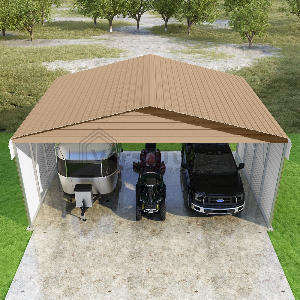 Classic Series DIY carport kit features horizontal application of sheet metal panels with the extra protection of rounded eaves.