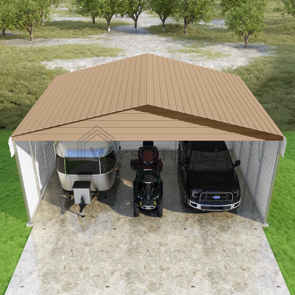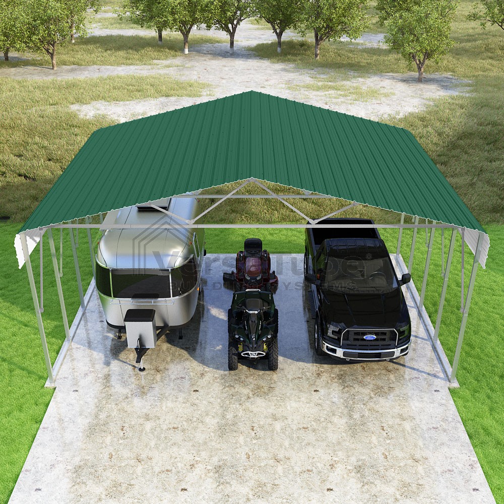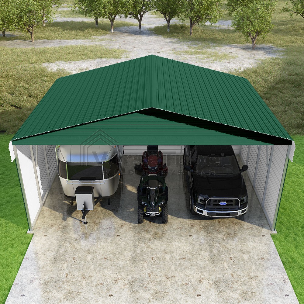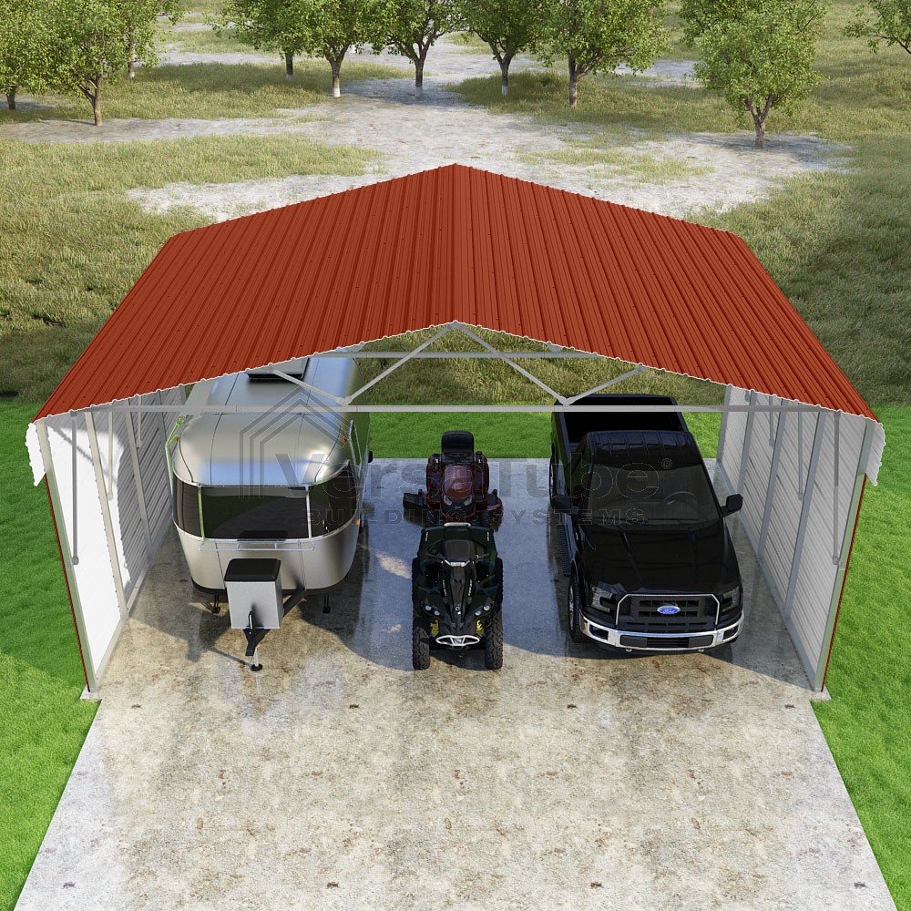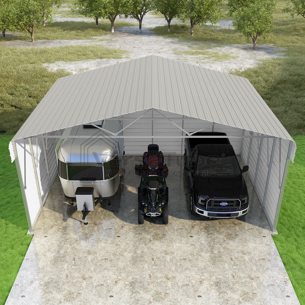 Classic Series DIY carport kit features horizontal application of sheet metal panels with the extra protection of rounded eaves.