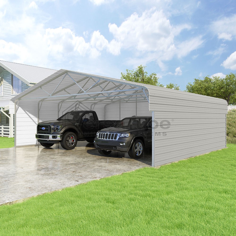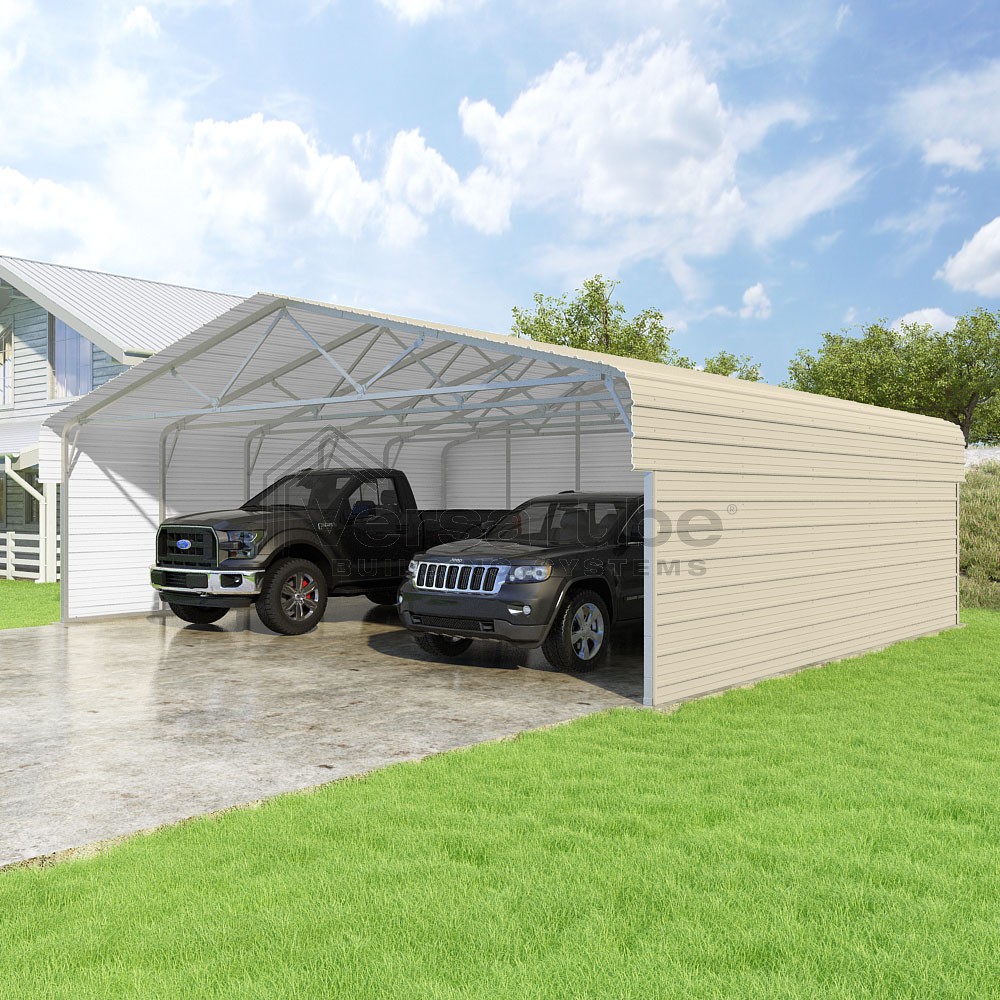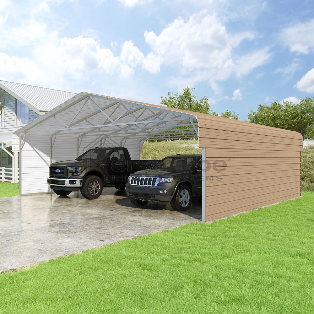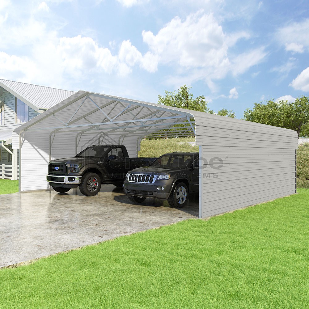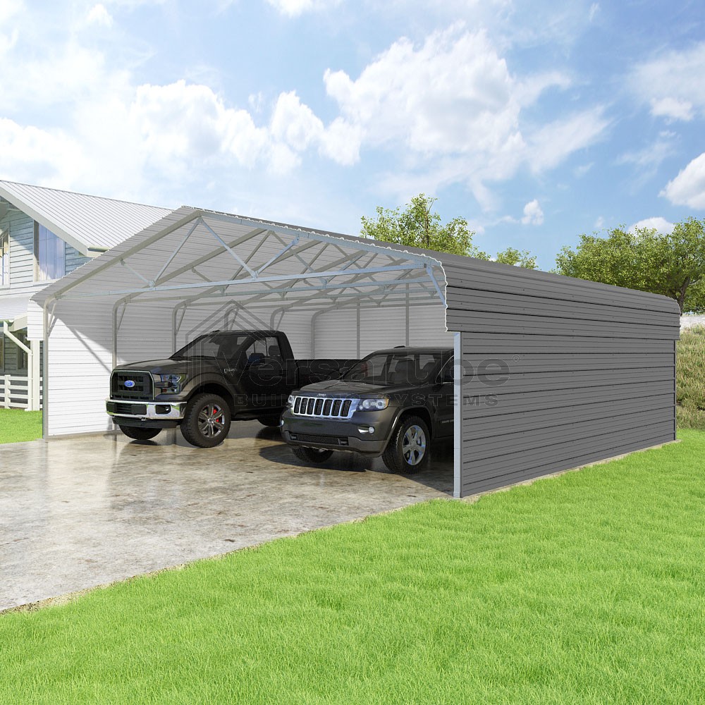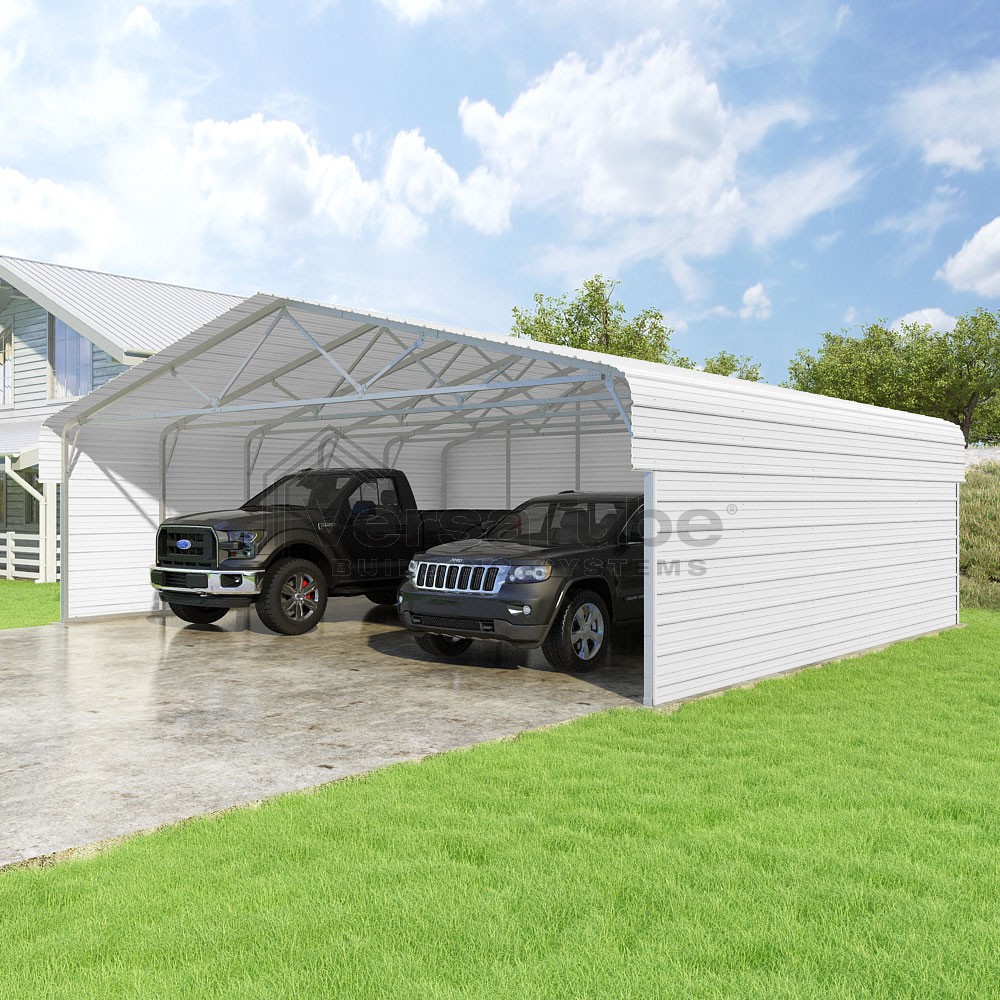 Classic Series DIY carport kit features horizontal application of sheet metal panels with the extra protection of rounded eaves.
