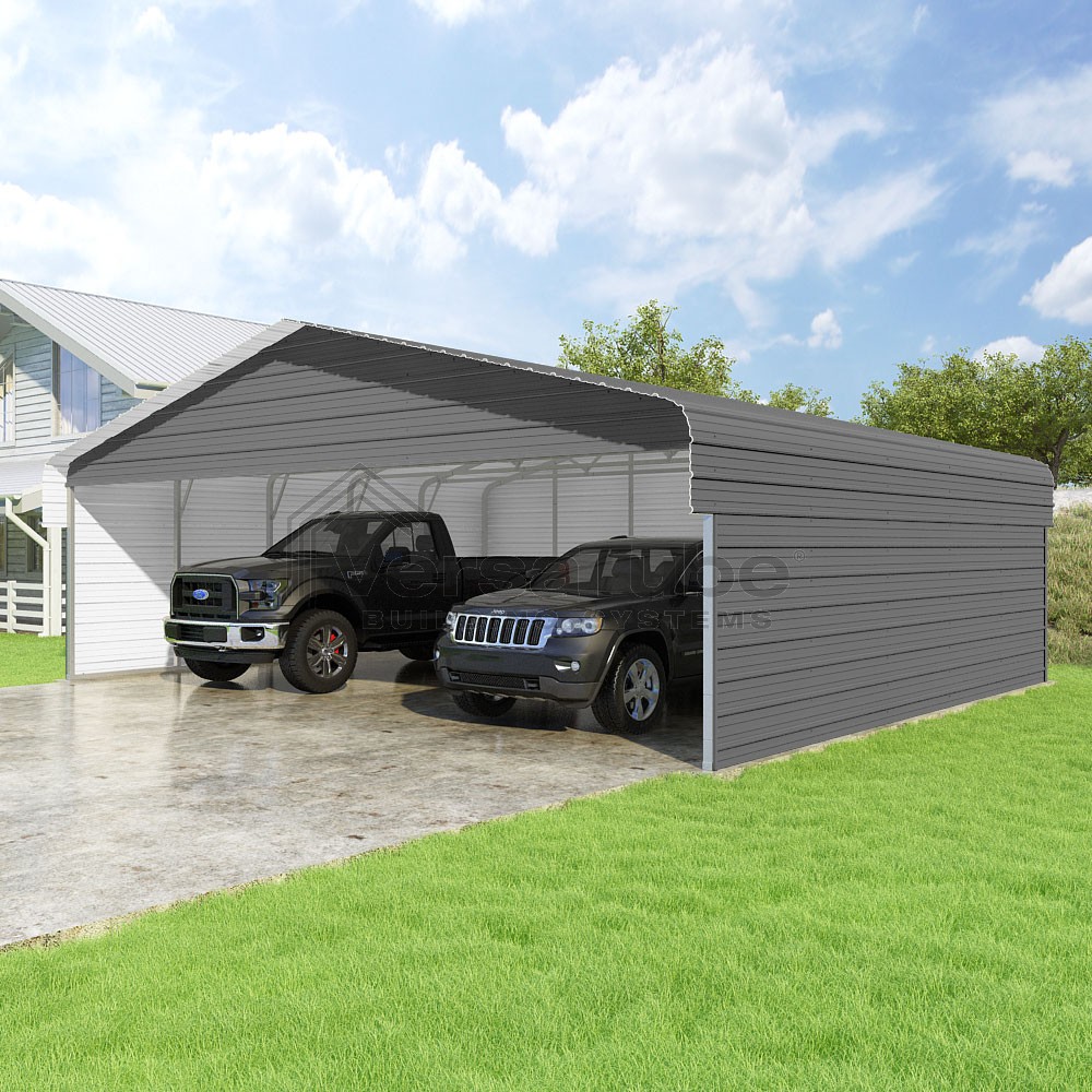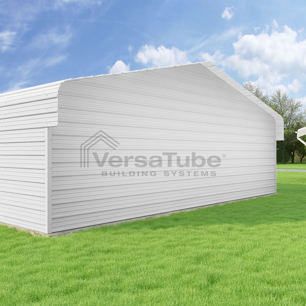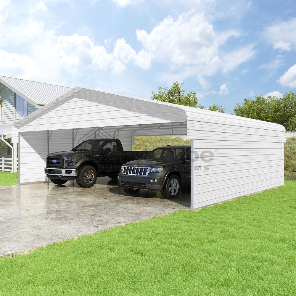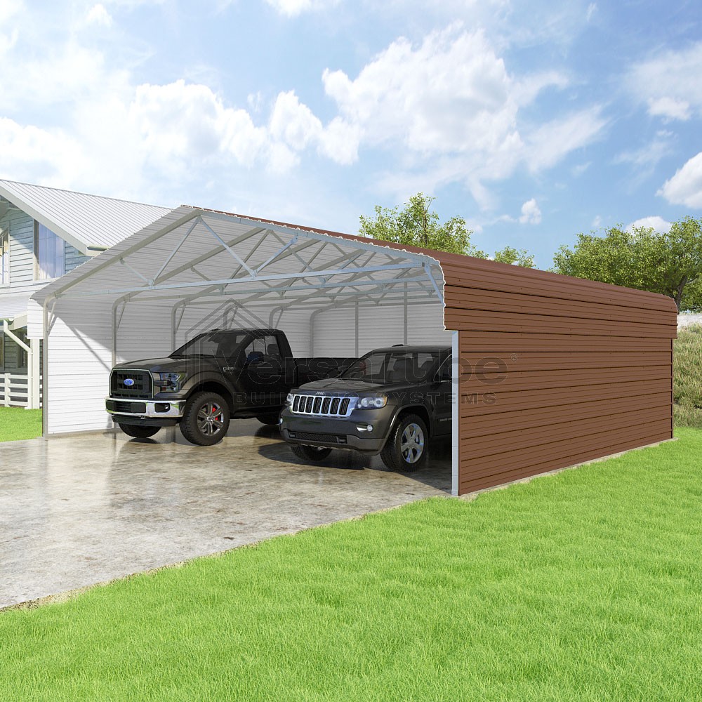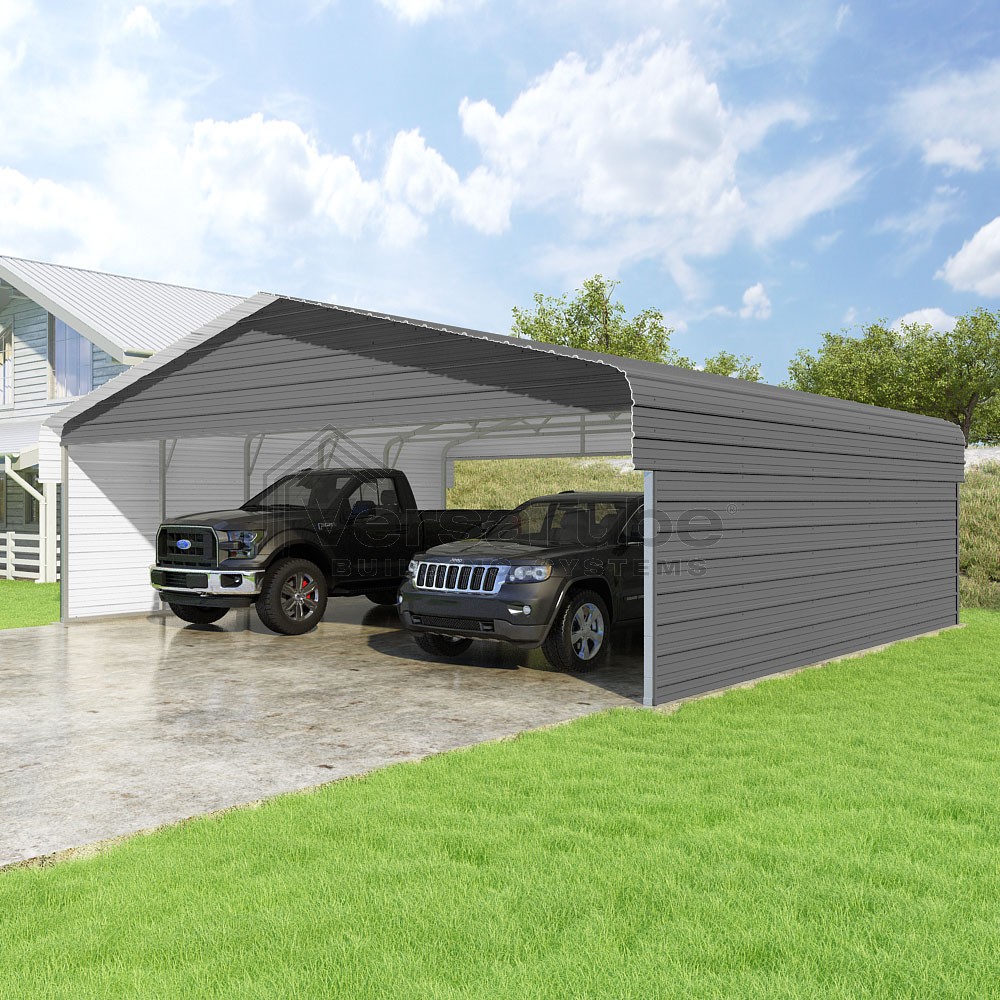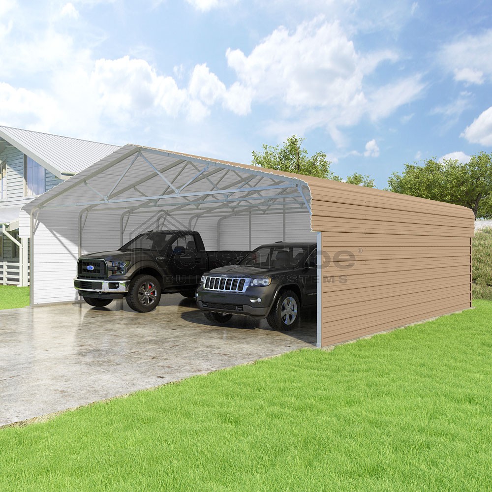 Classic Series DIY carport kit features horizontal application of sheet metal panels with the extra protection of rounded eaves.