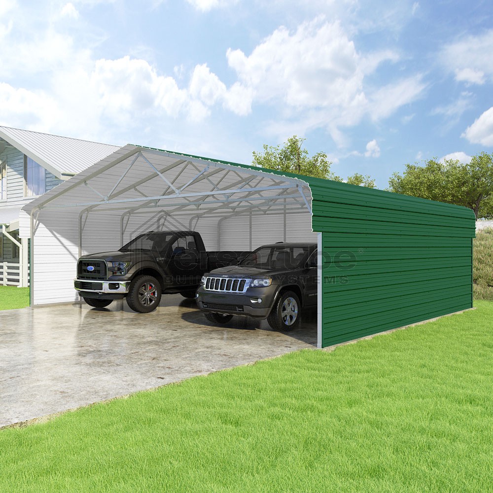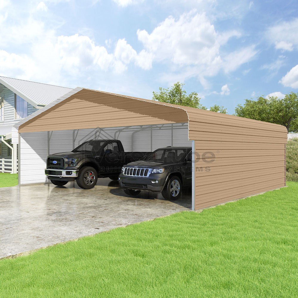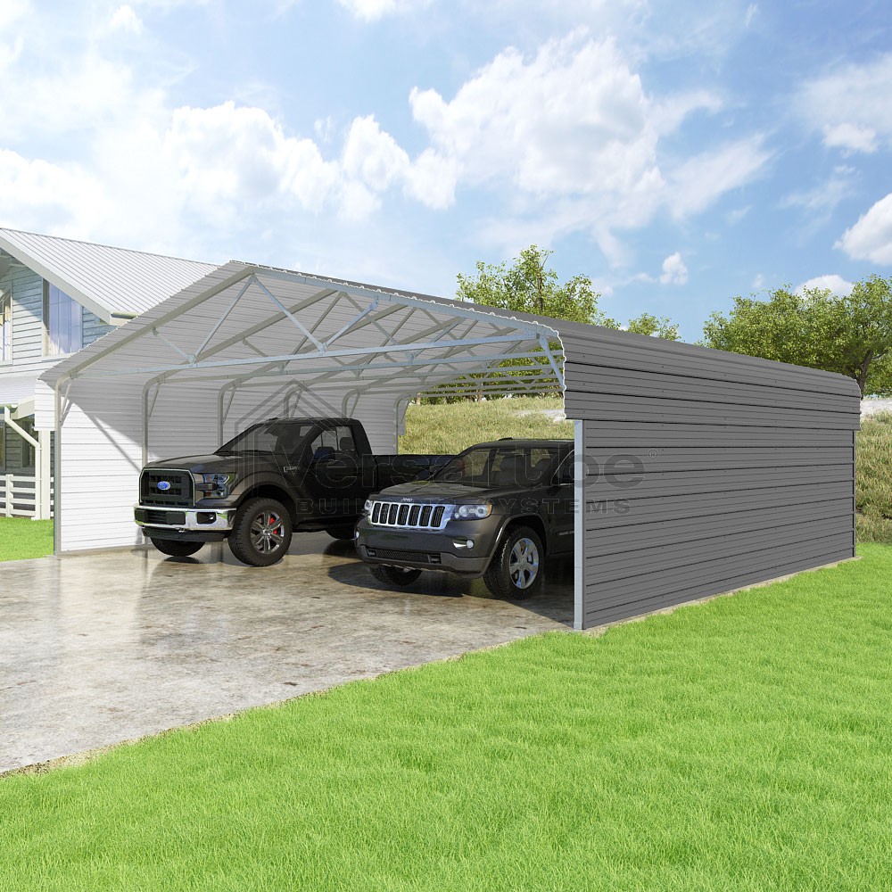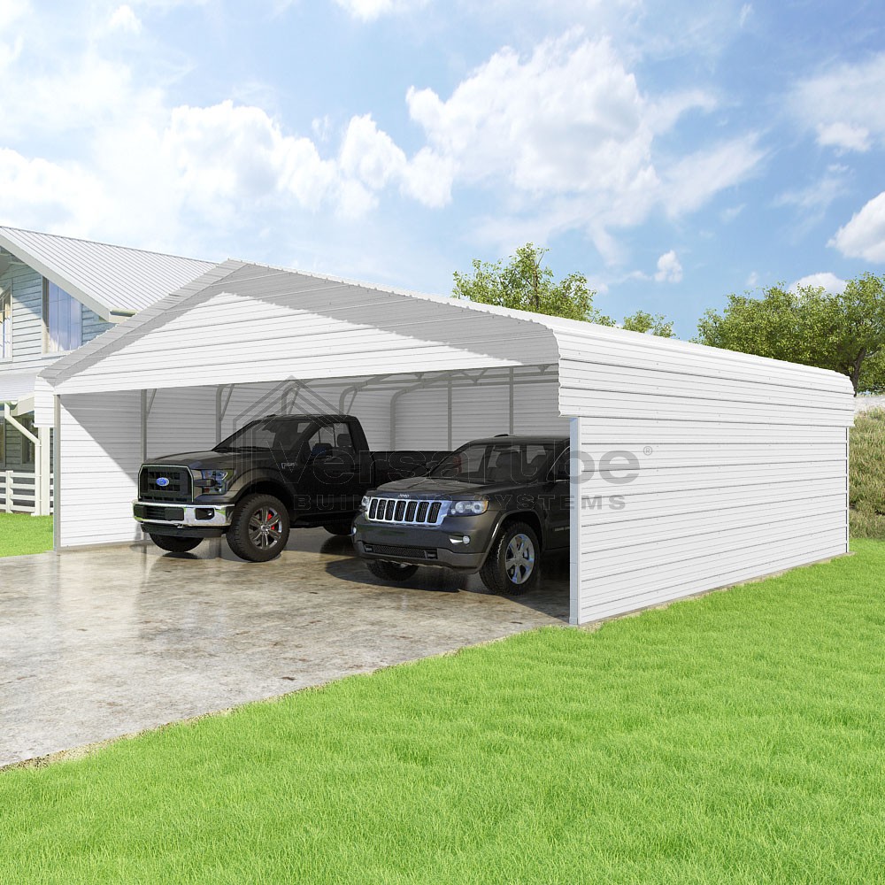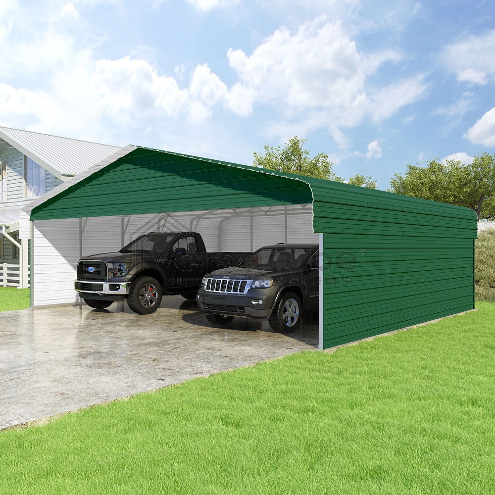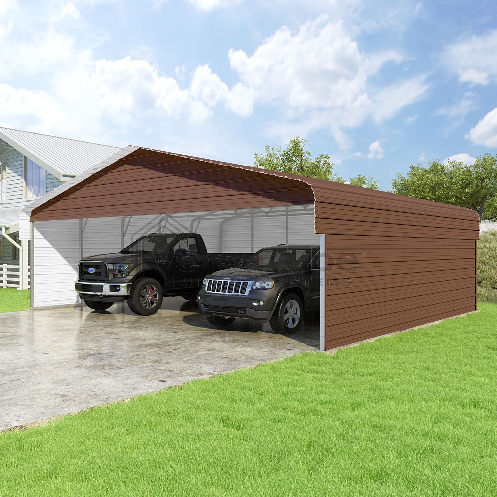 Classic Series DIY carport kit features horizontal application of sheet metal panels with the extra protection of rounded eaves.