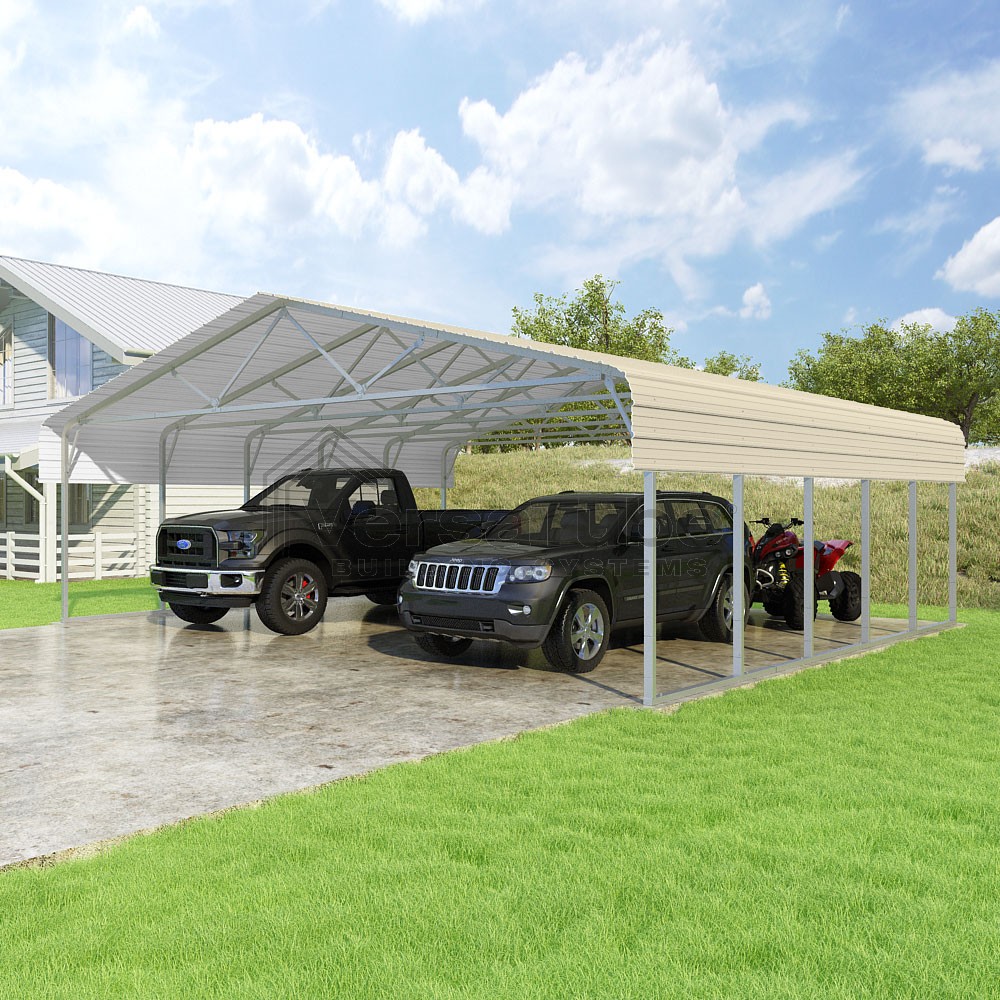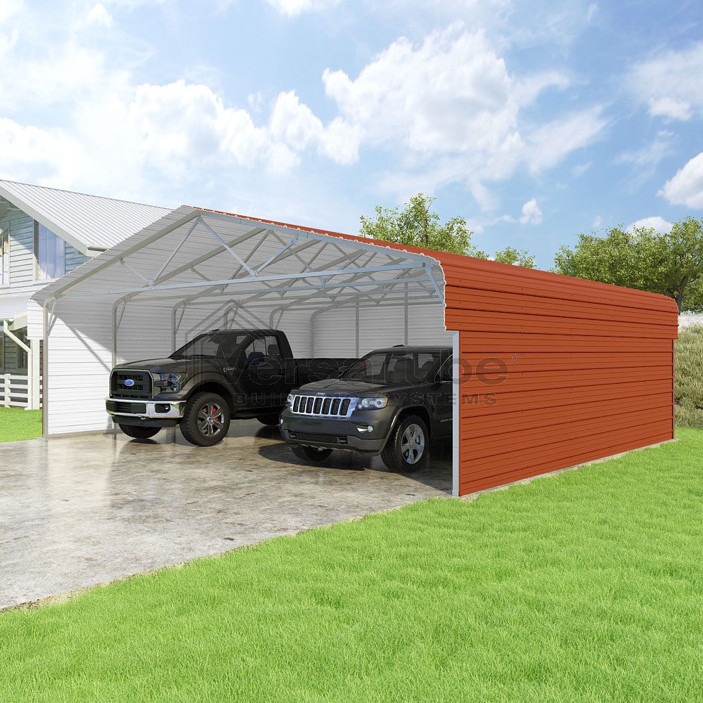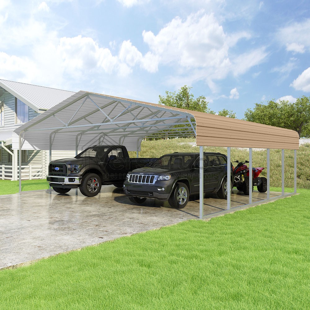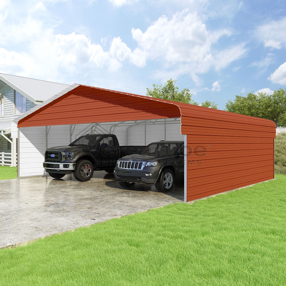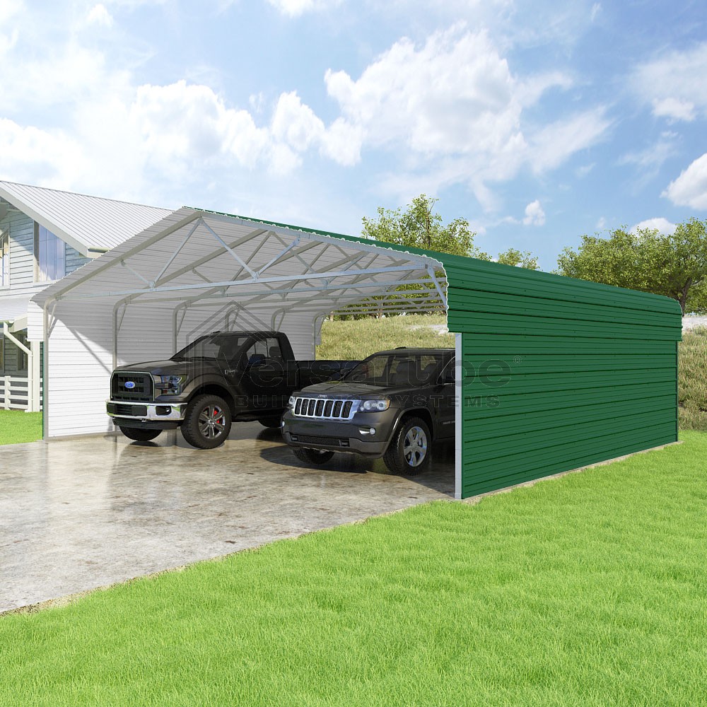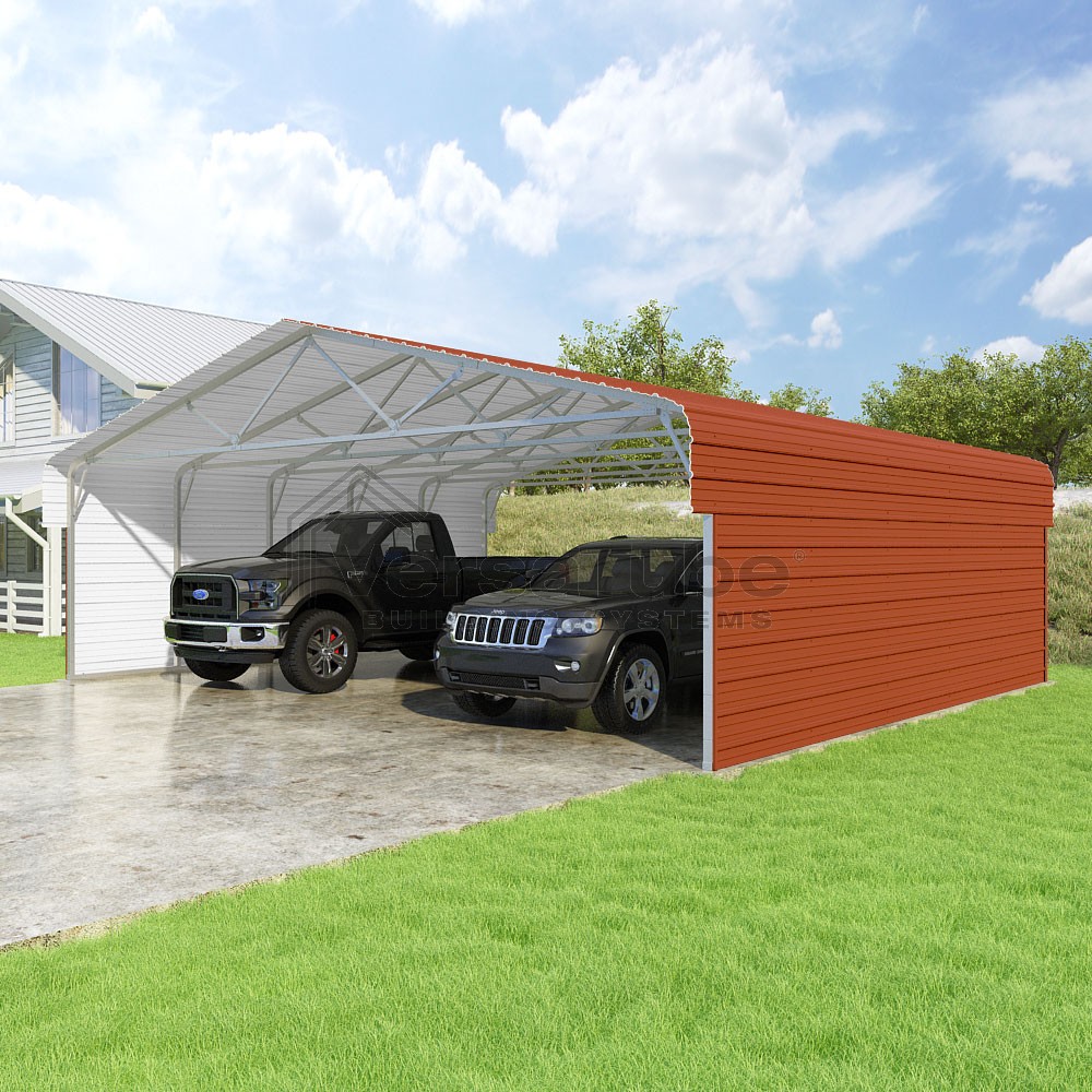 Classic Series DIY carport kit features horizontal application of sheet metal panels with the extra protection of rounded eaves.