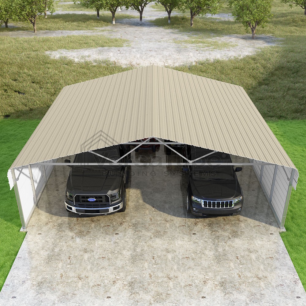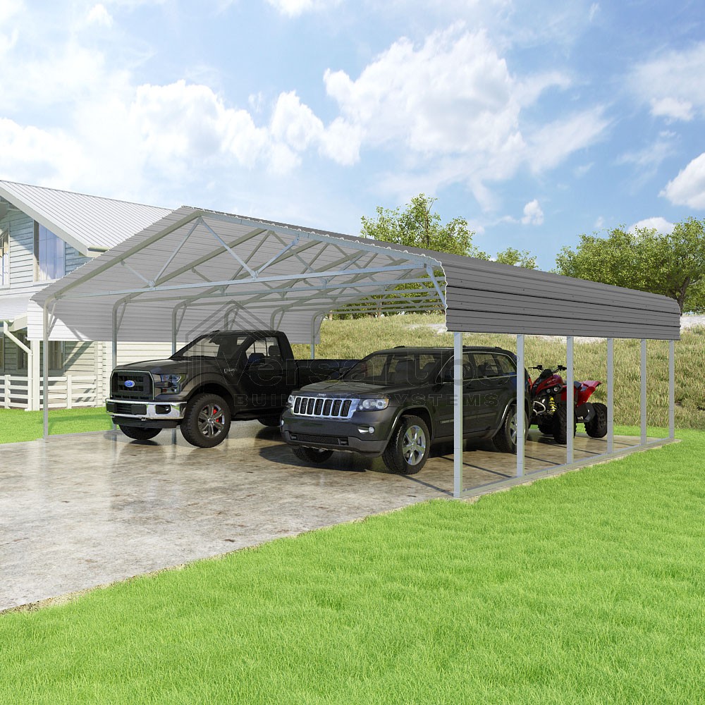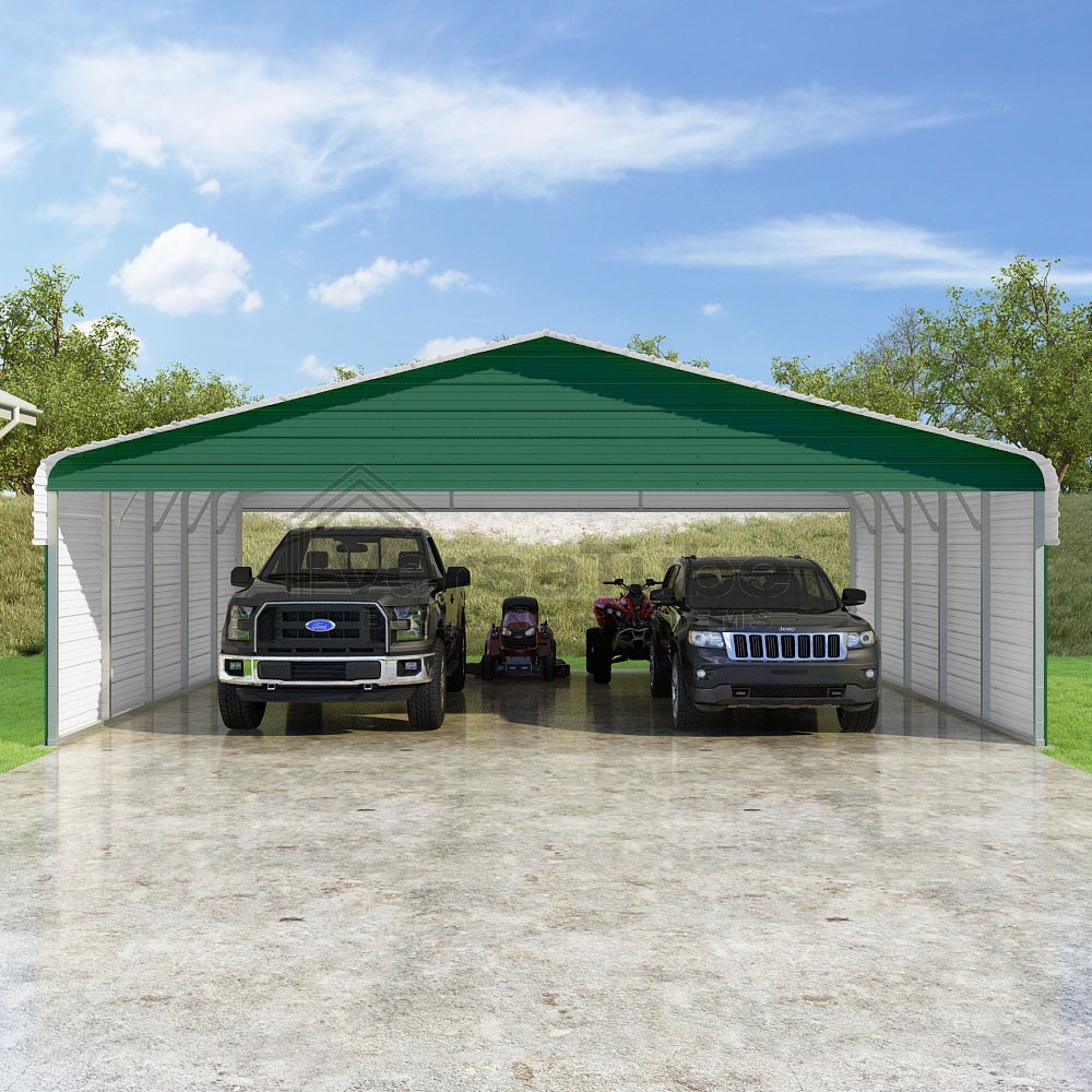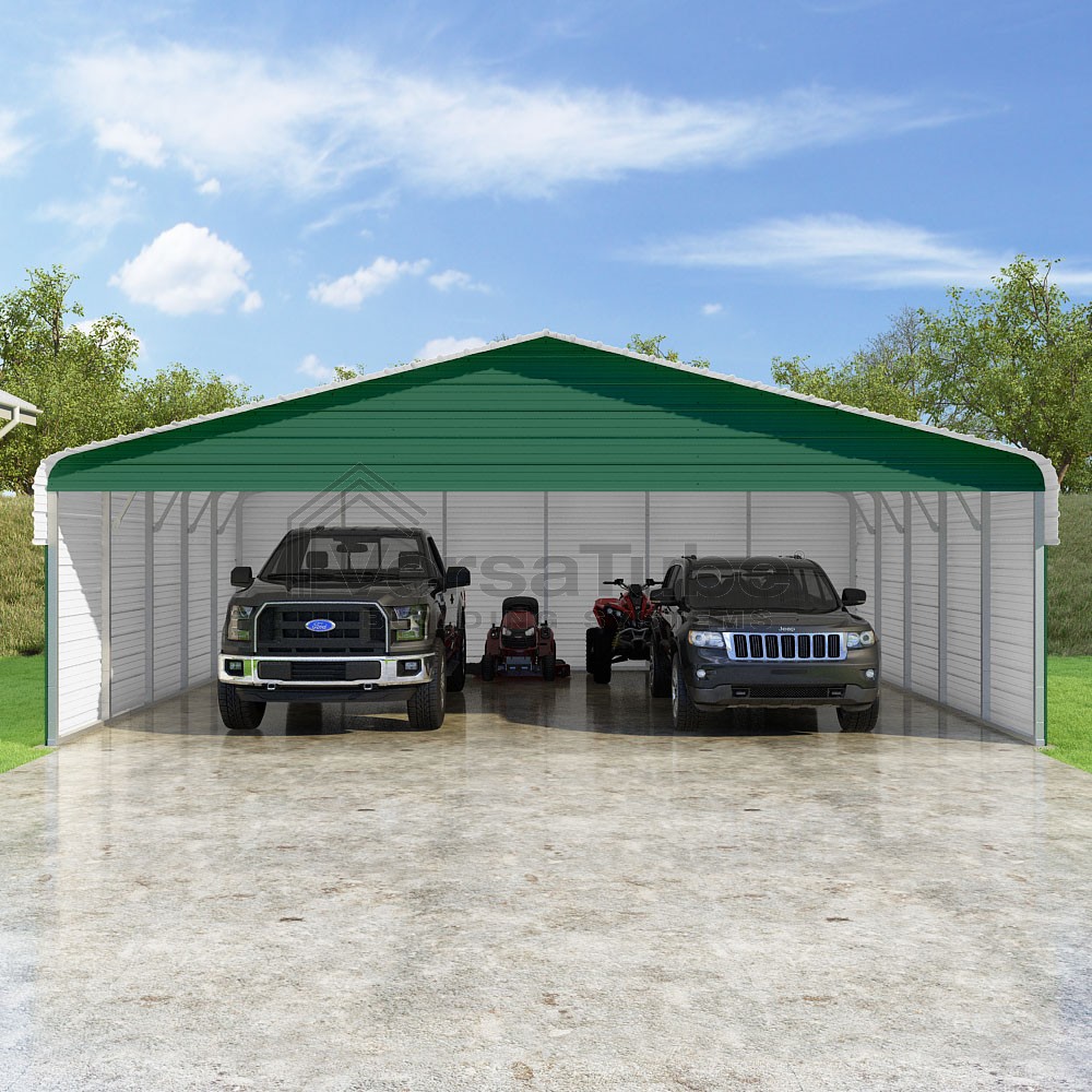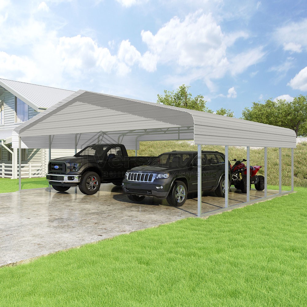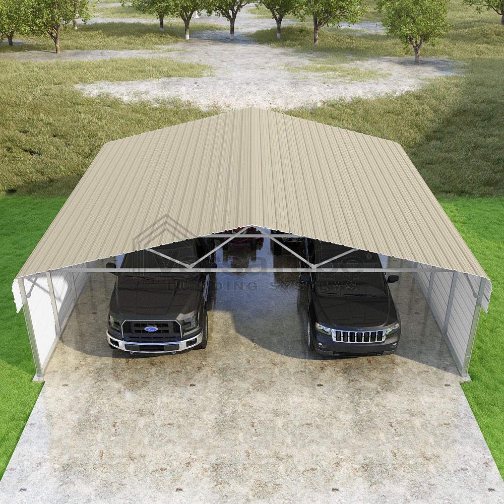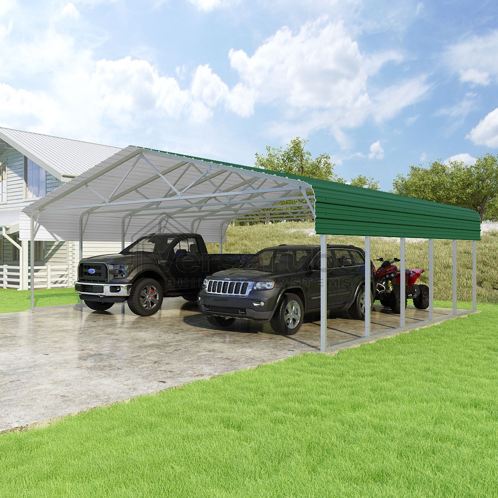 Classic Series DIY carport kit features horizontal application of sheet metal panels with the extra protection of rounded eaves.