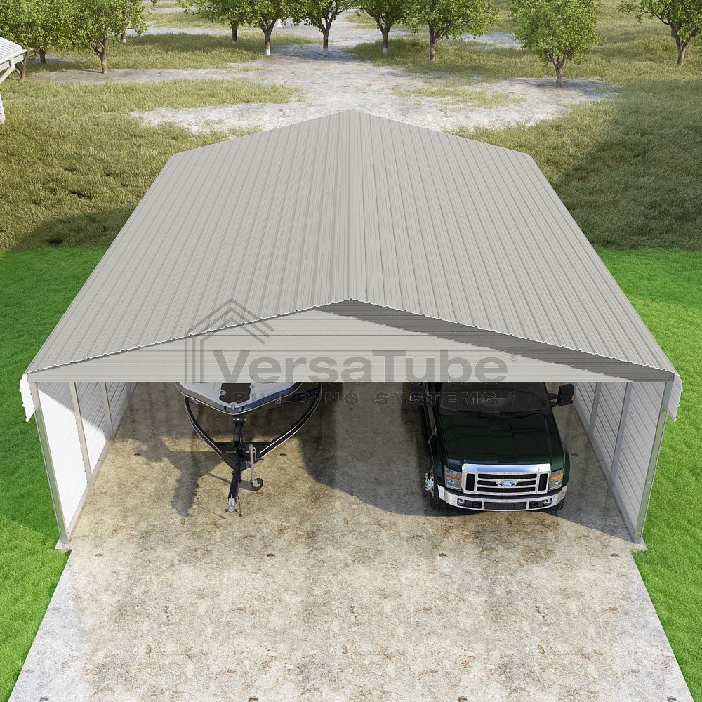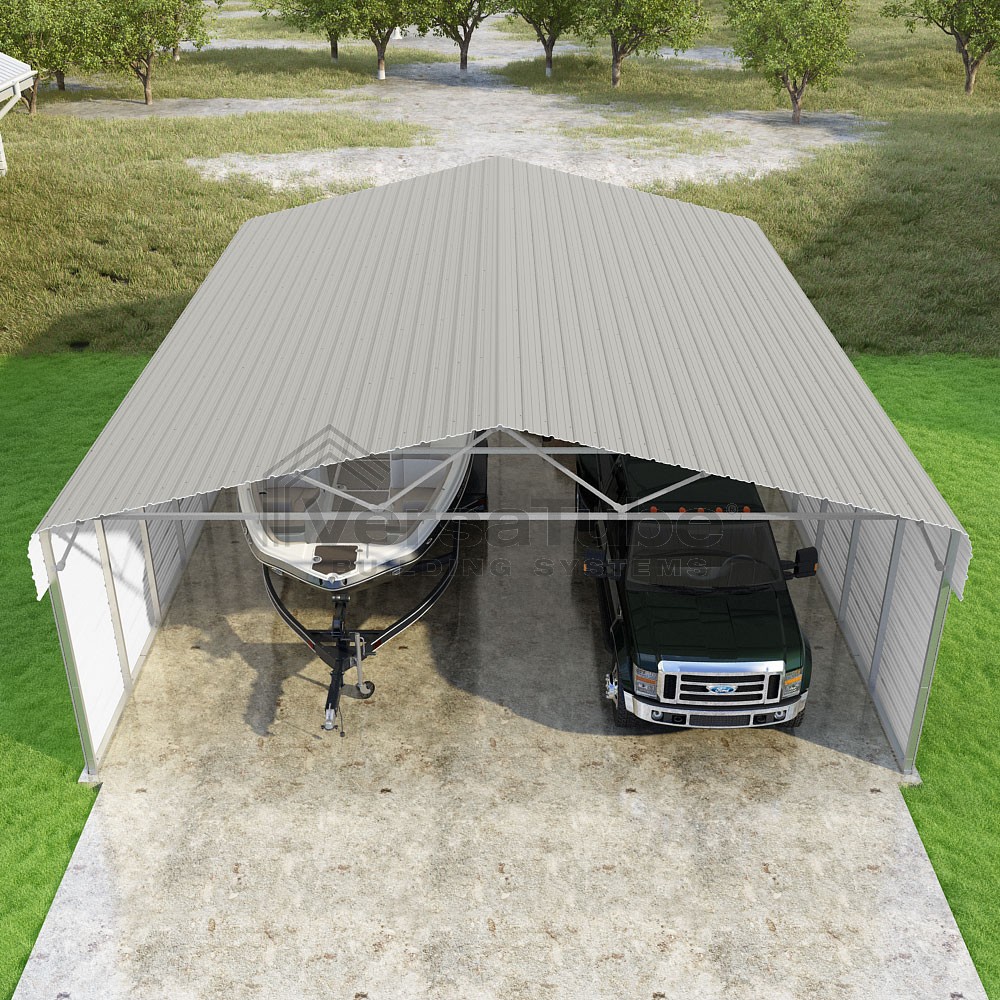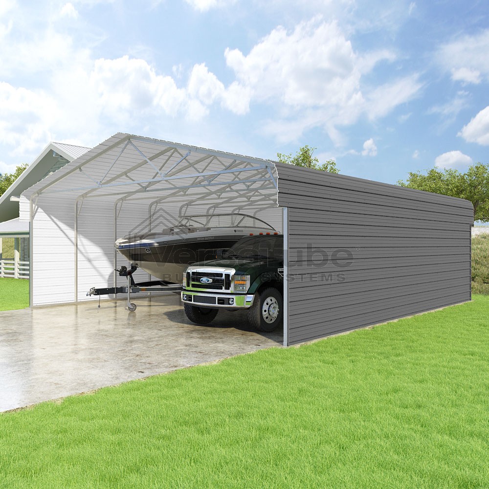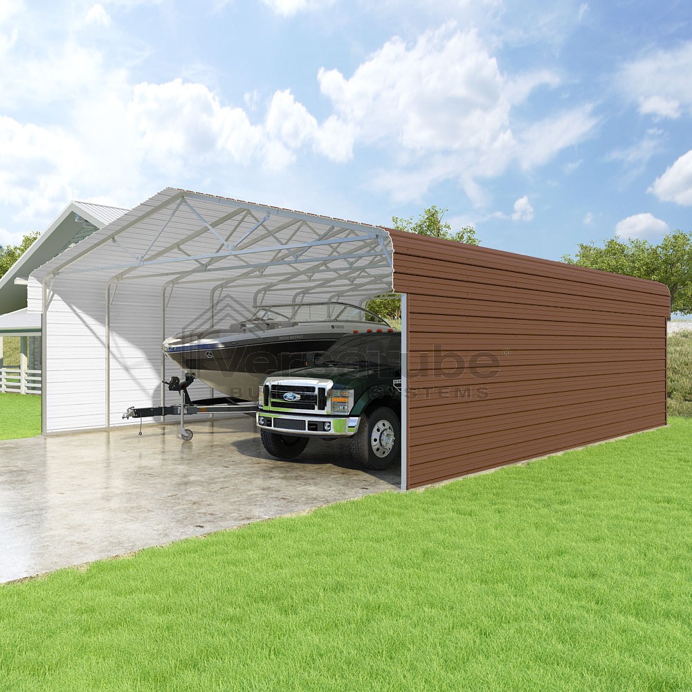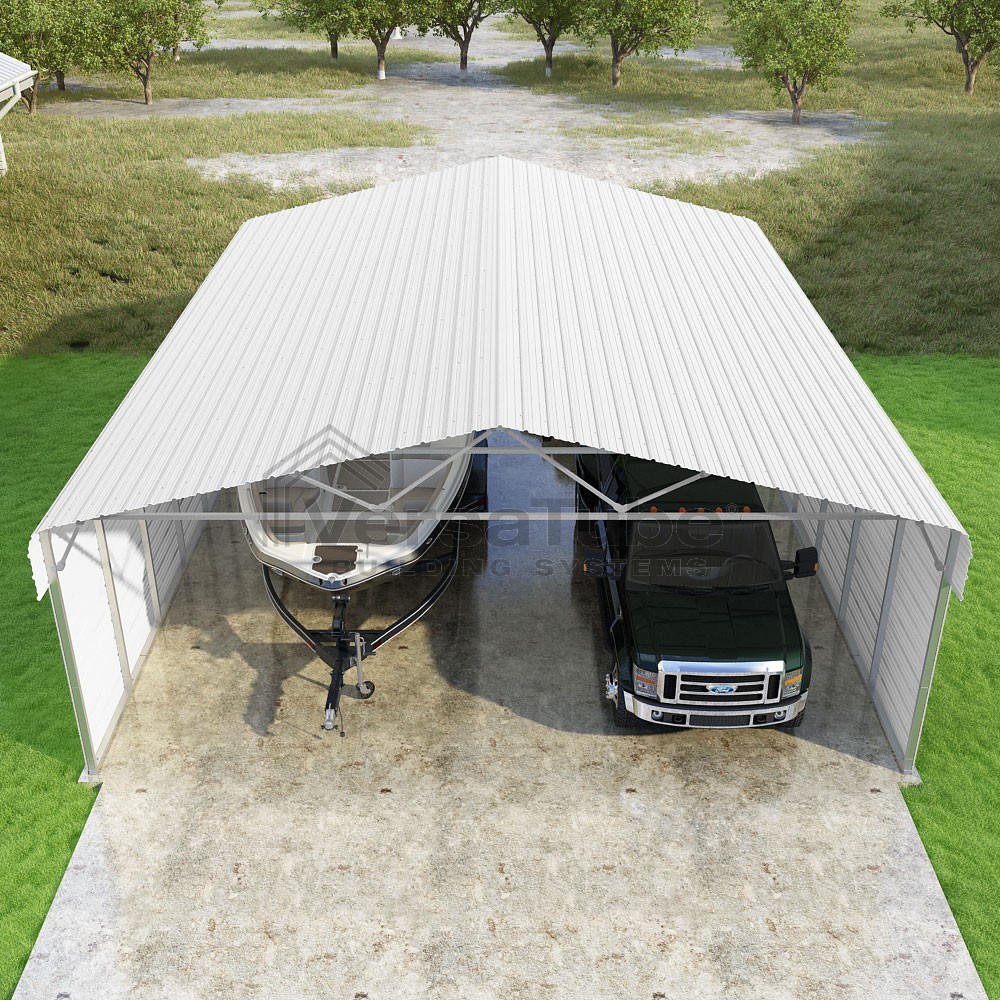 Classic Series DIY carport kit features horizontal application of sheet metal panels with the extra protection of rounded eaves.
