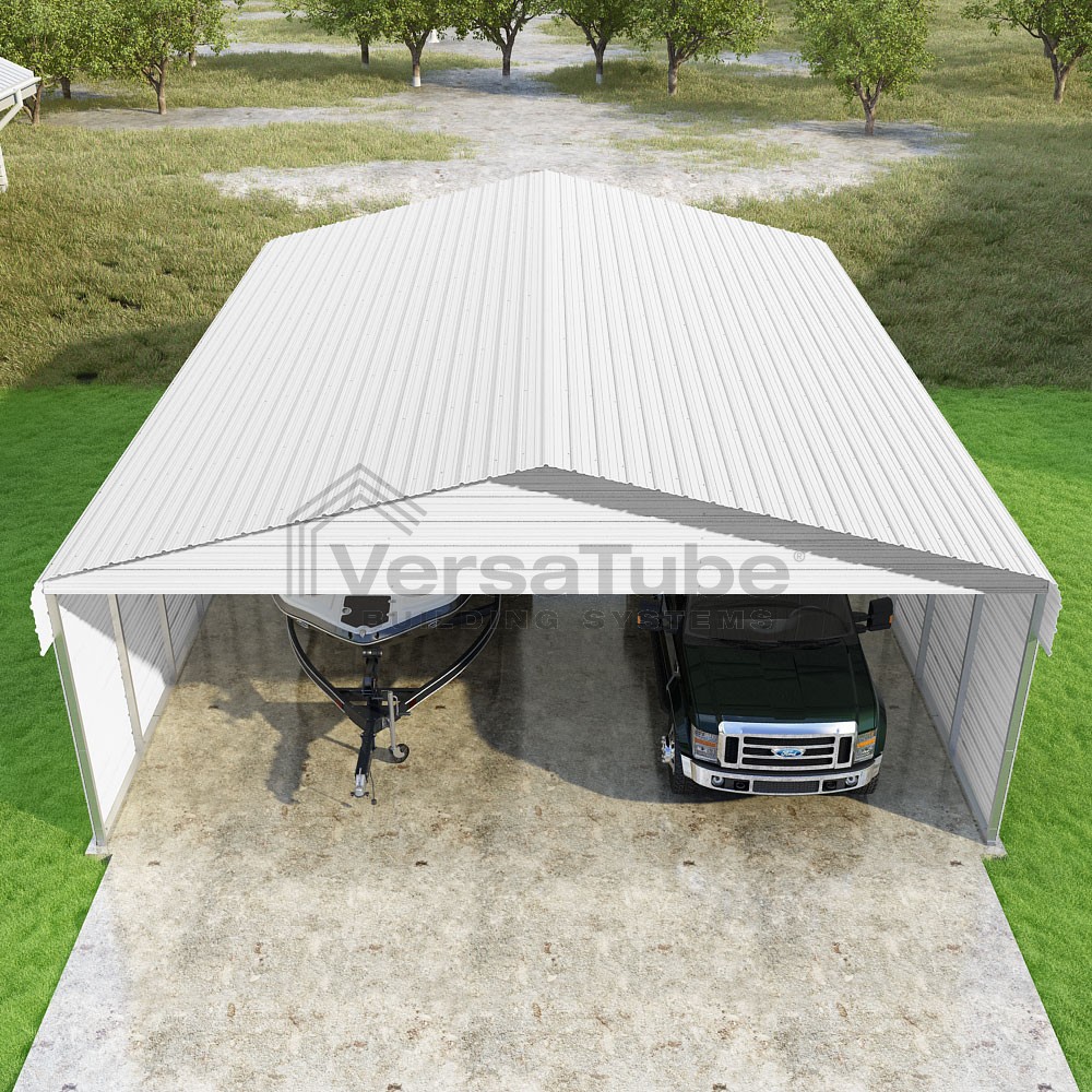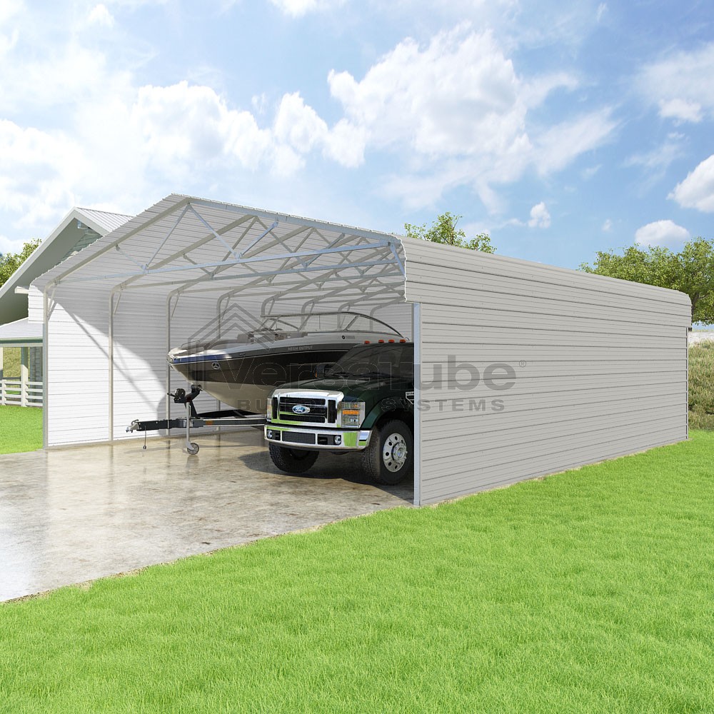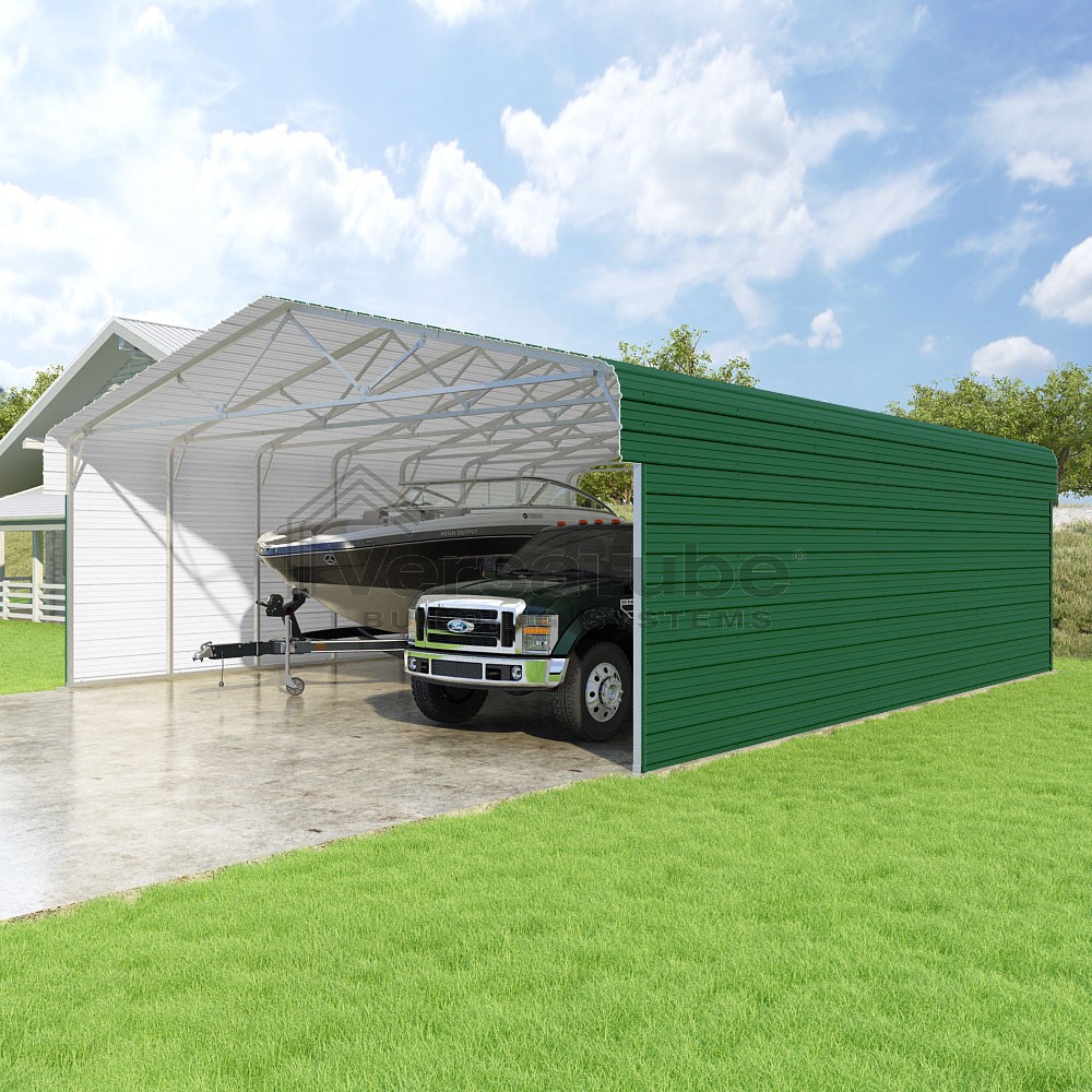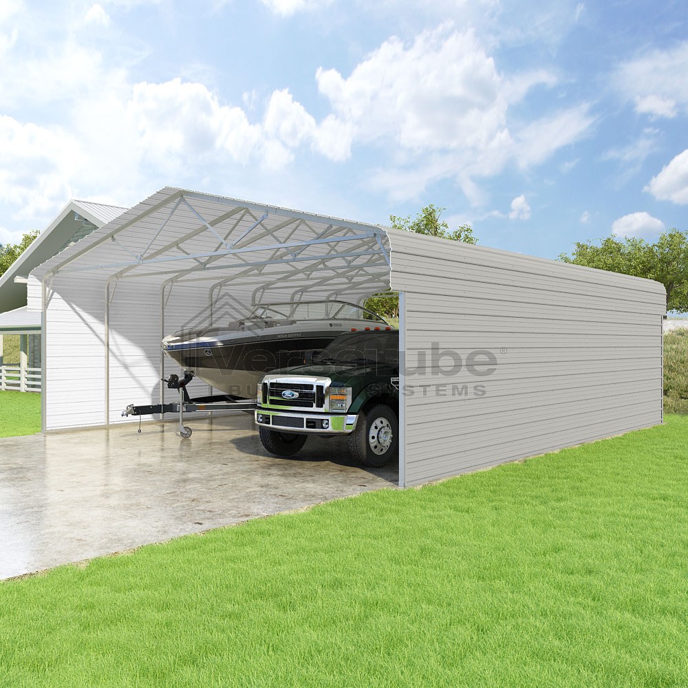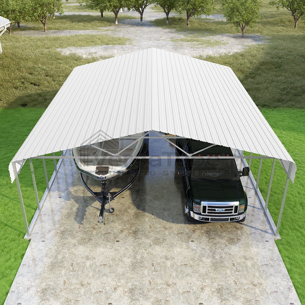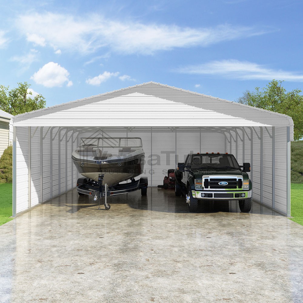 Classic Series DIY carport kit features horizontal application of sheet metal panels with the extra protection of rounded eaves.