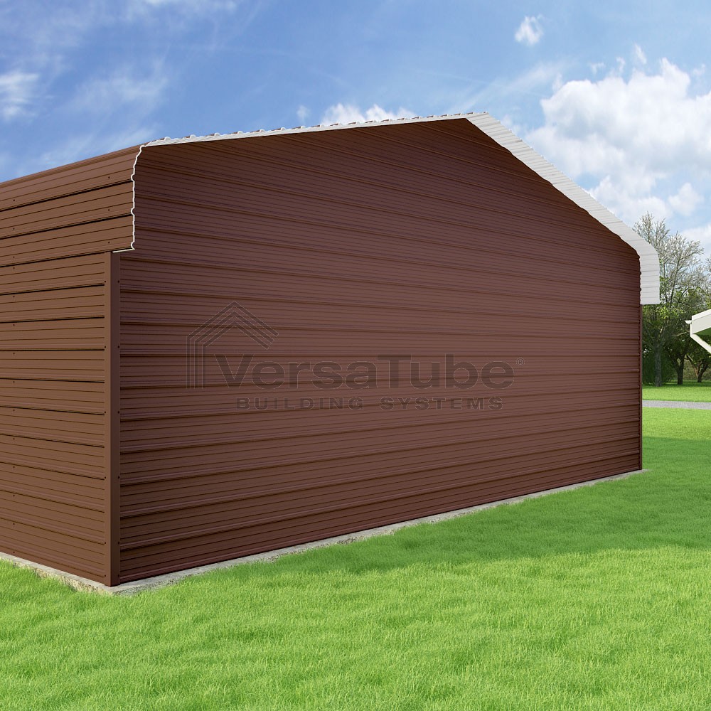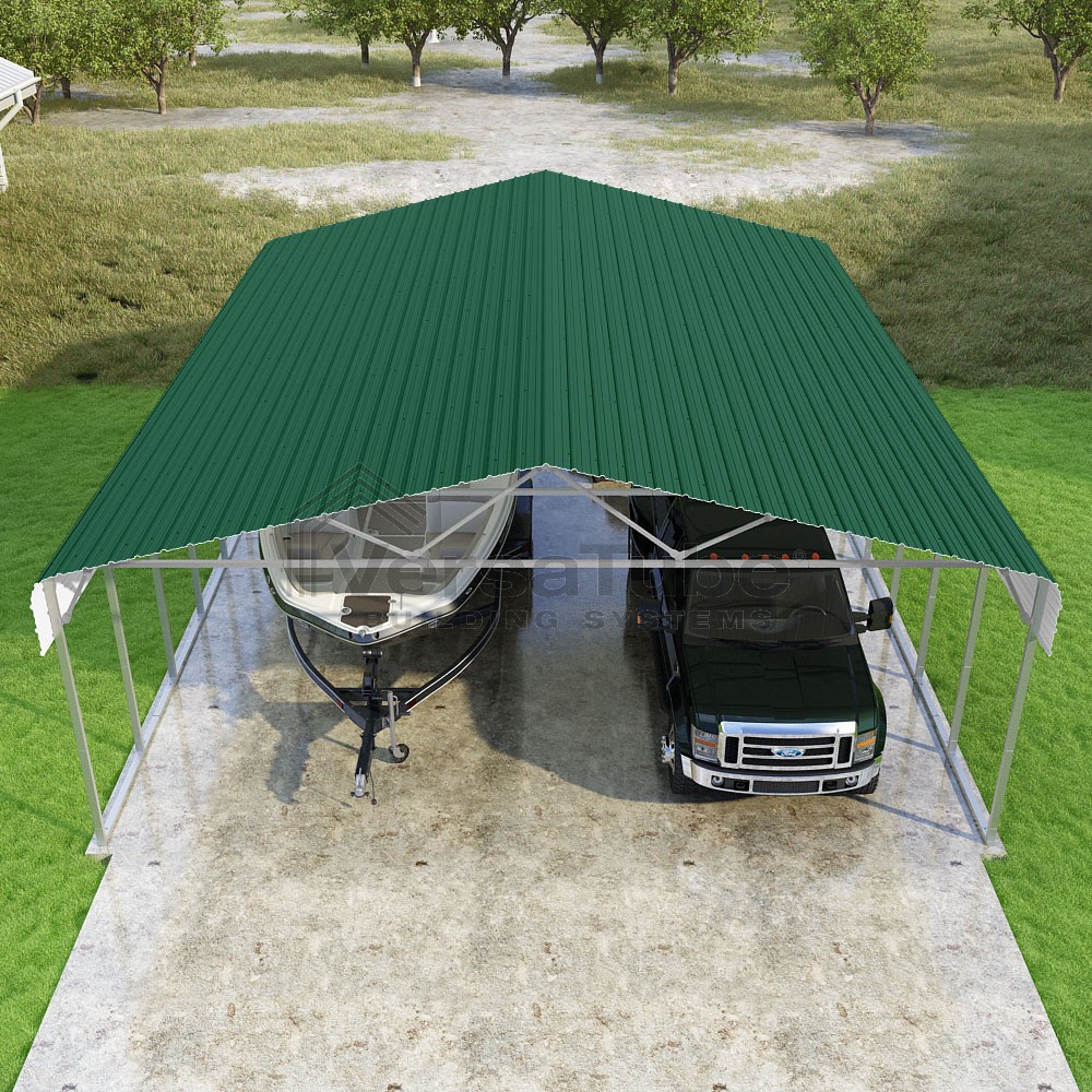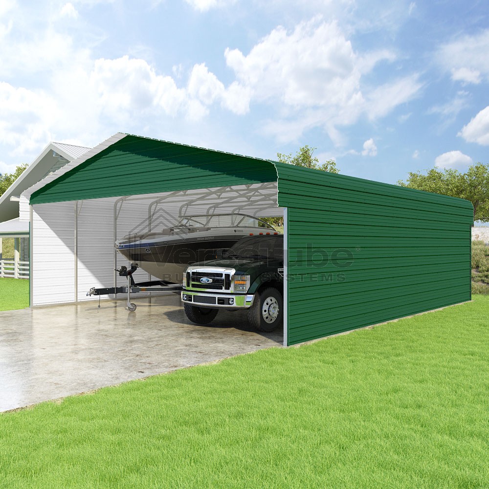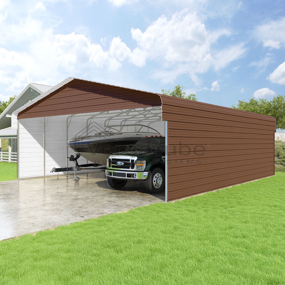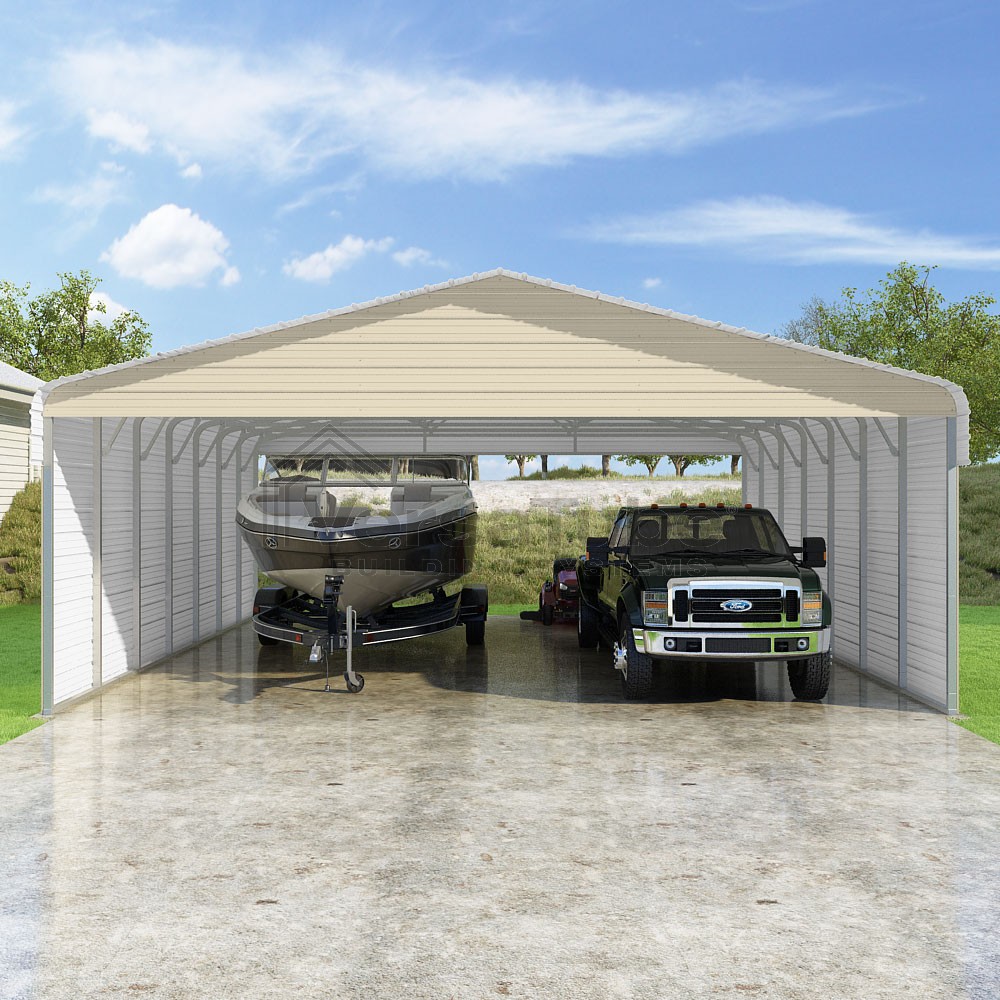 Classic Series DIY carport kit features horizontal application of sheet metal panels with the extra protection of rounded eaves.