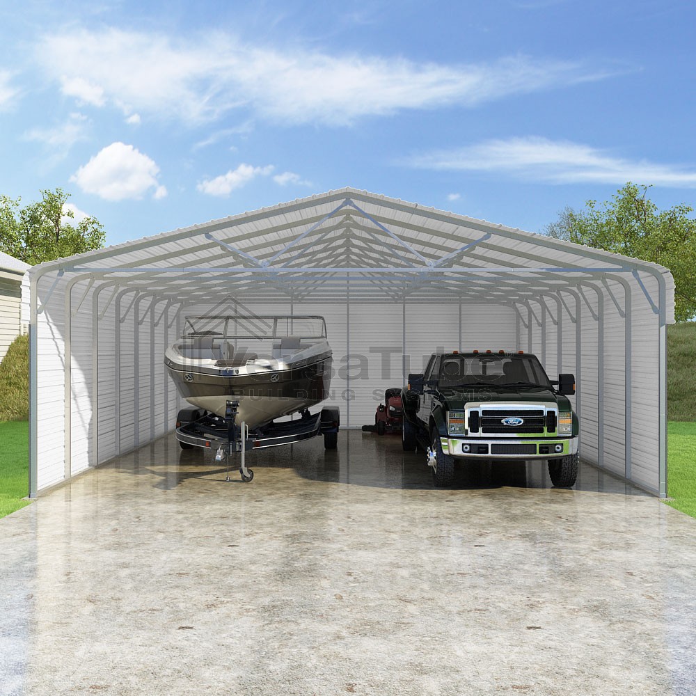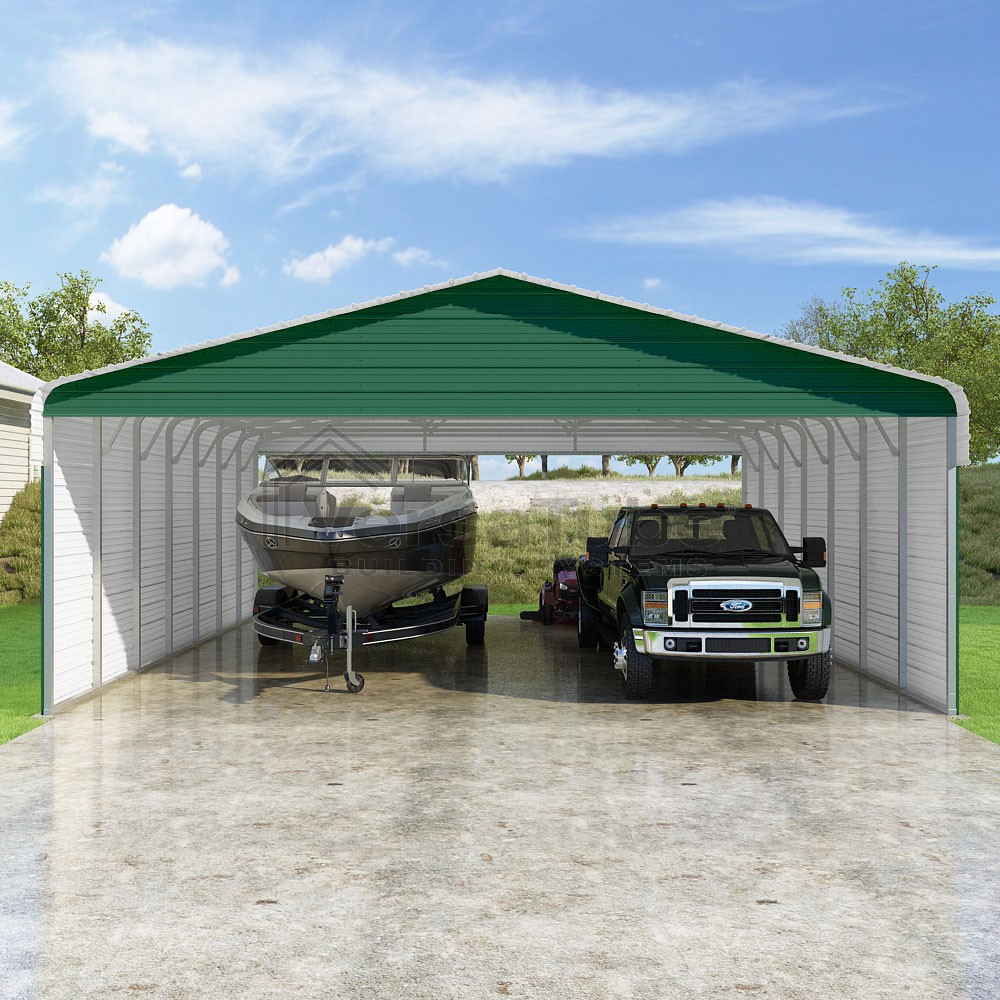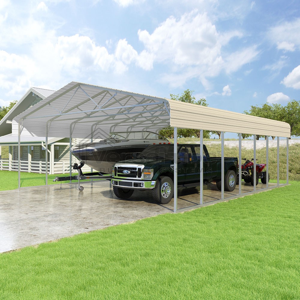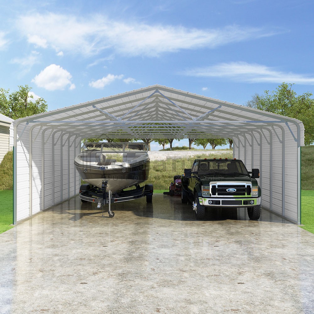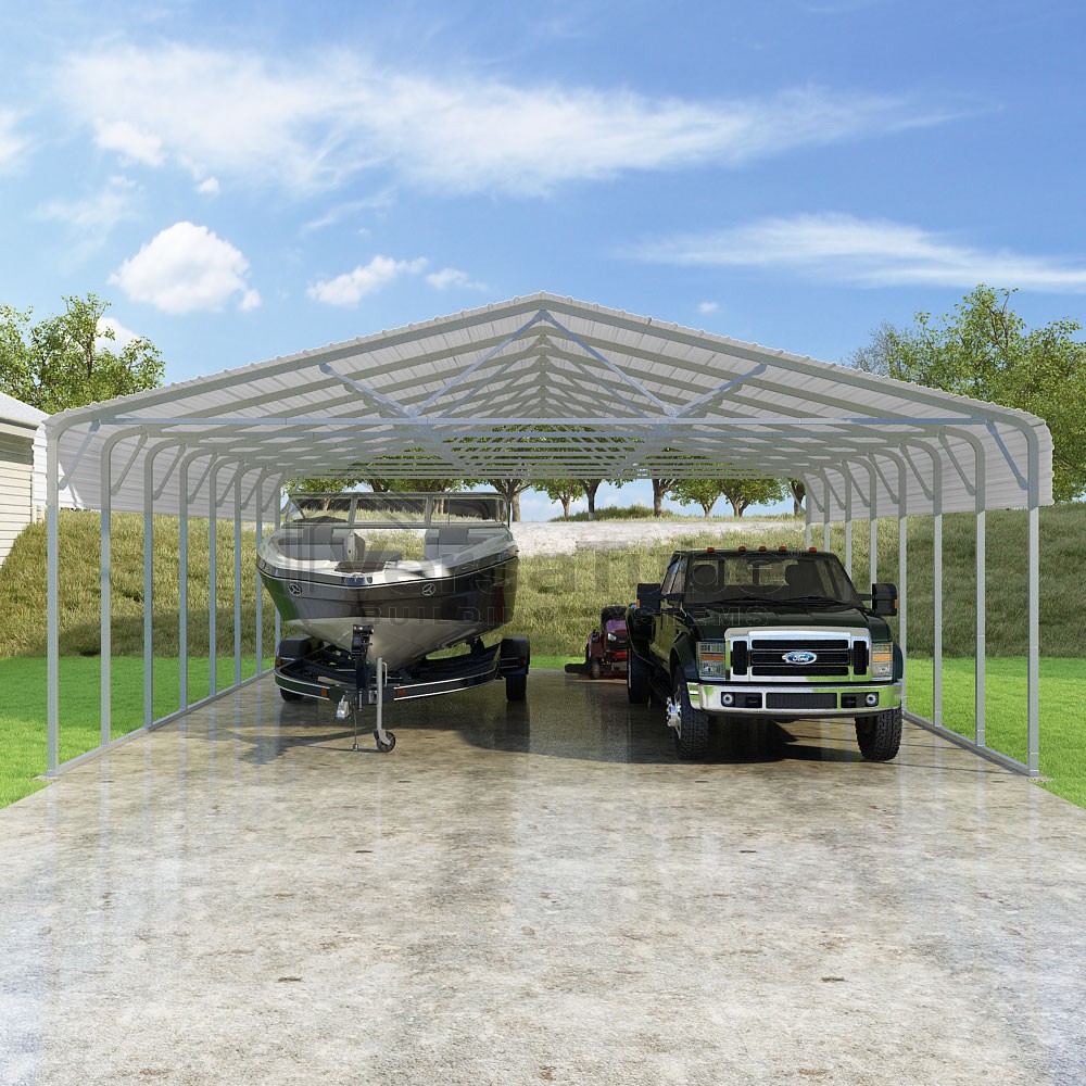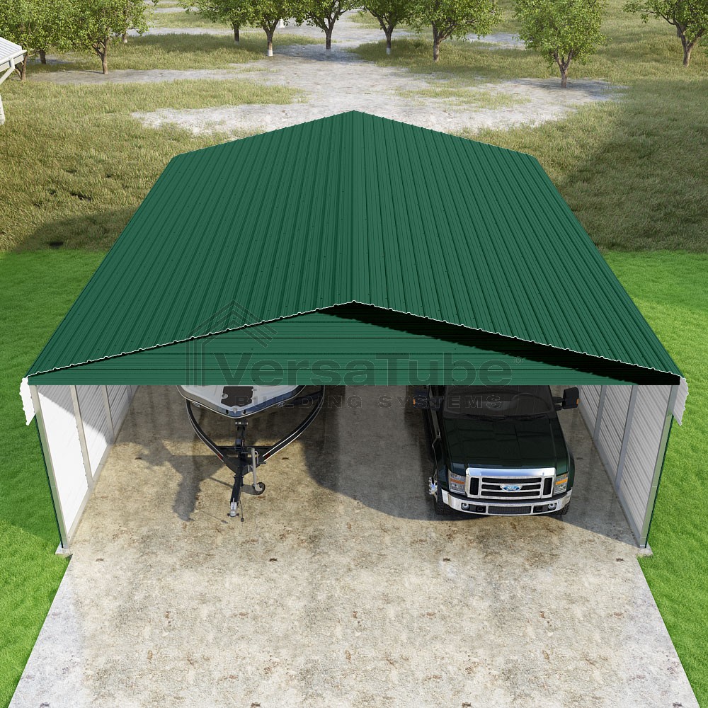 Classic Series DIY carport kit features horizontal application of sheet metal panels with the extra protection of rounded eaves.