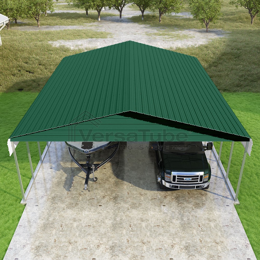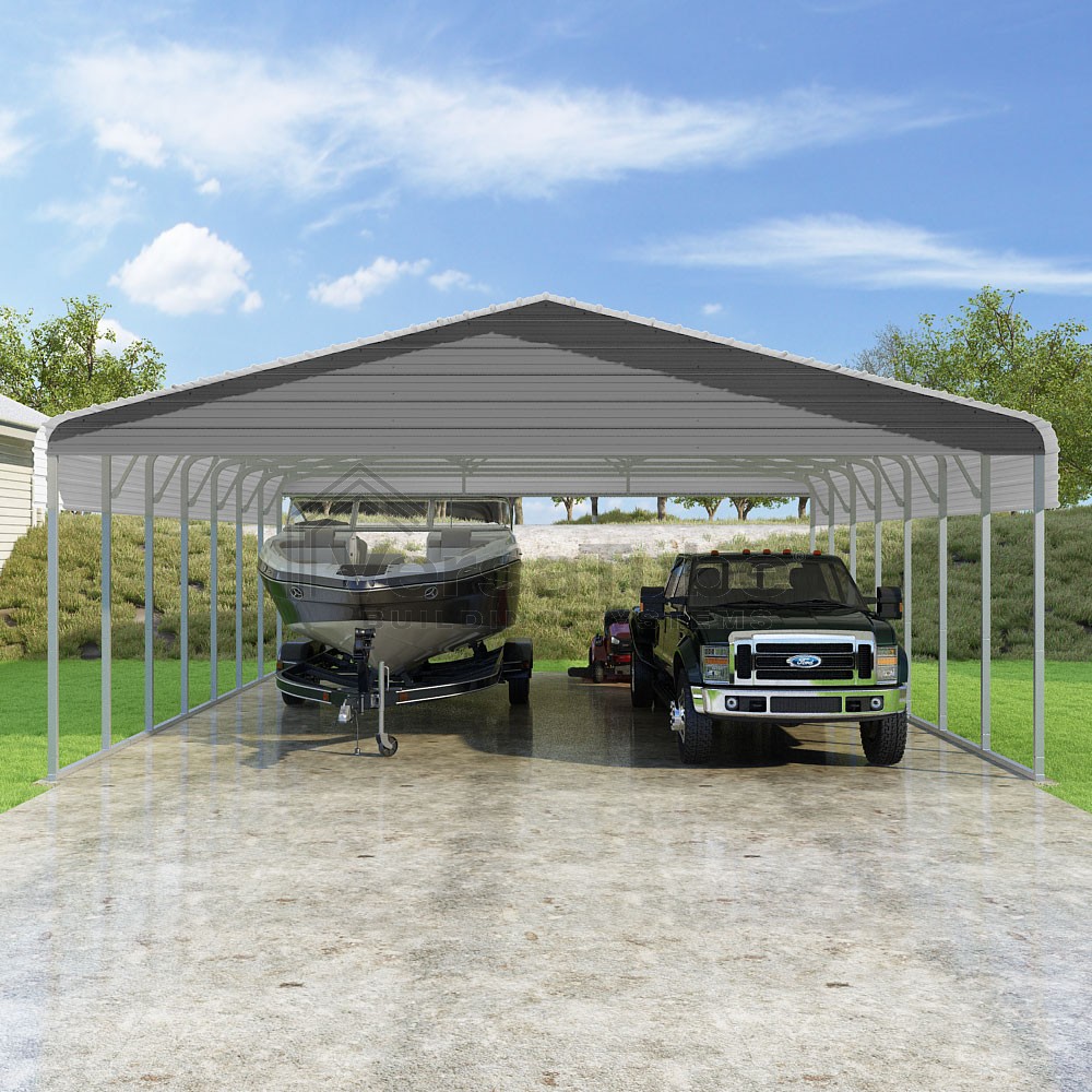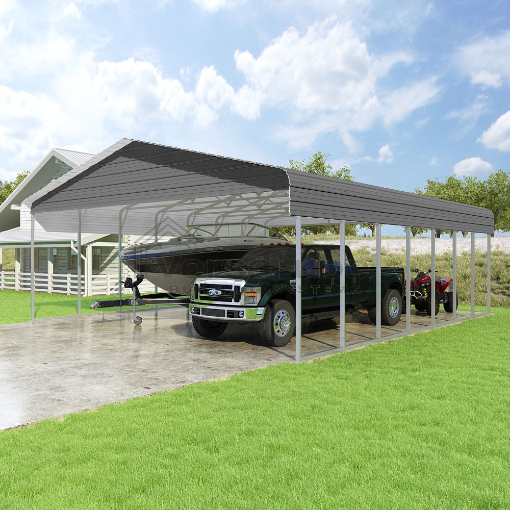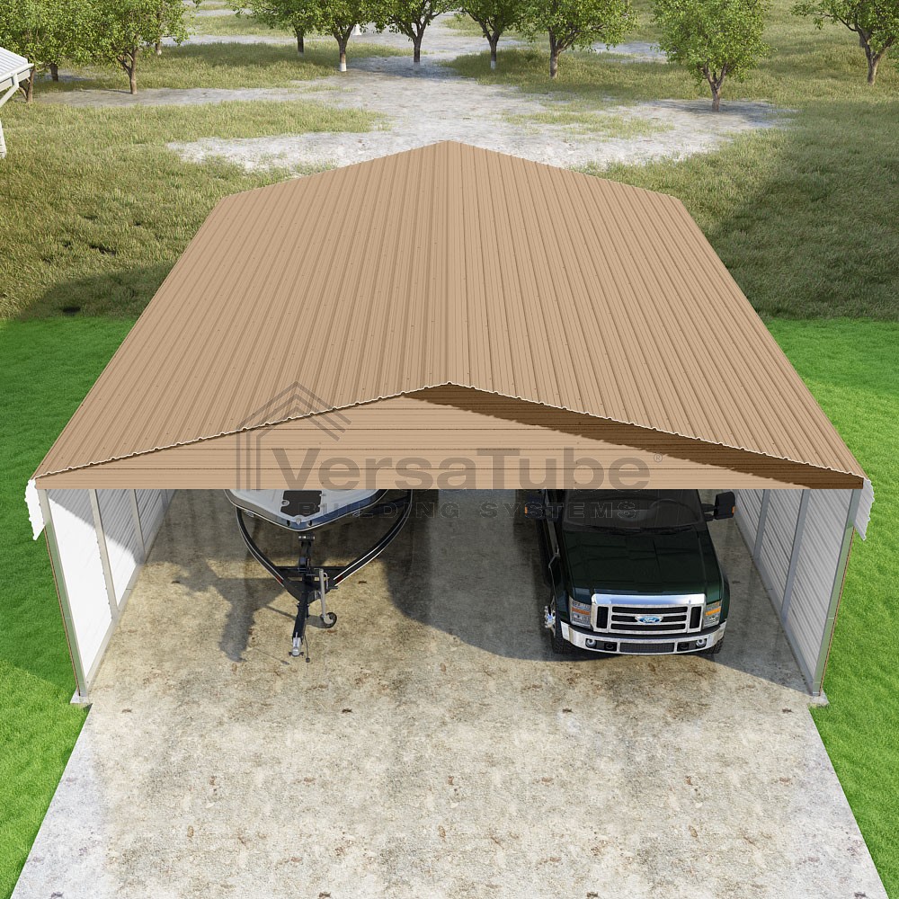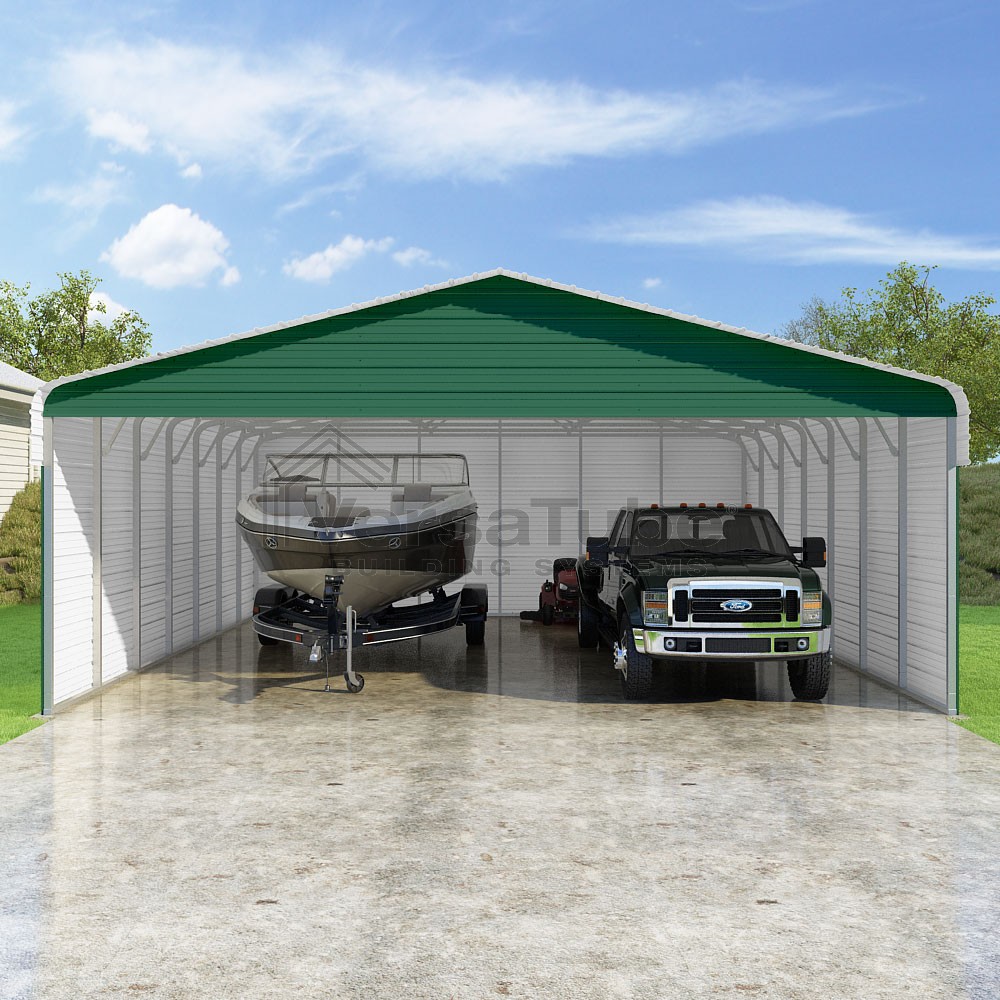 Classic Series DIY carport kit features horizontal application of sheet metal panels with the extra protection of rounded eaves.