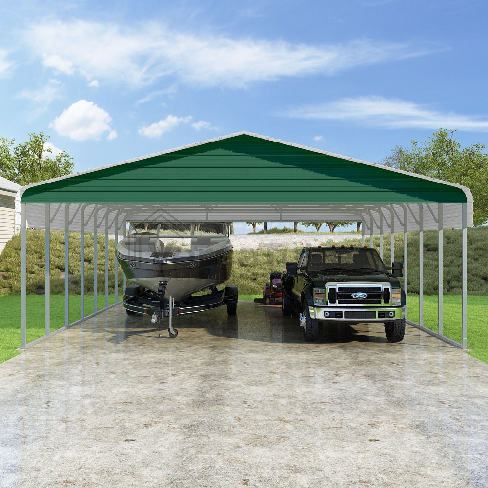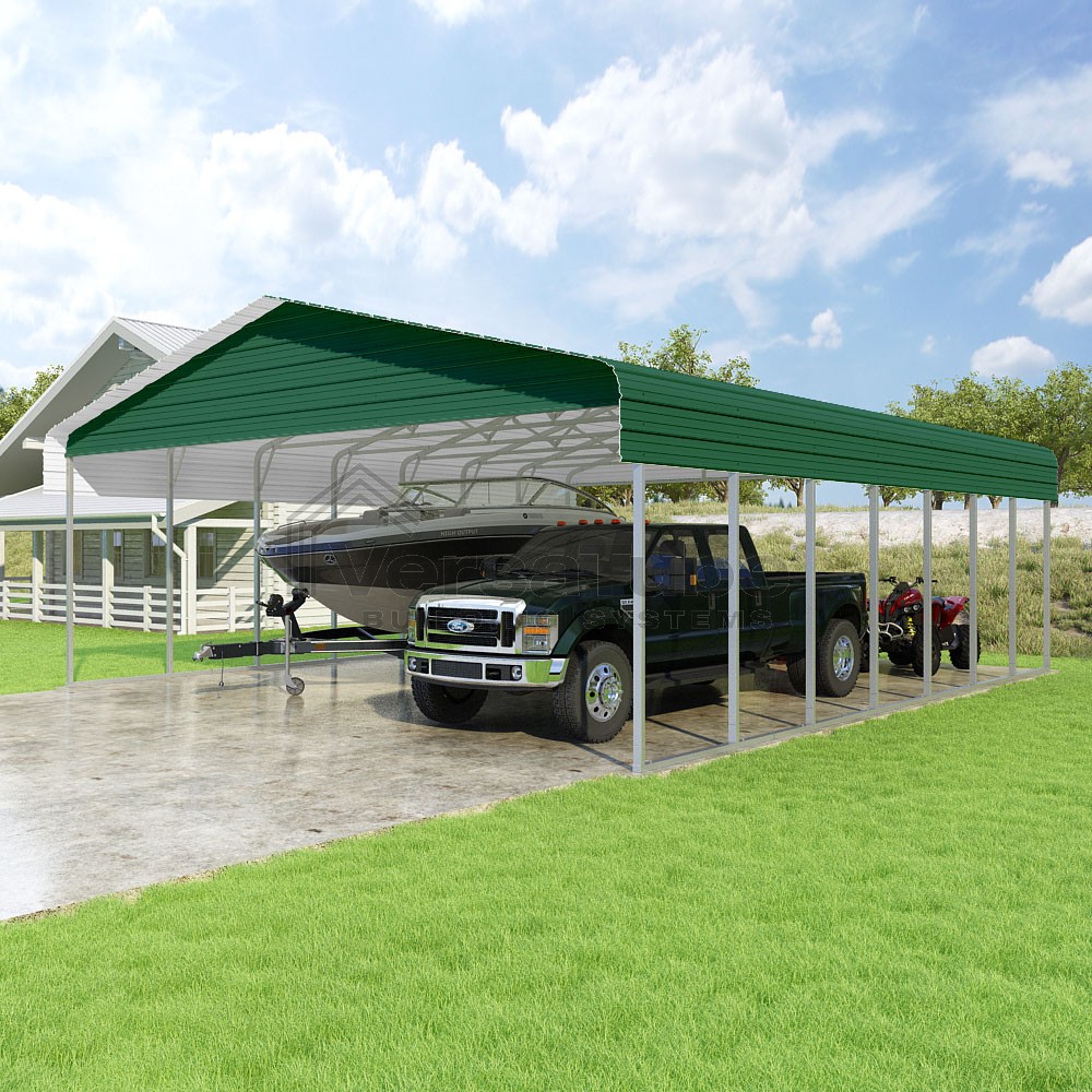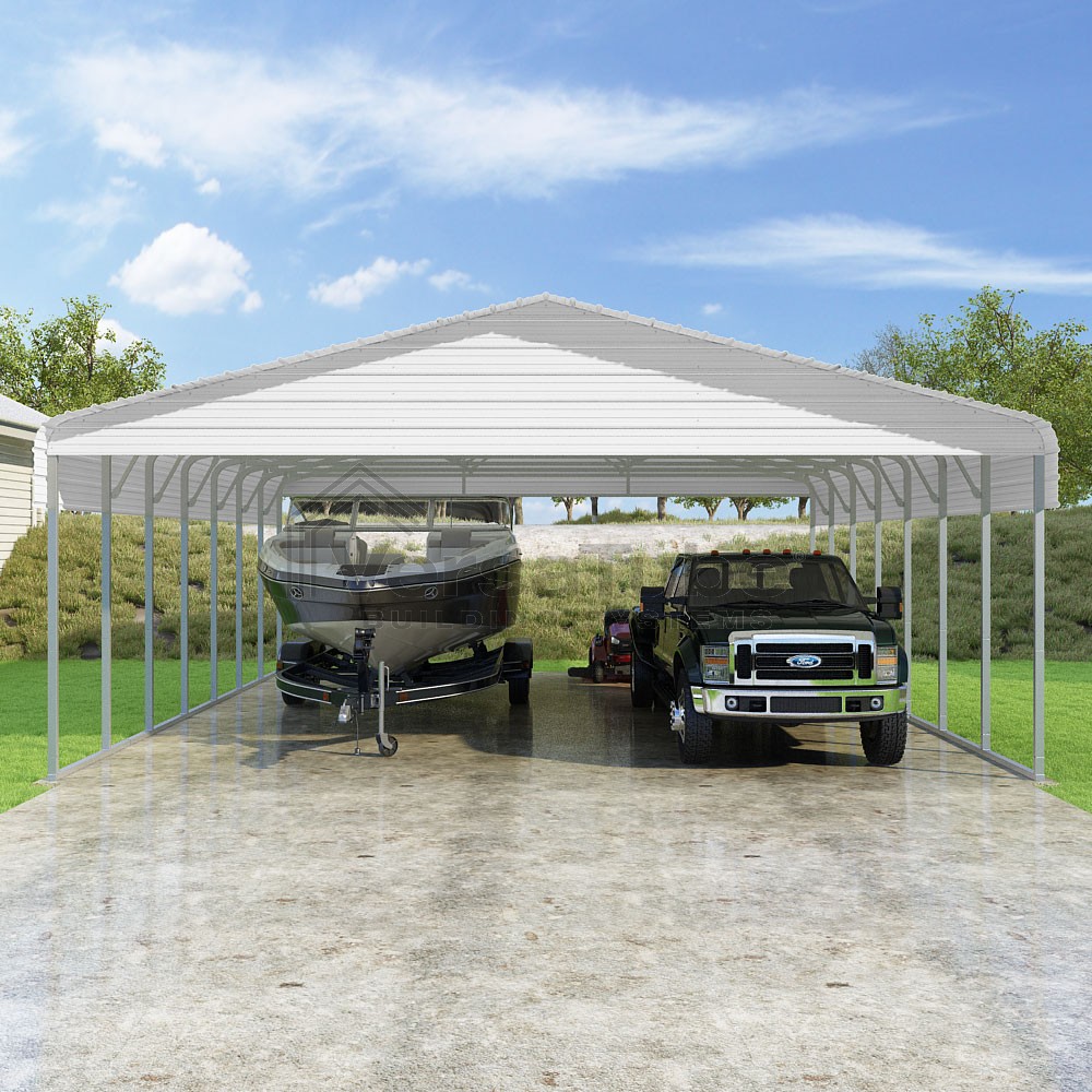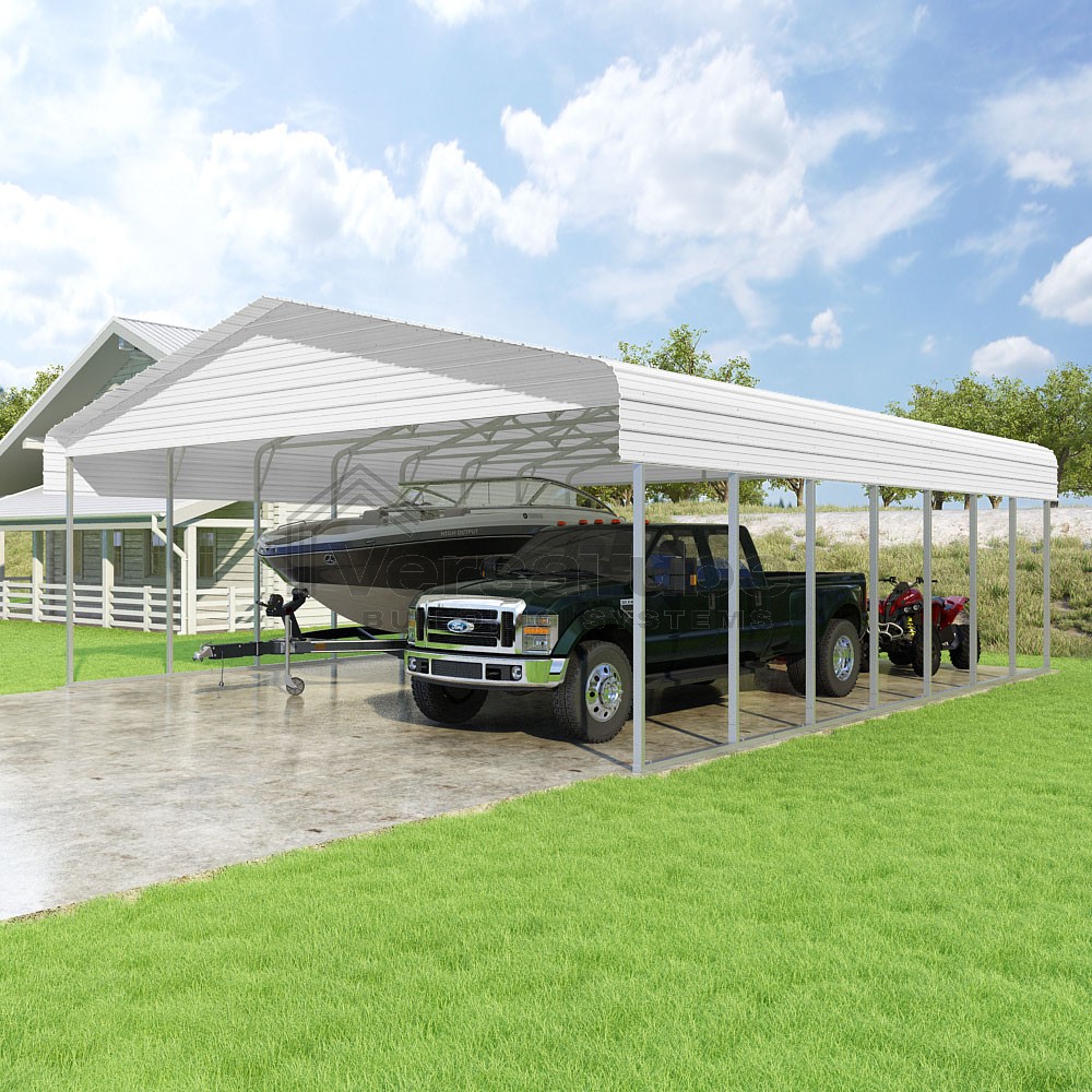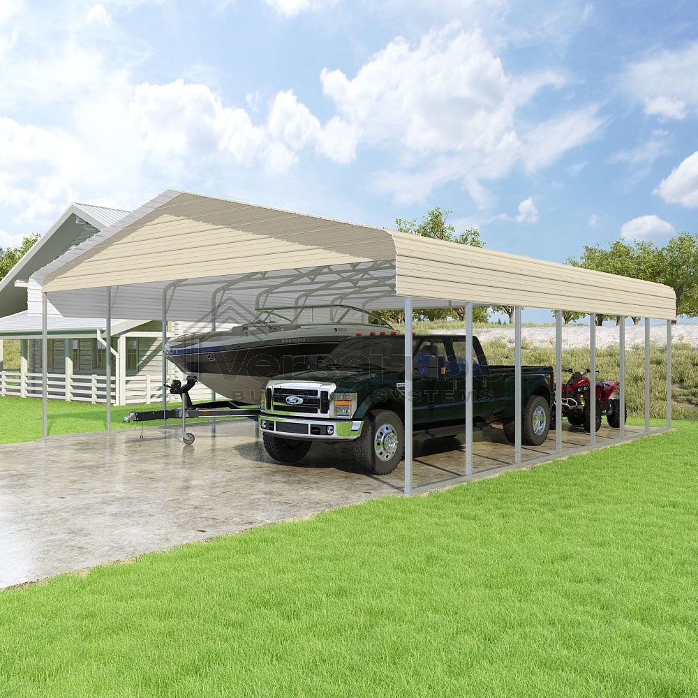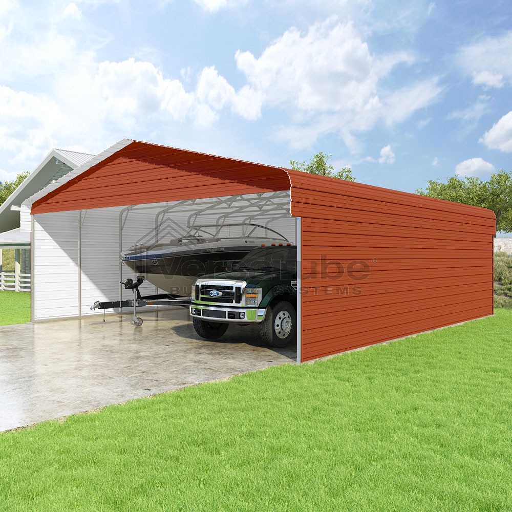 Classic Series DIY carport kit features horizontal application of sheet metal panels with the extra protection of rounded eaves.
