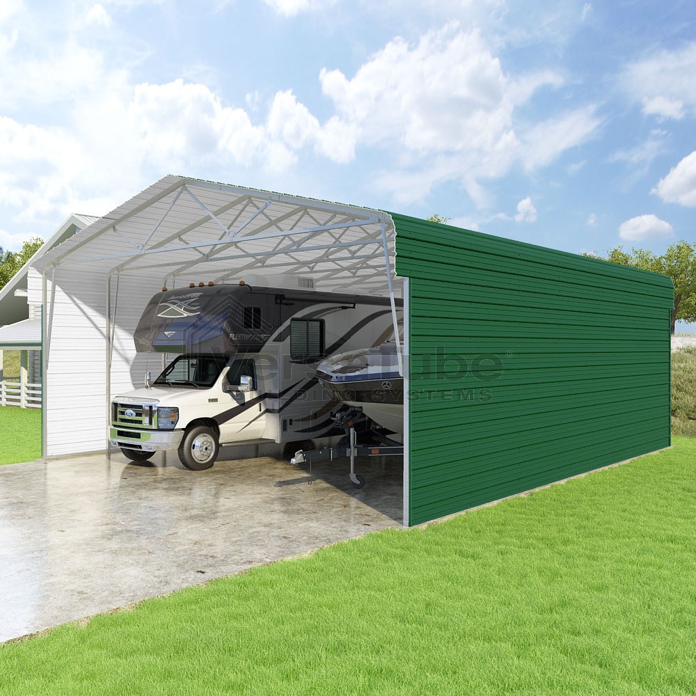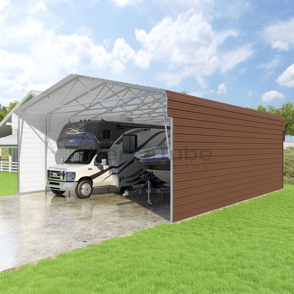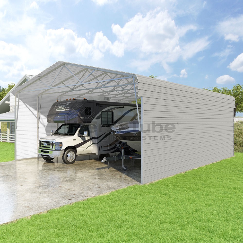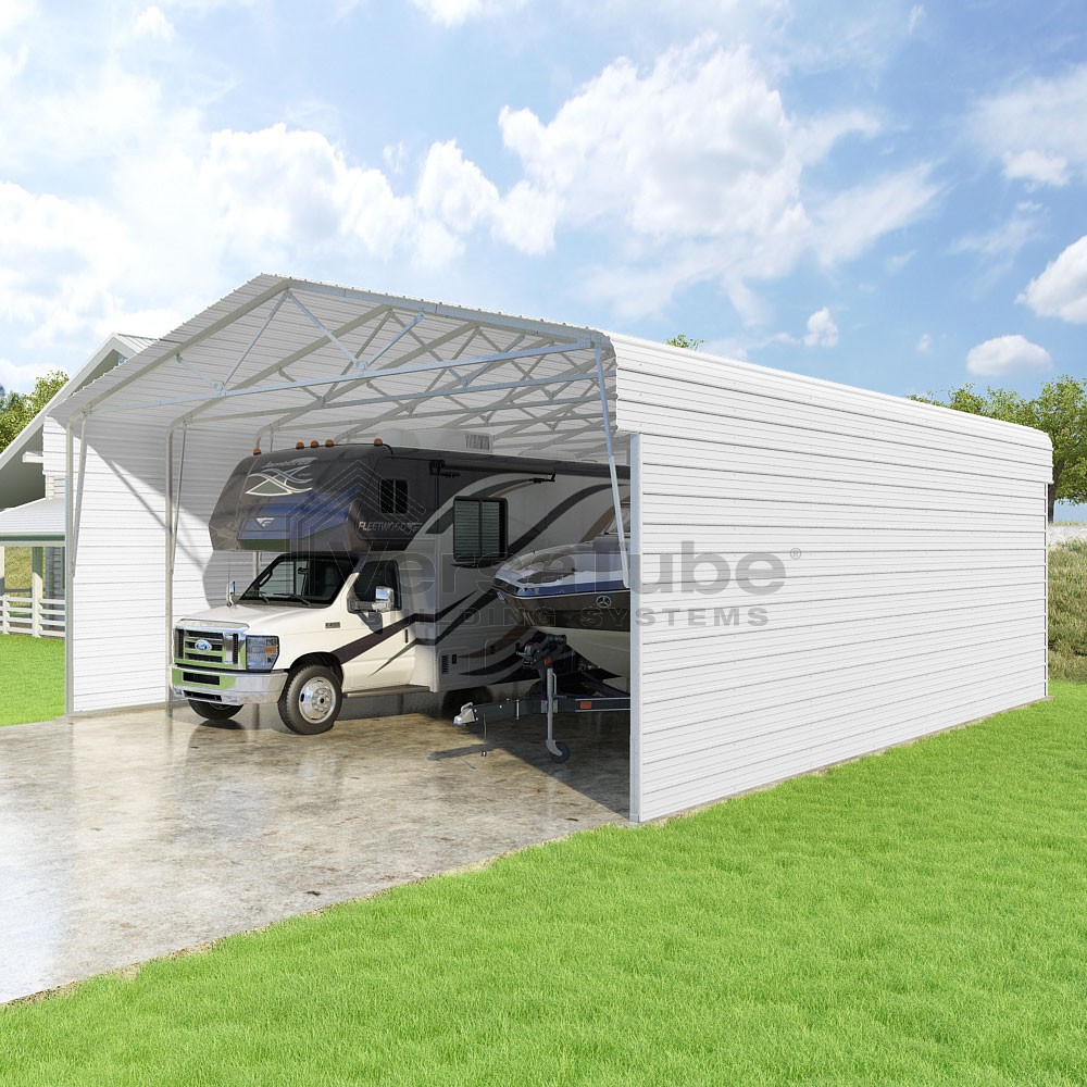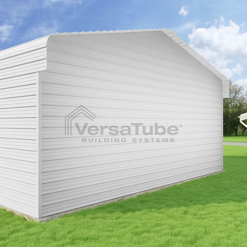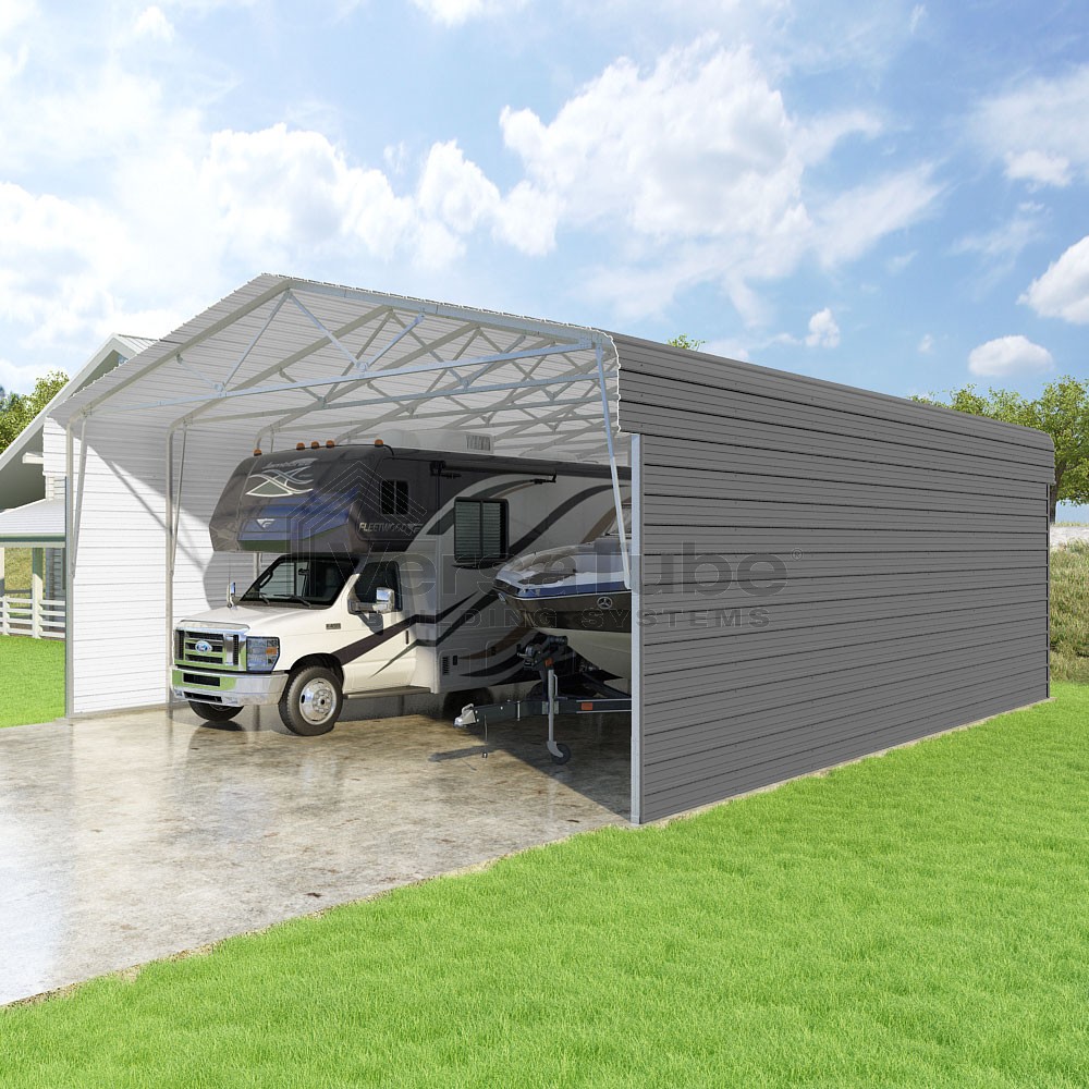 Classic Series DIY carport kit features horizontal application of sheet metal panels with the extra protection of rounded eaves.