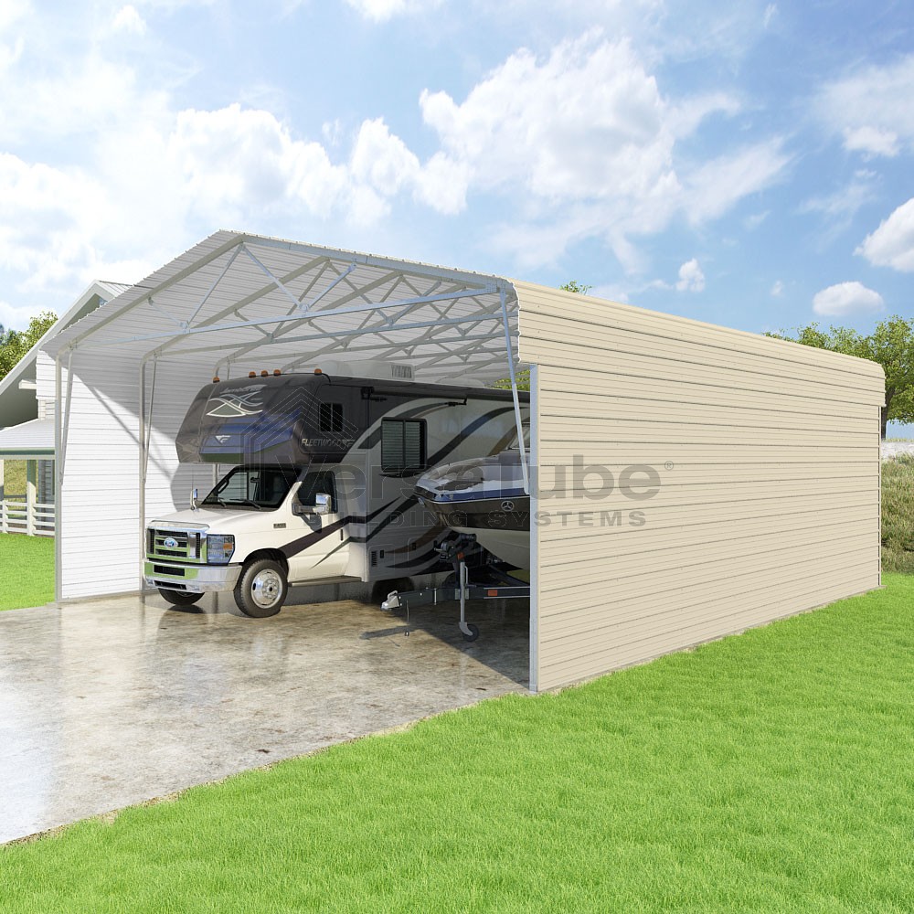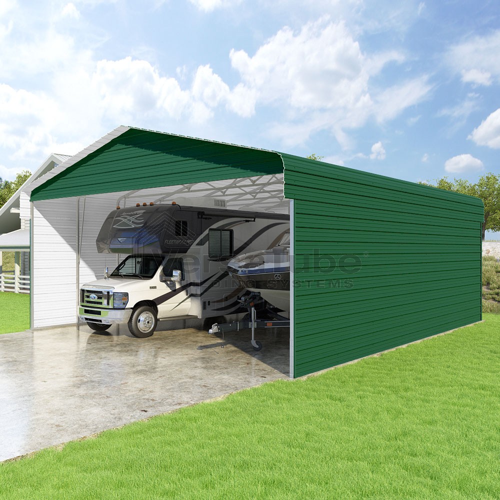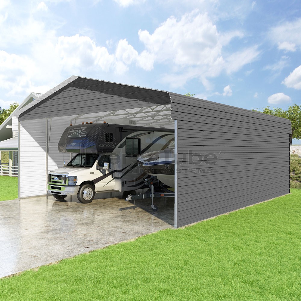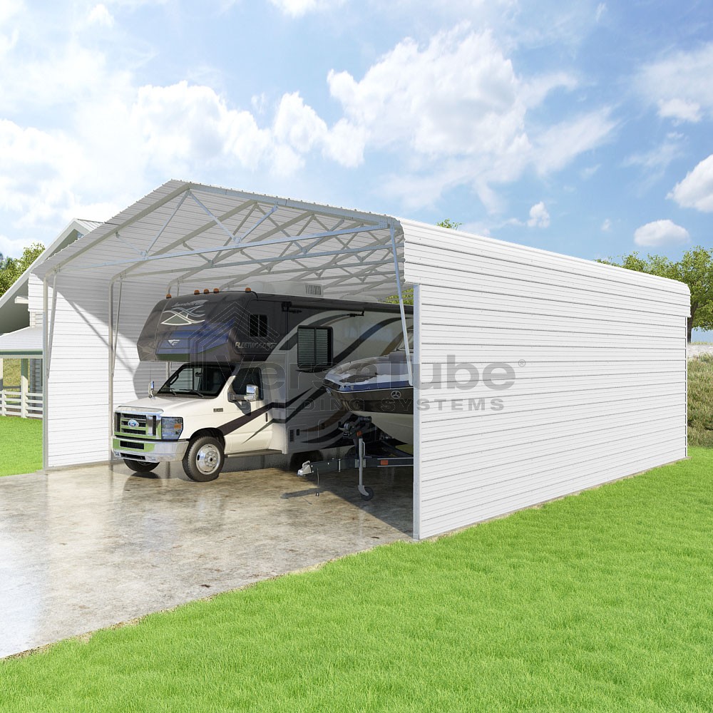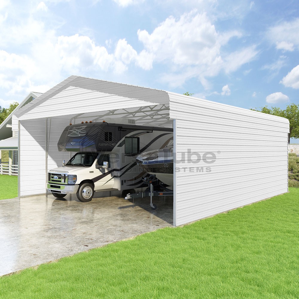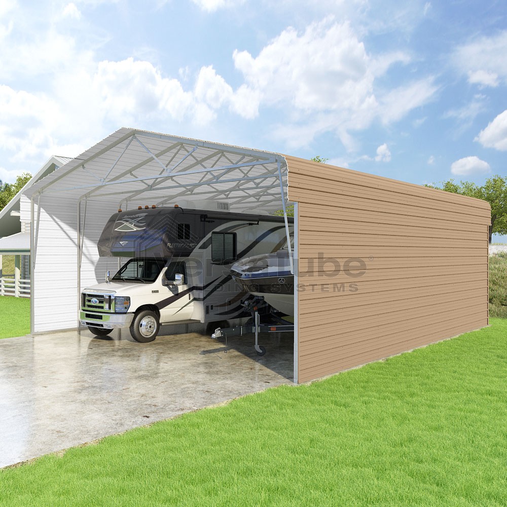 Classic Series DIY carport kit features horizontal application of sheet metal panels with the extra protection of rounded eaves.