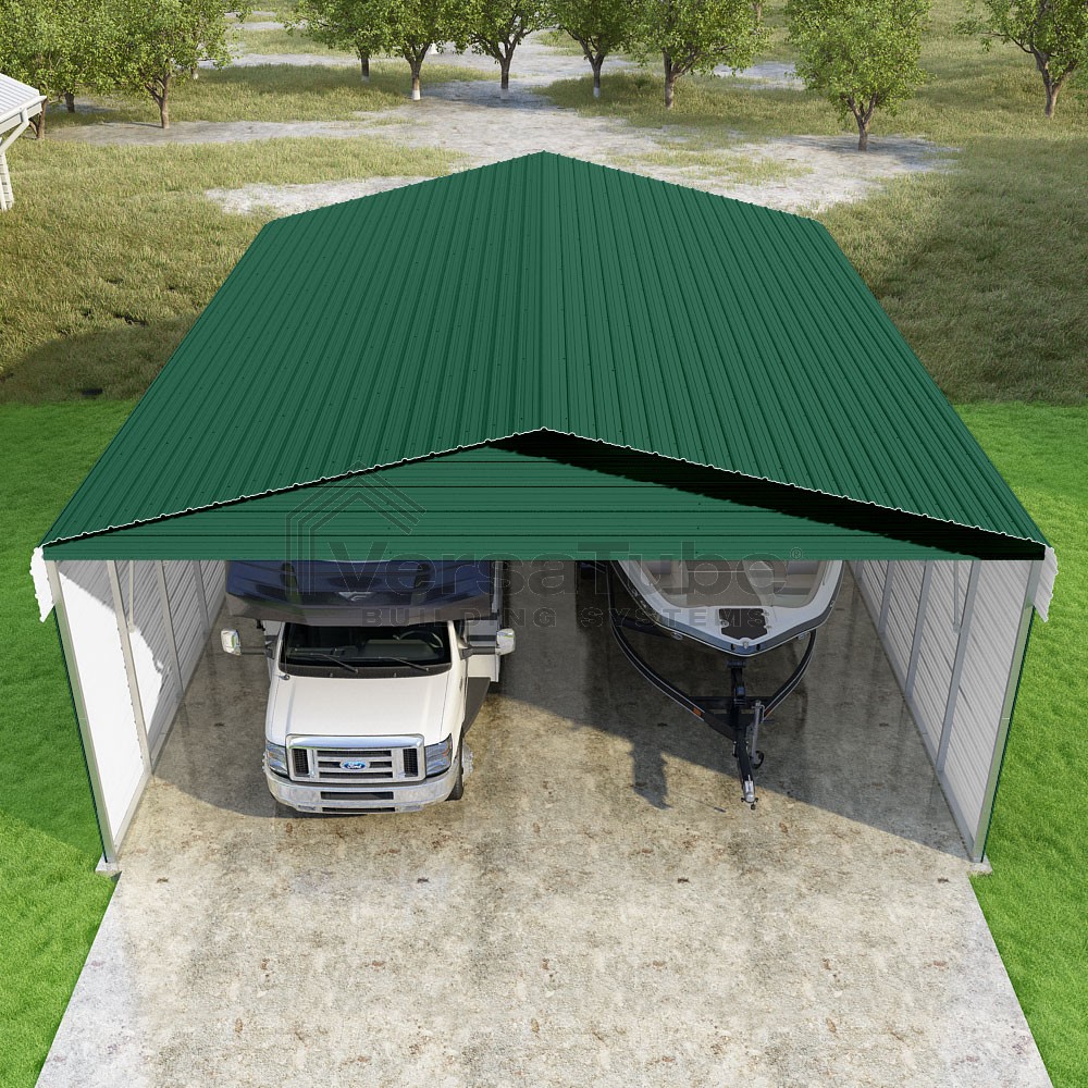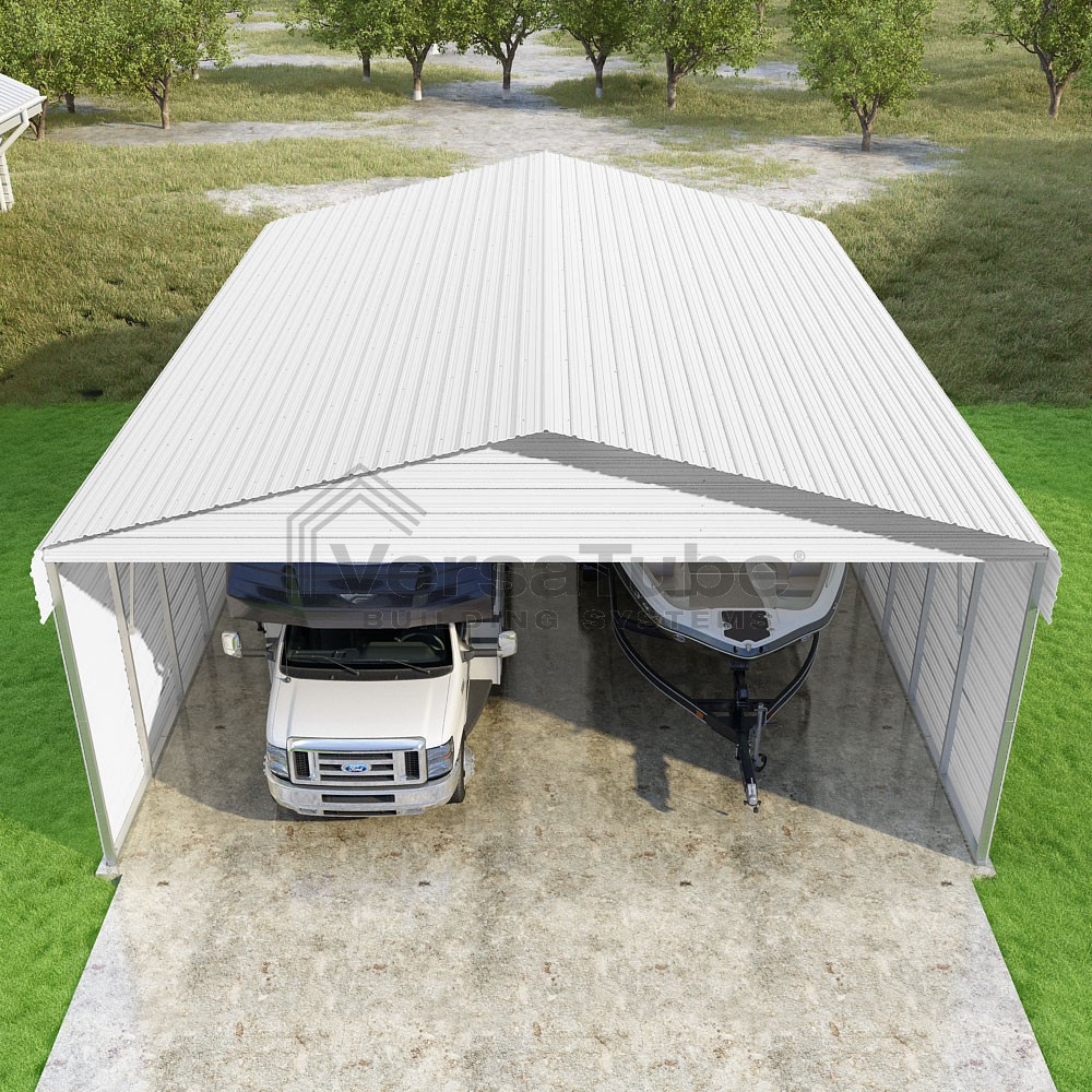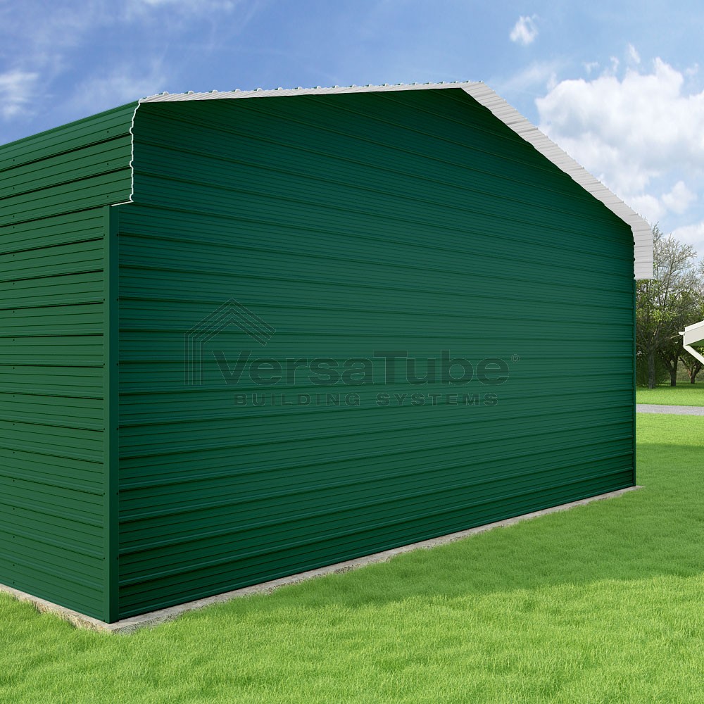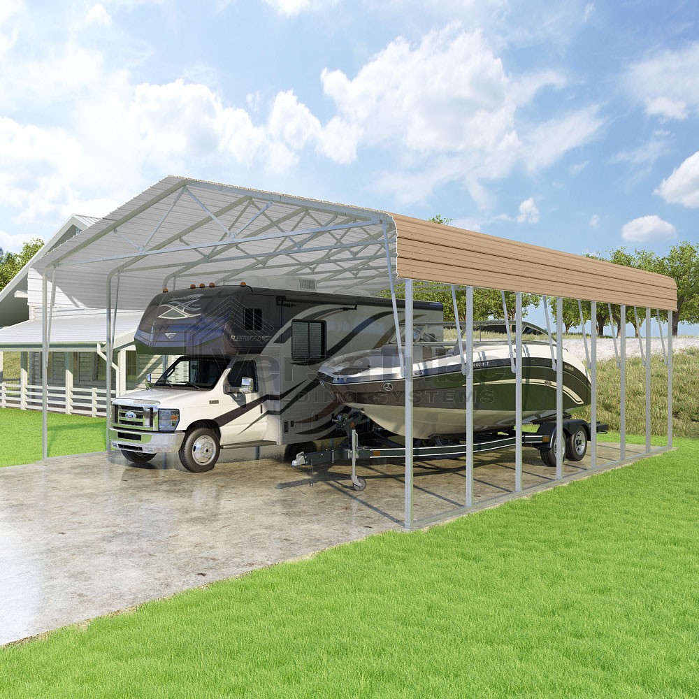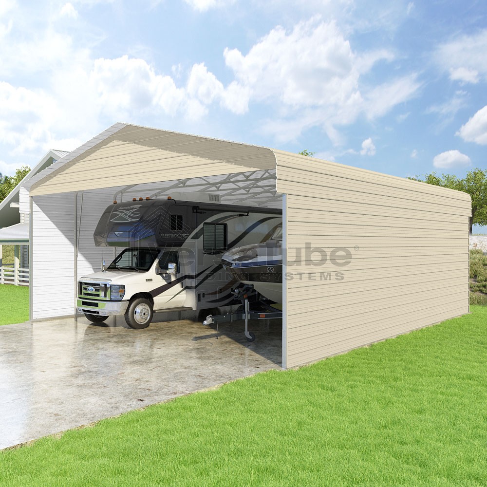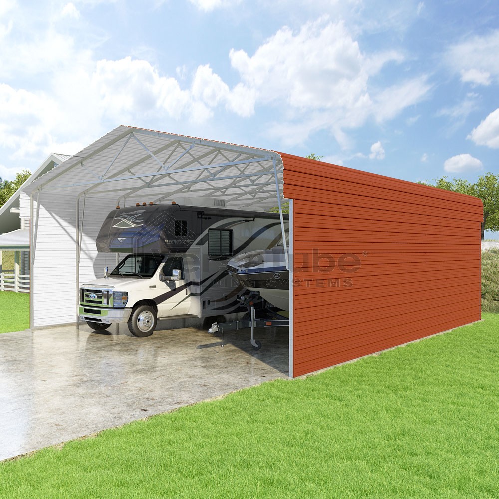 Classic Series DIY carport kit features horizontal application of sheet metal panels with the extra protection of rounded eaves.