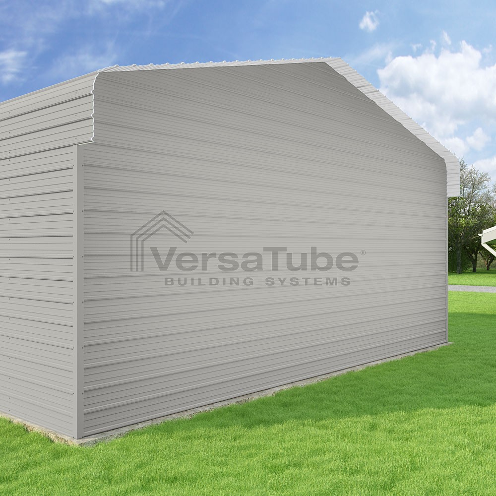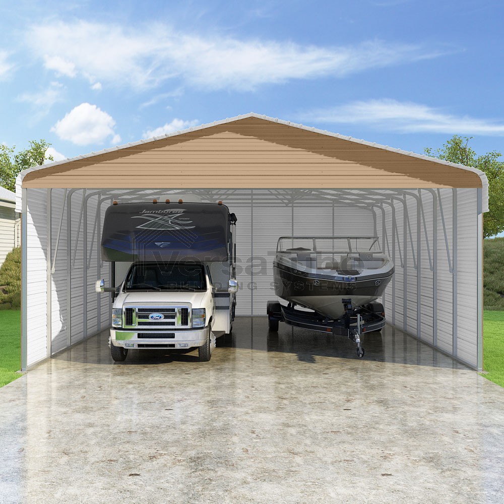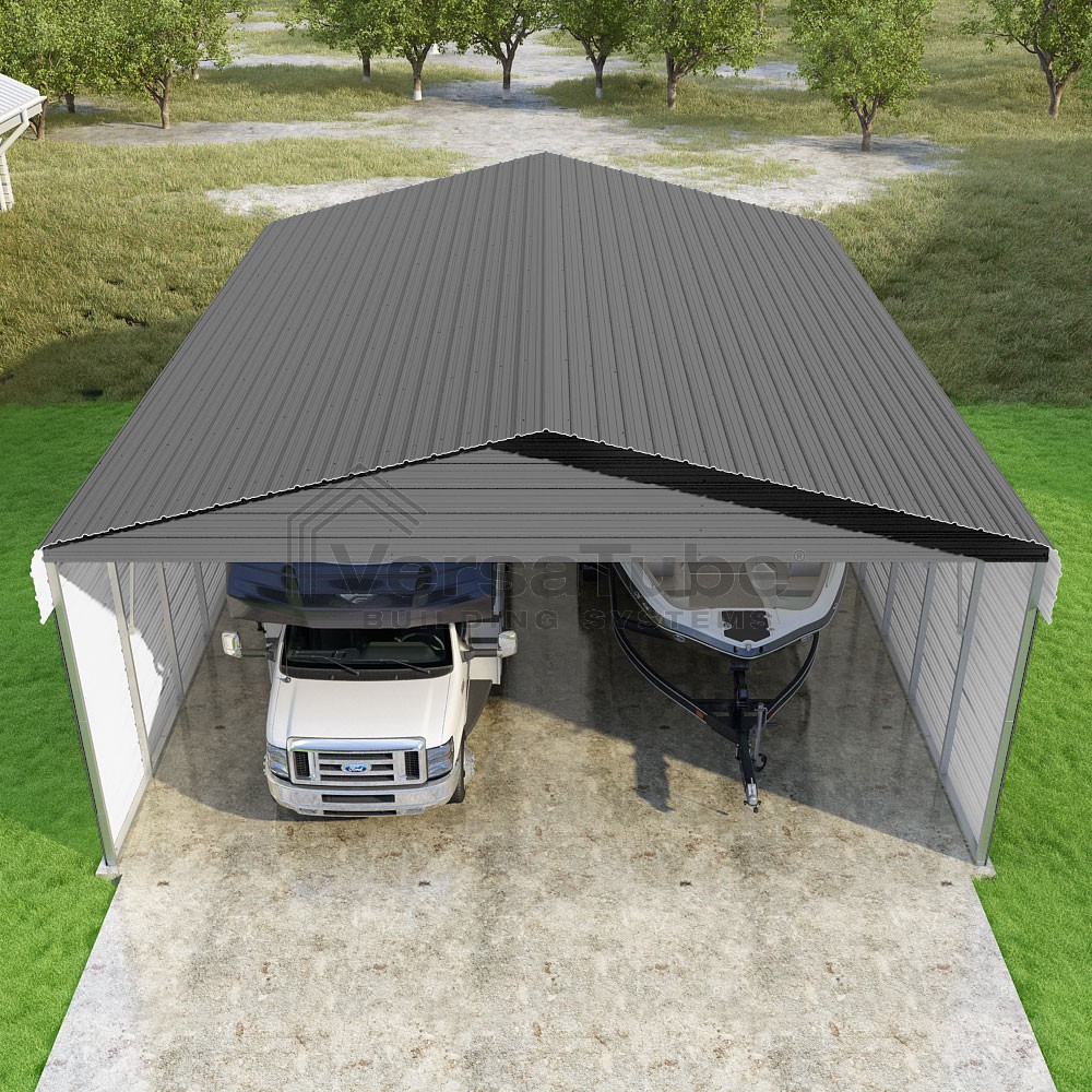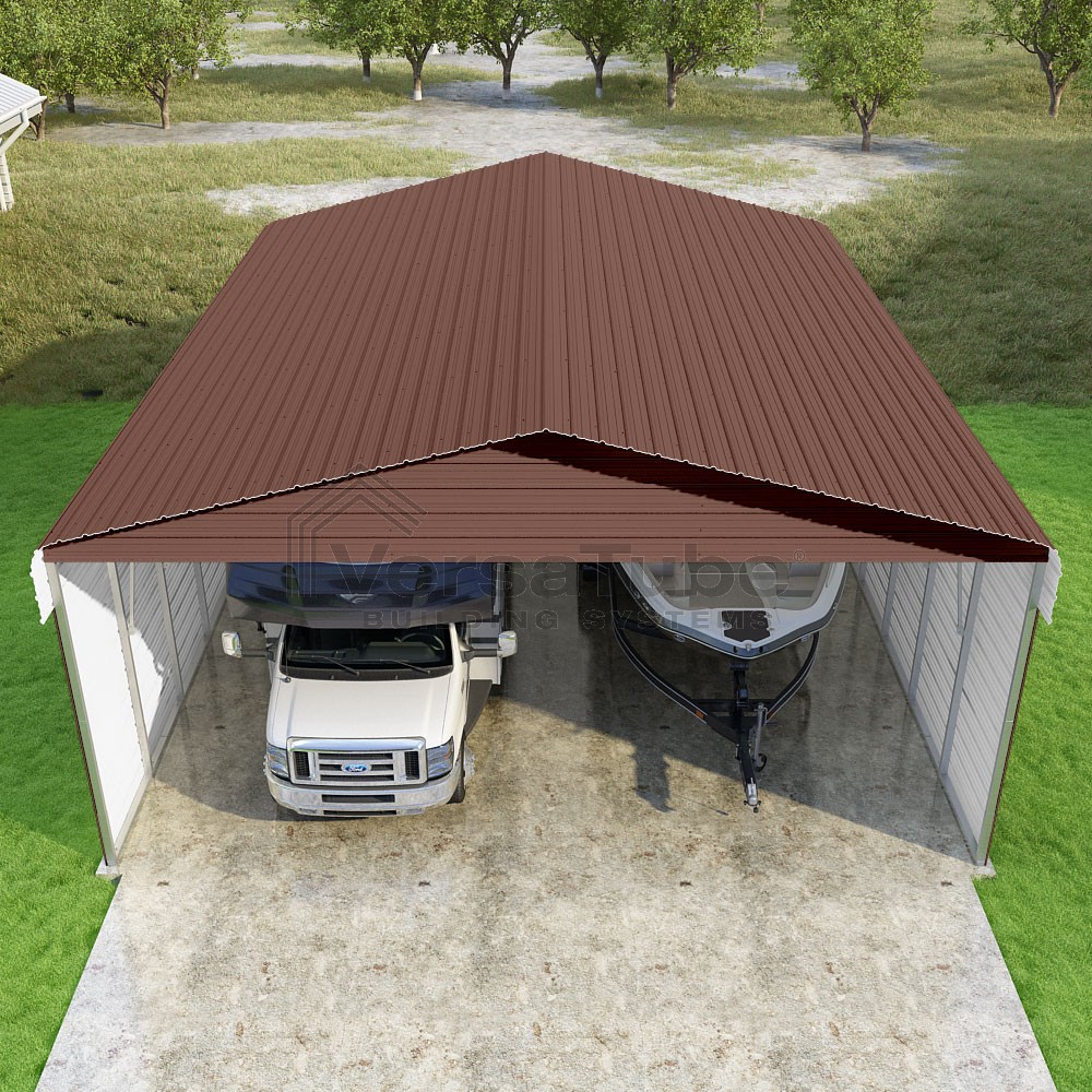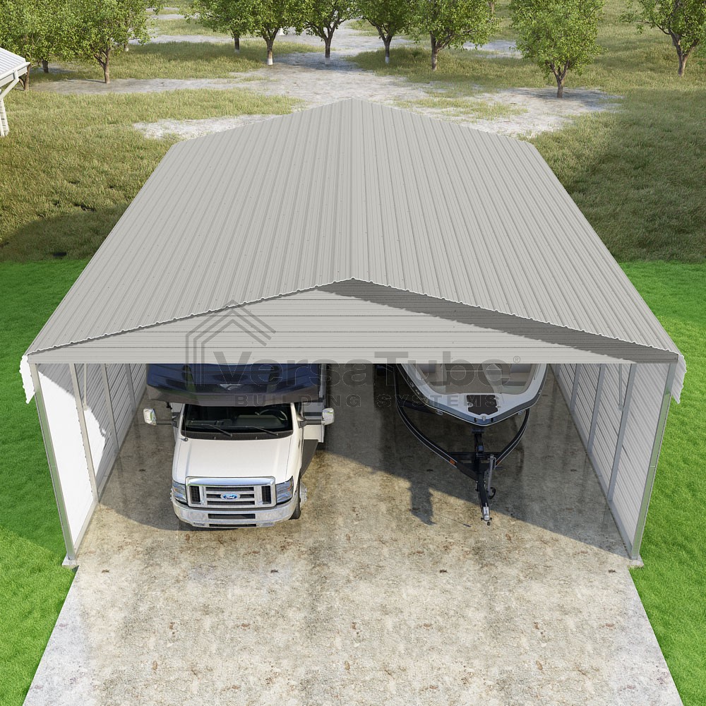 Classic Series DIY carport kit features horizontal application of sheet metal panels with the extra protection of rounded eaves.