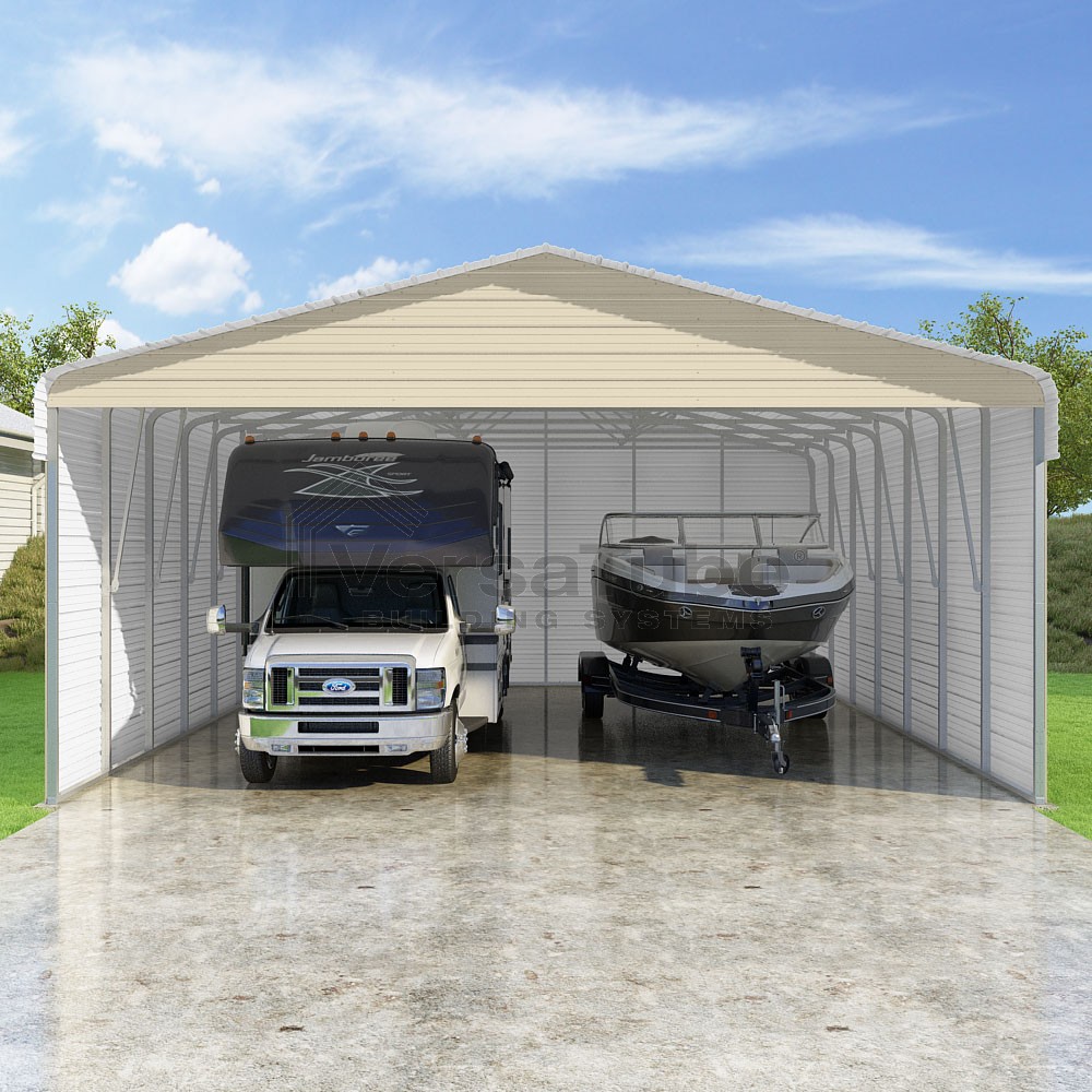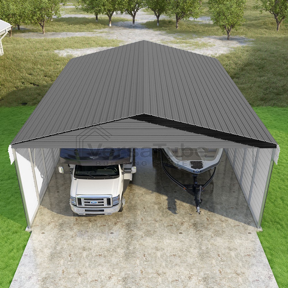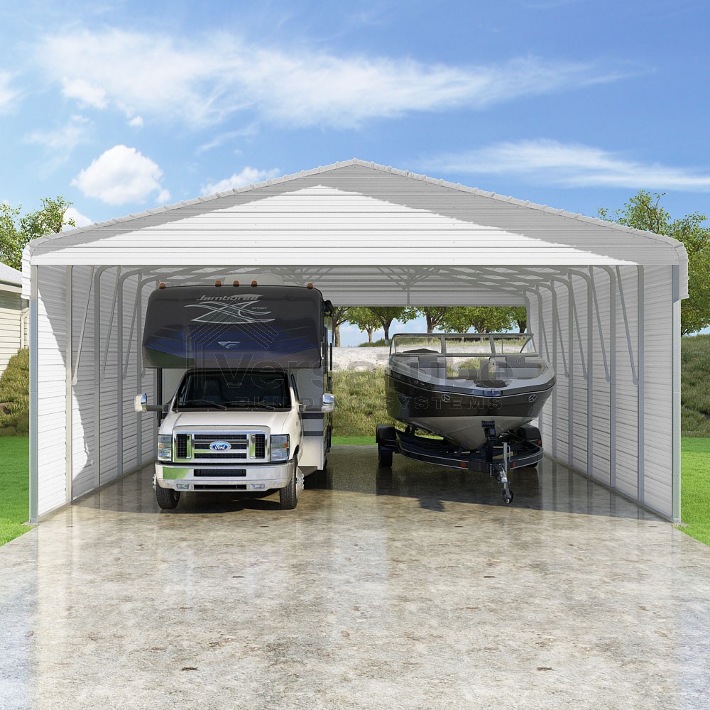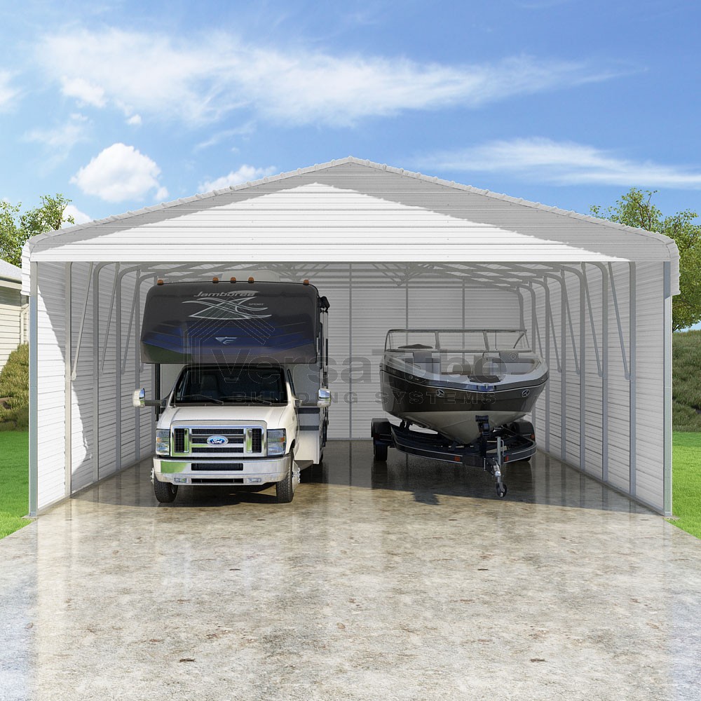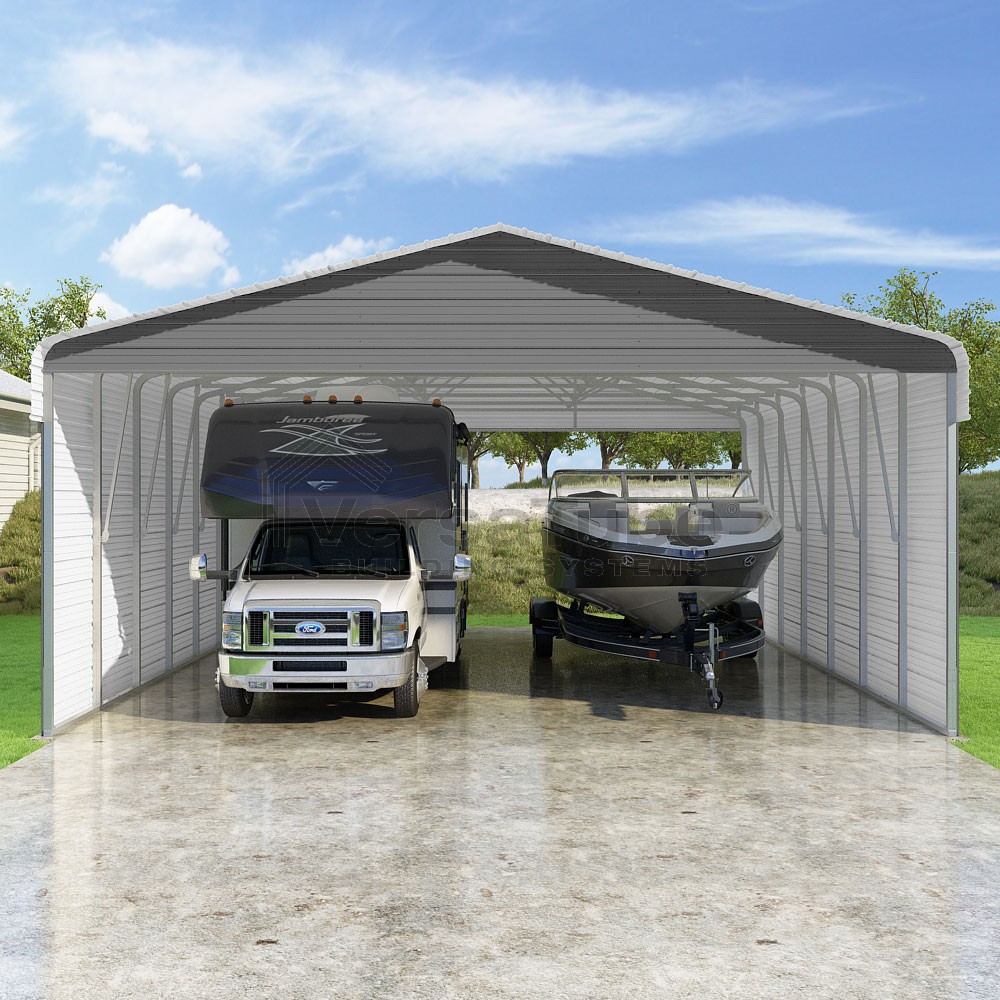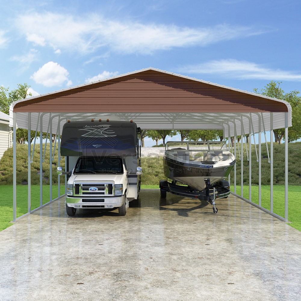 Classic Series DIY carport kit features horizontal application of sheet metal panels with the extra protection of rounded eaves.