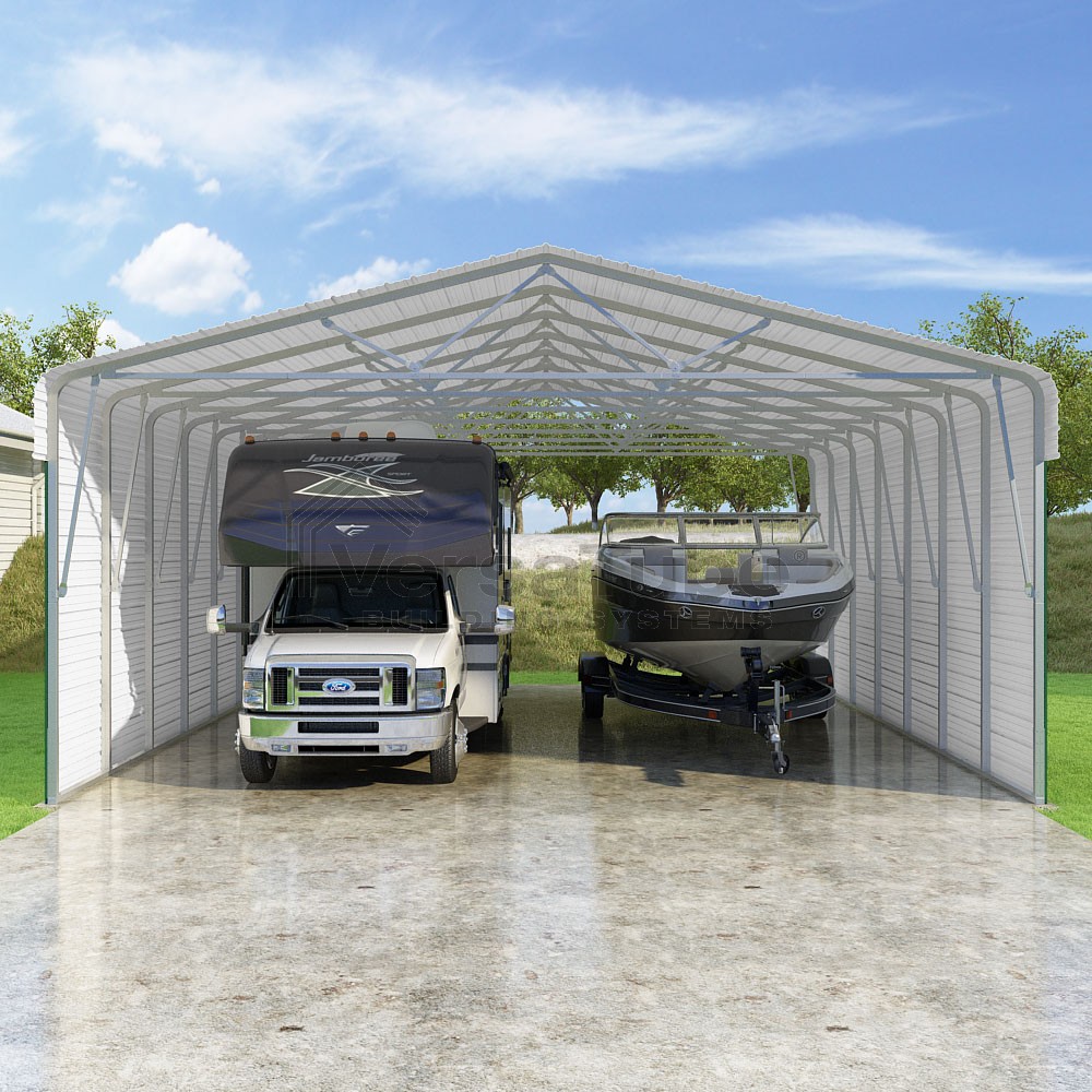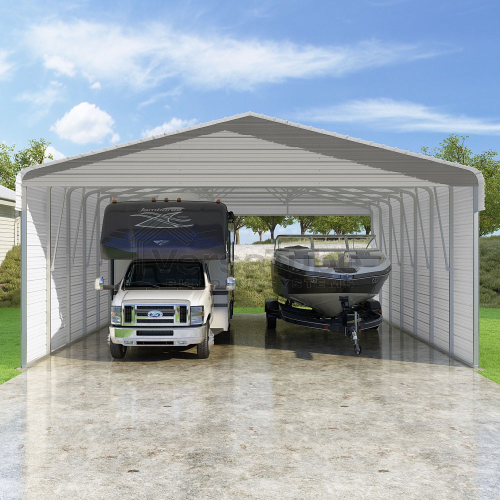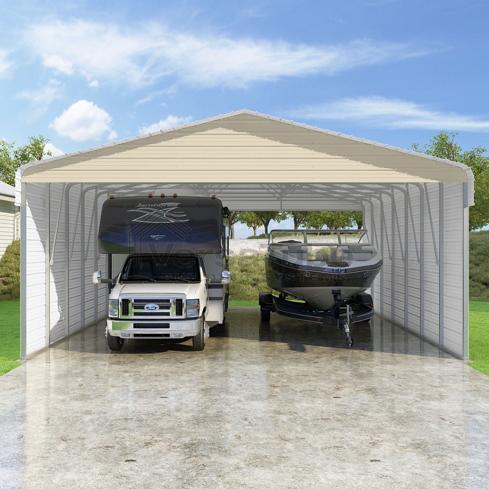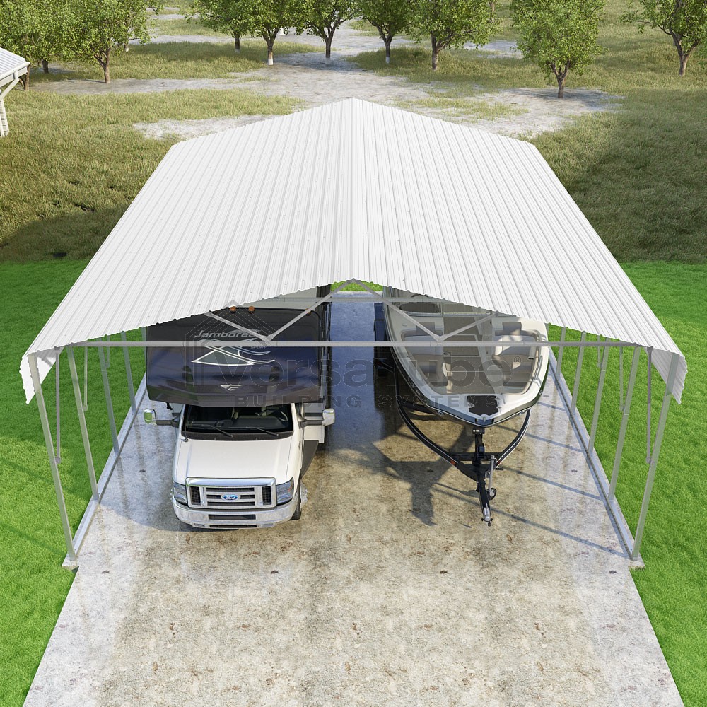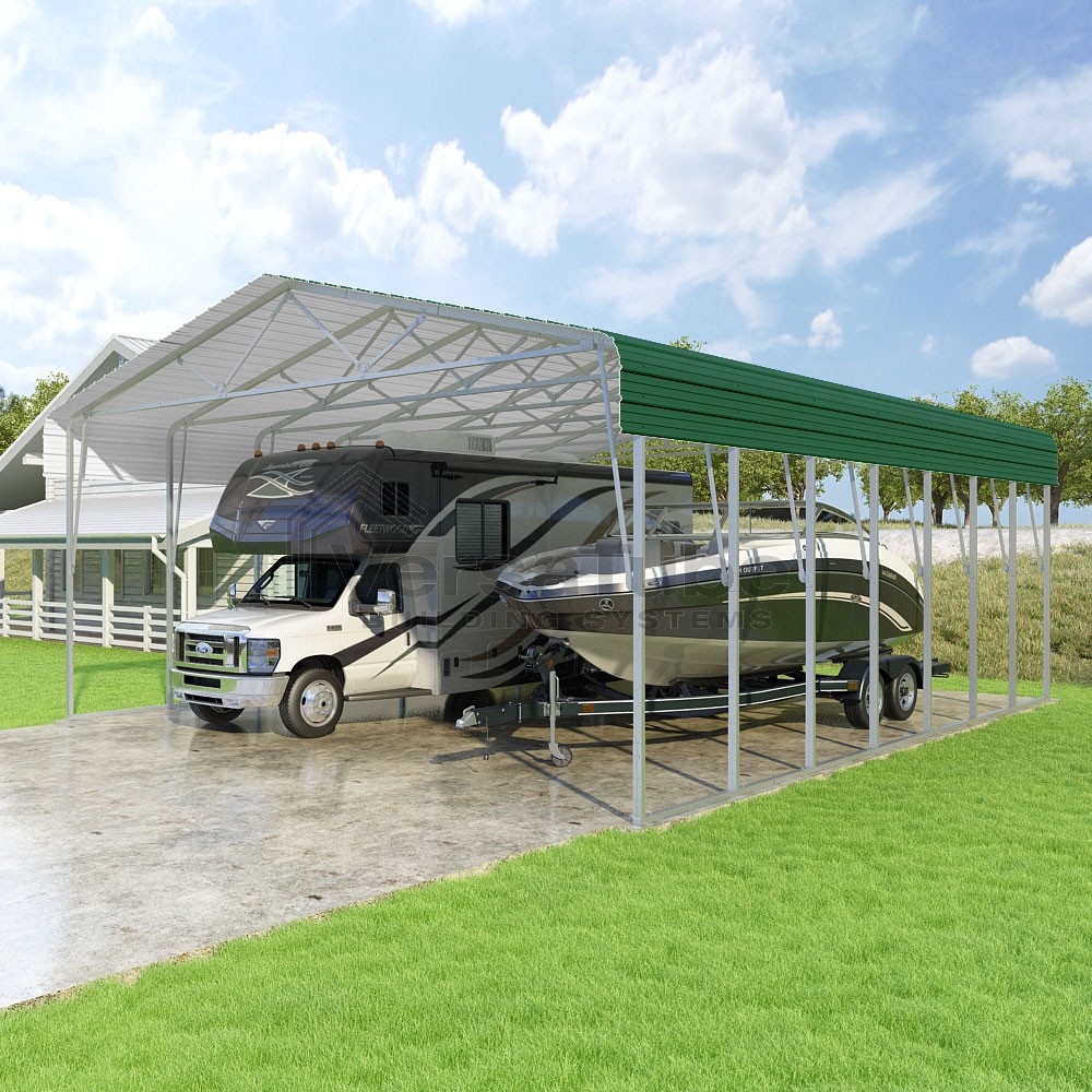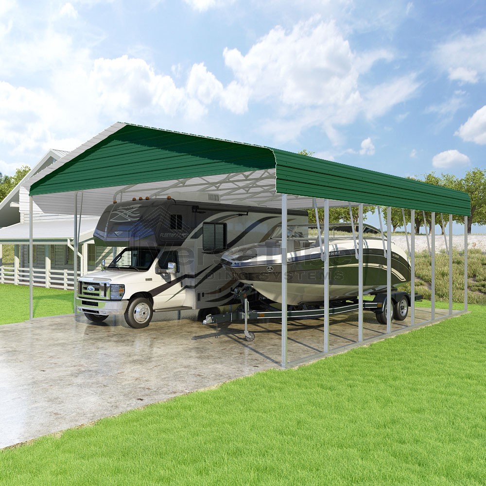 Classic Series DIY carport kit features horizontal application of sheet metal panels with the extra protection of rounded eaves.