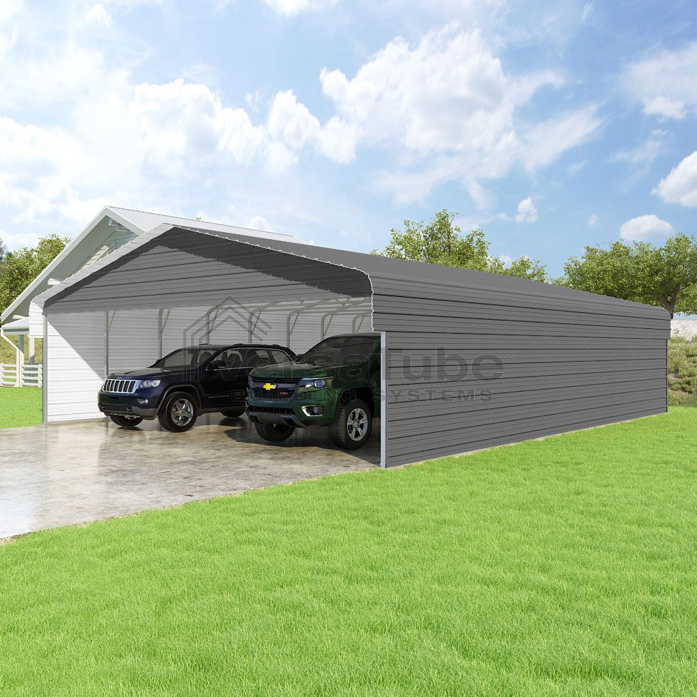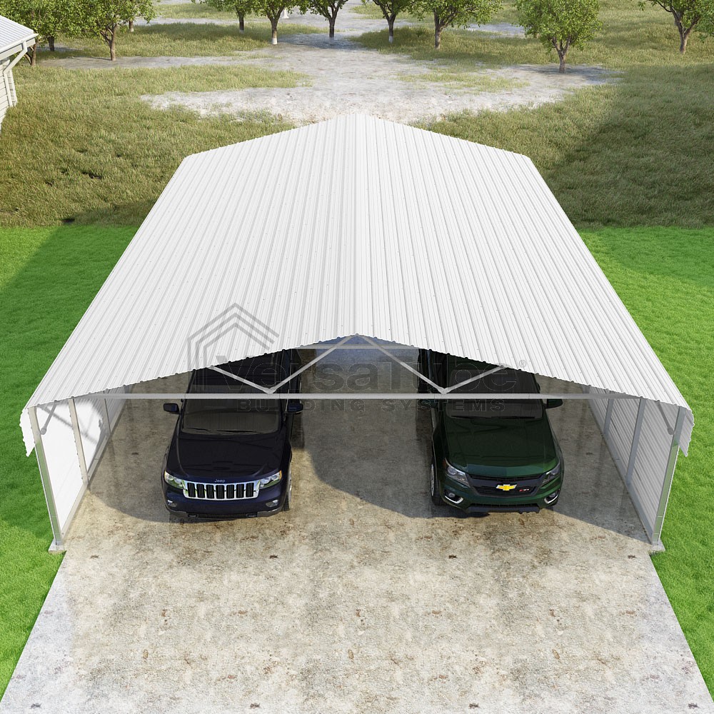 Classic Series DIY carport kit features horizontal application of sheet metal panels with the extra protection of rounded eaves.