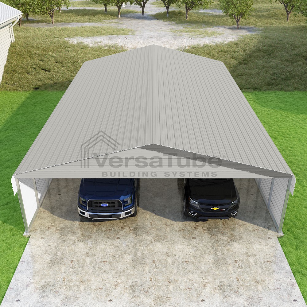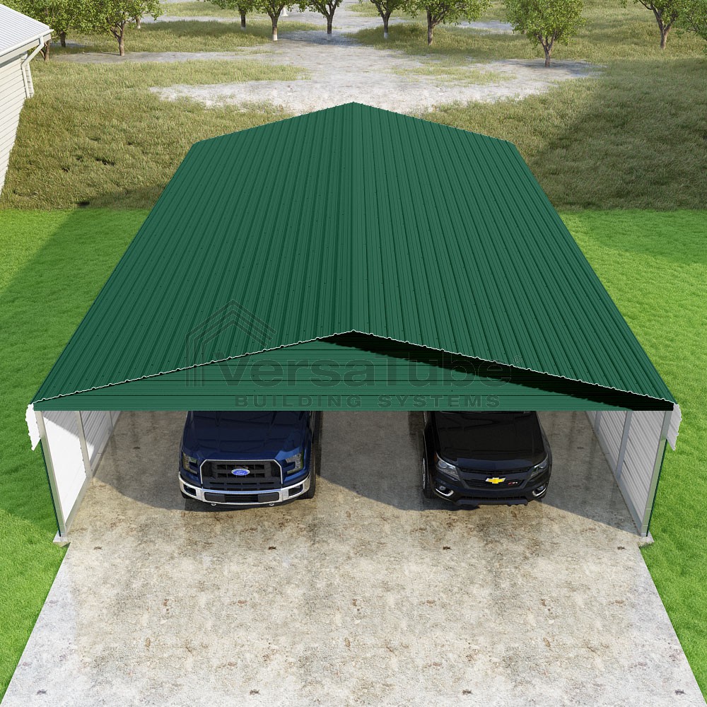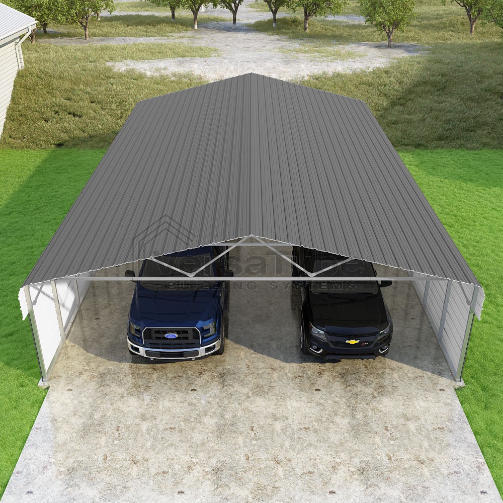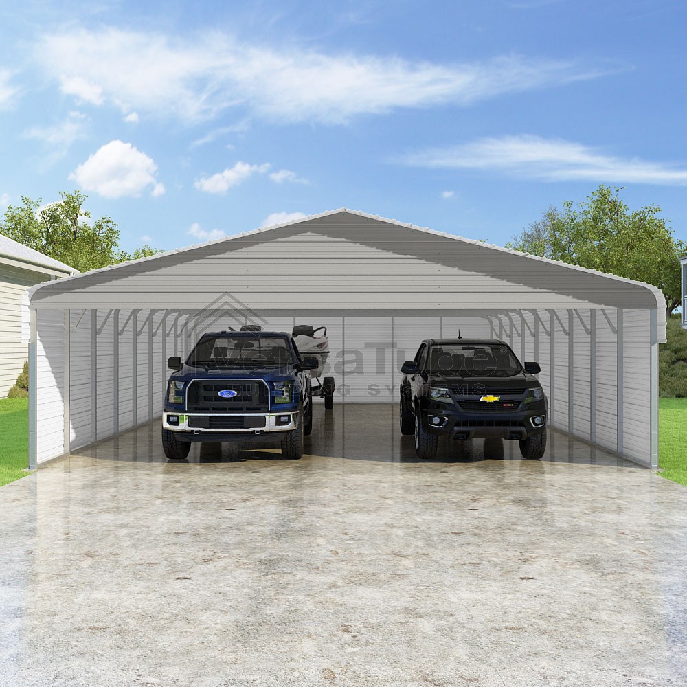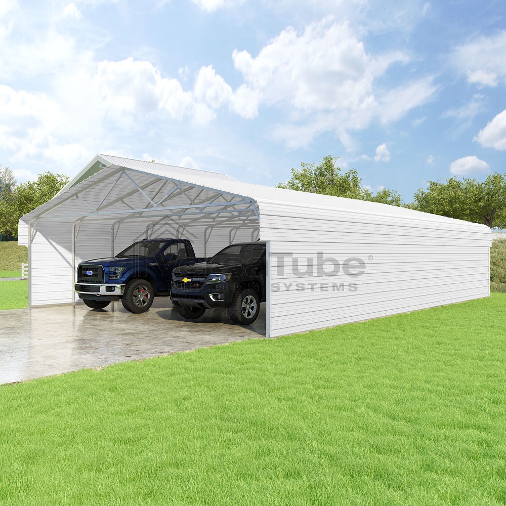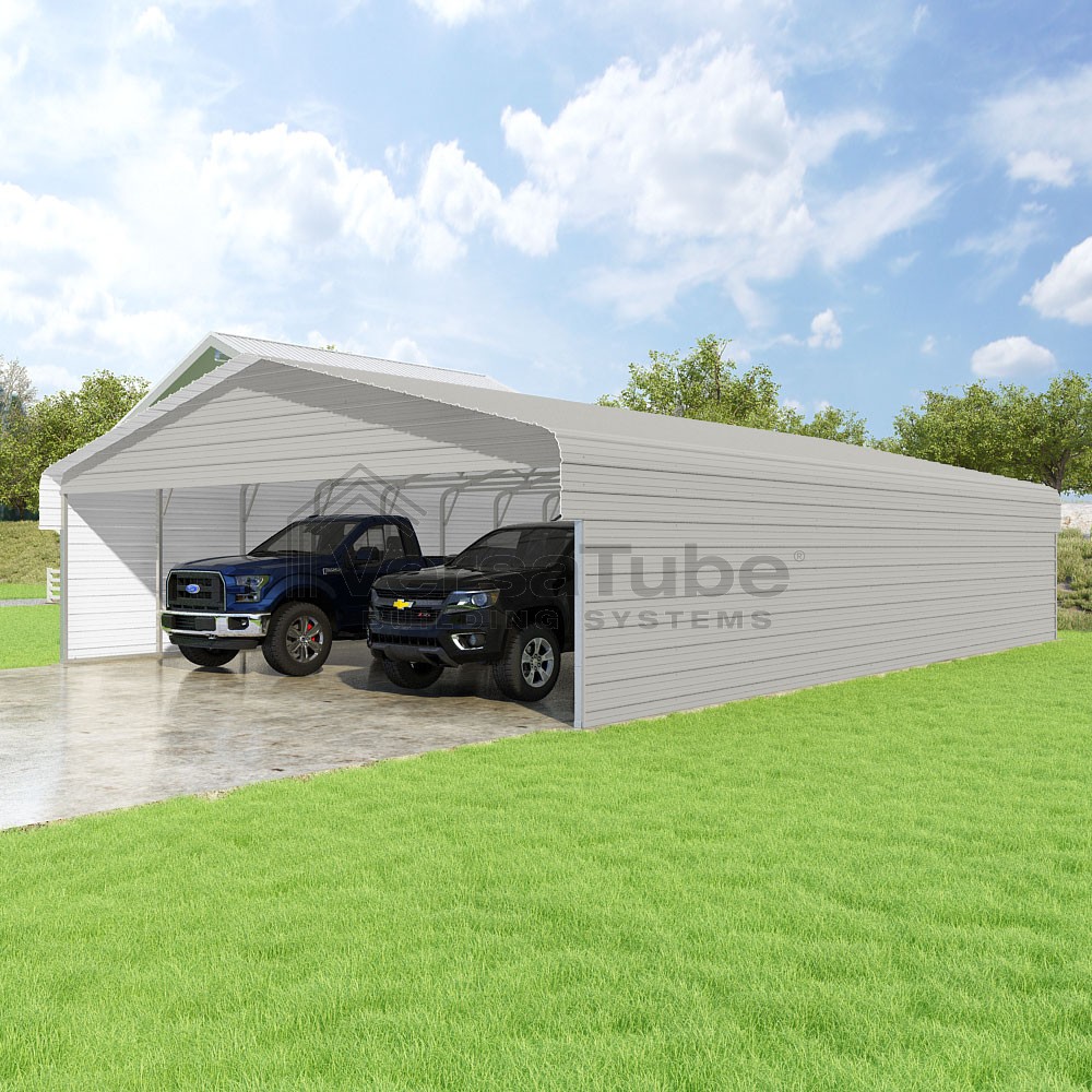 Classic Series DIY carport kit features horizontal application of sheet metal panels with the extra protection of rounded eaves.