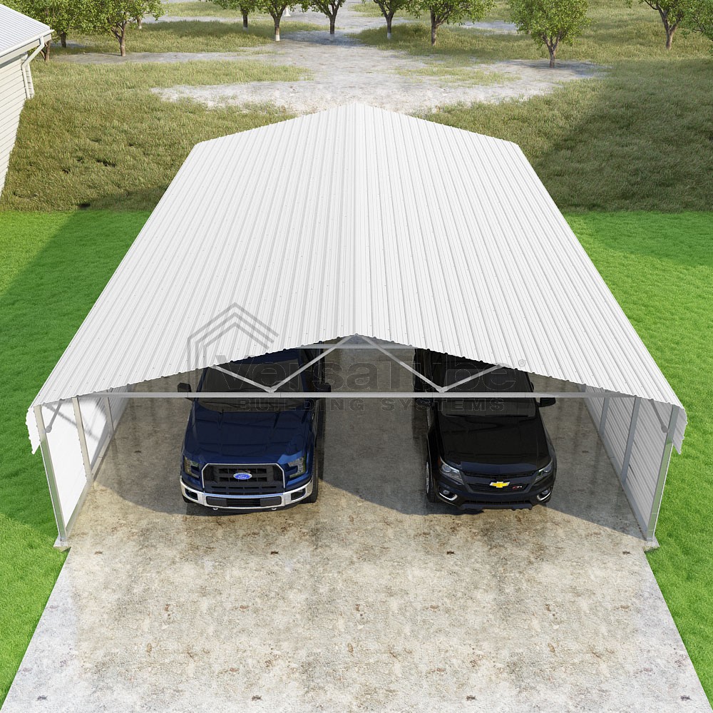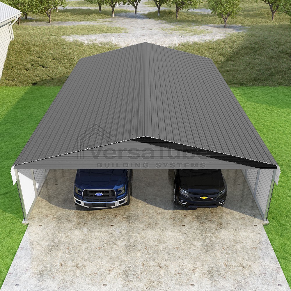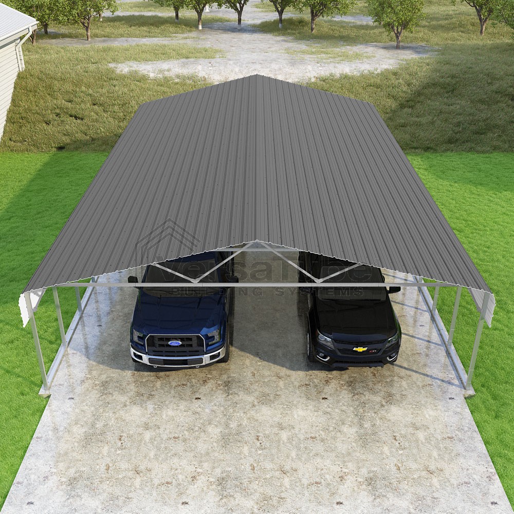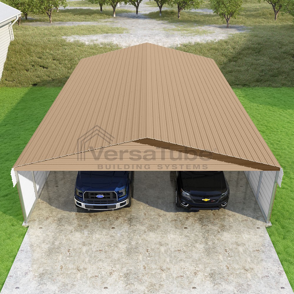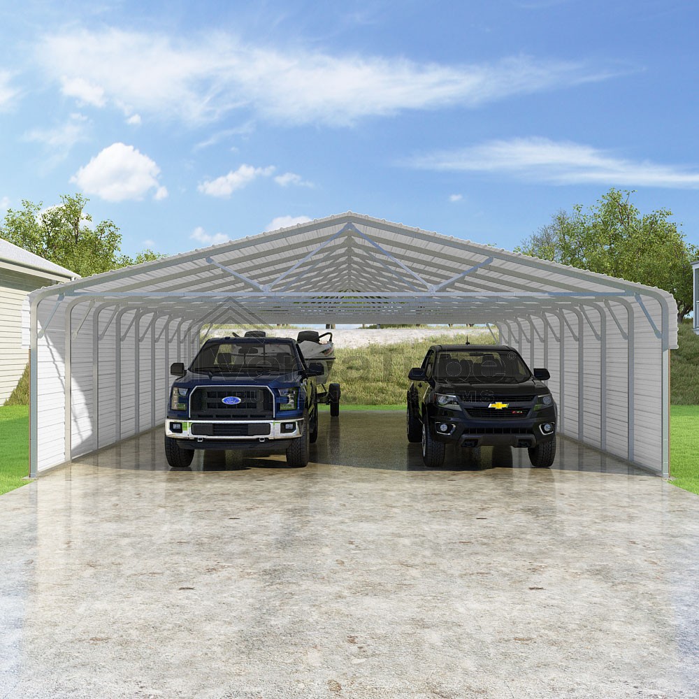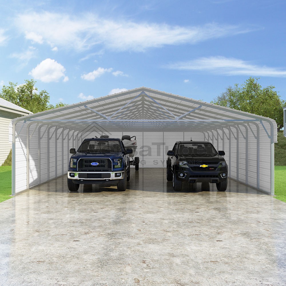 Classic Series DIY carport kit features horizontal application of sheet metal panels with the extra protection of rounded eaves.