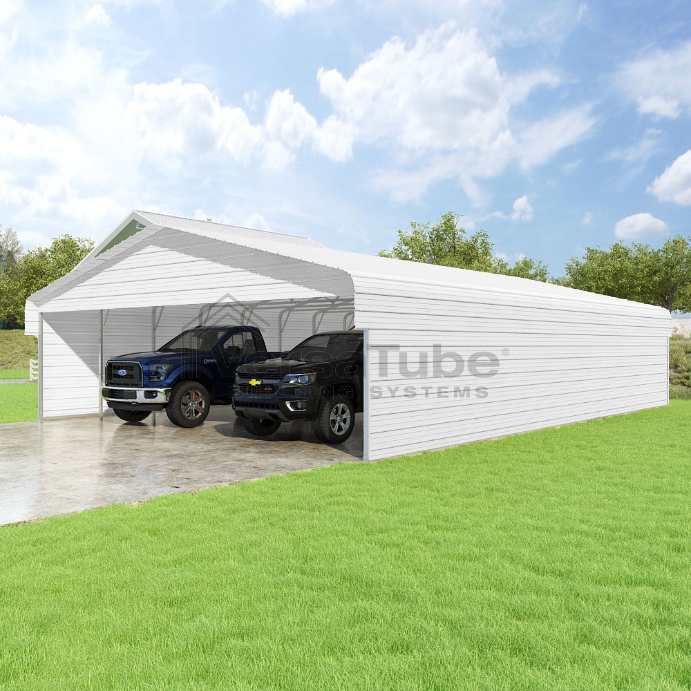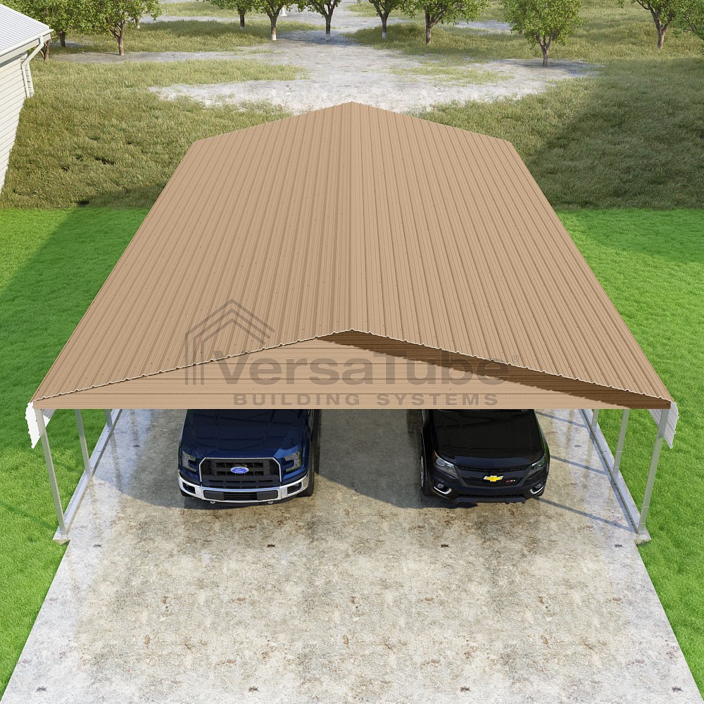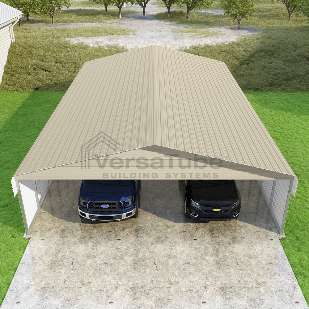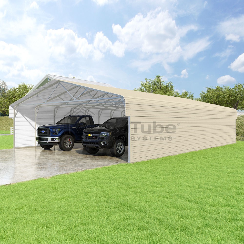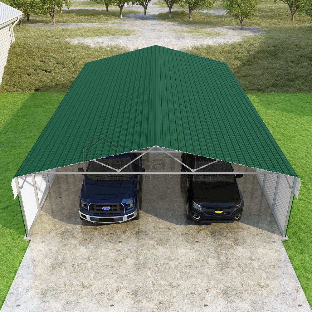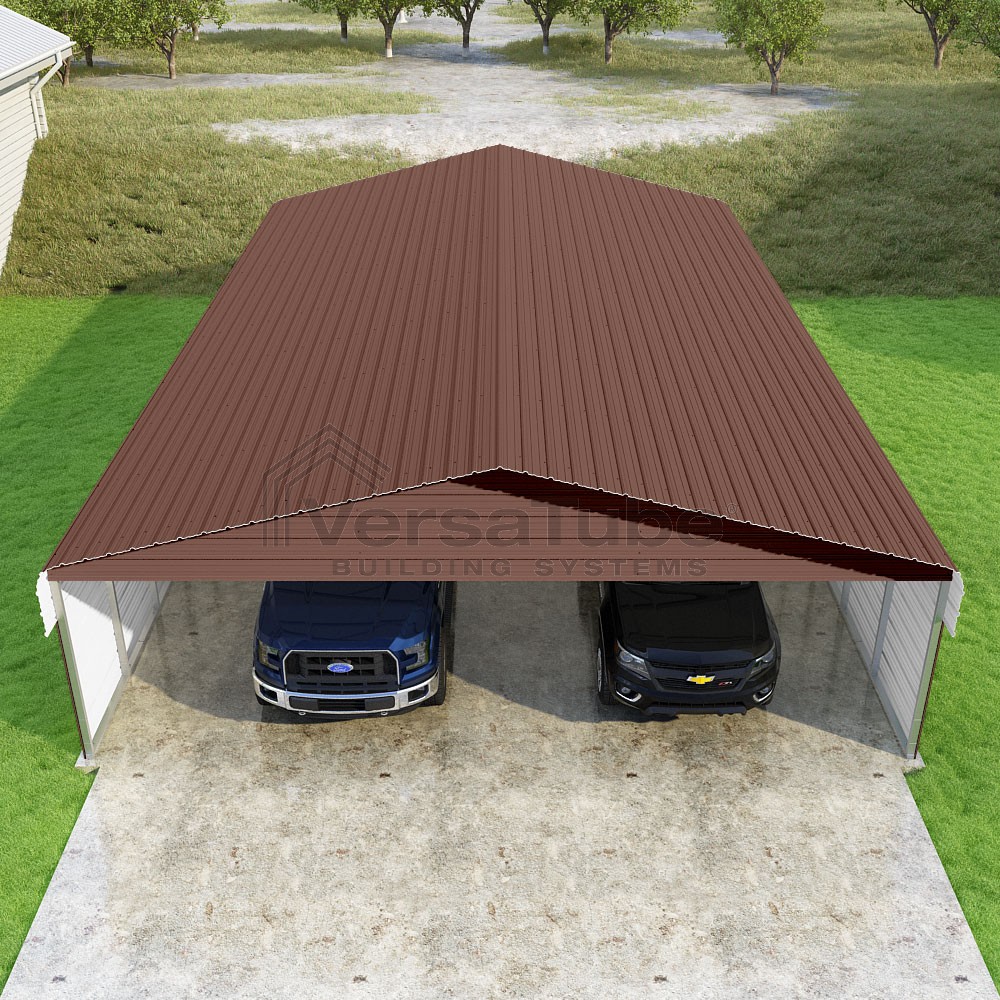 Classic Series DIY carport kit features horizontal application of sheet metal panels with the extra protection of rounded eaves.