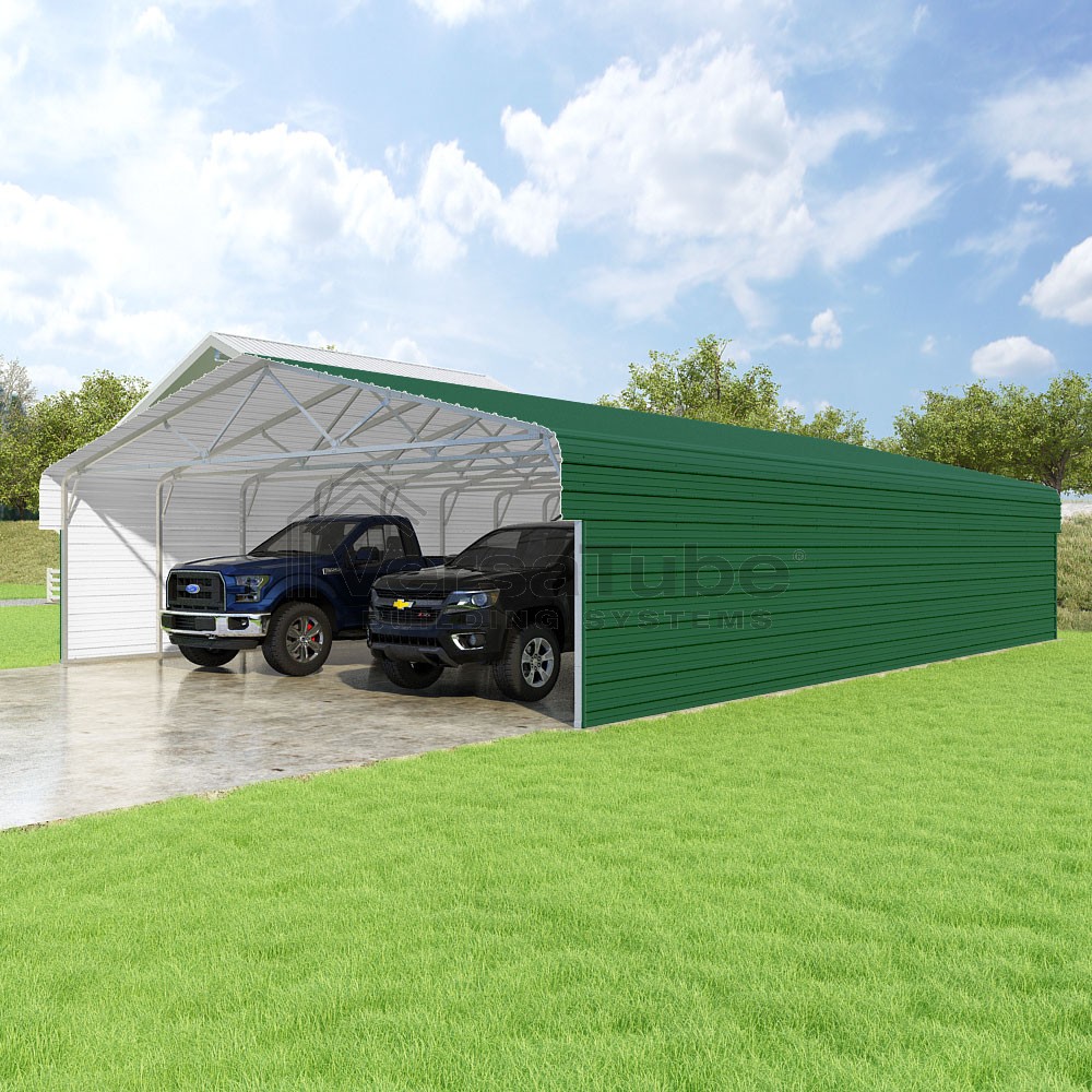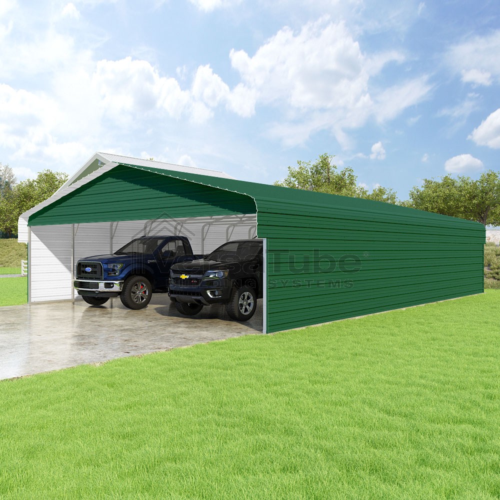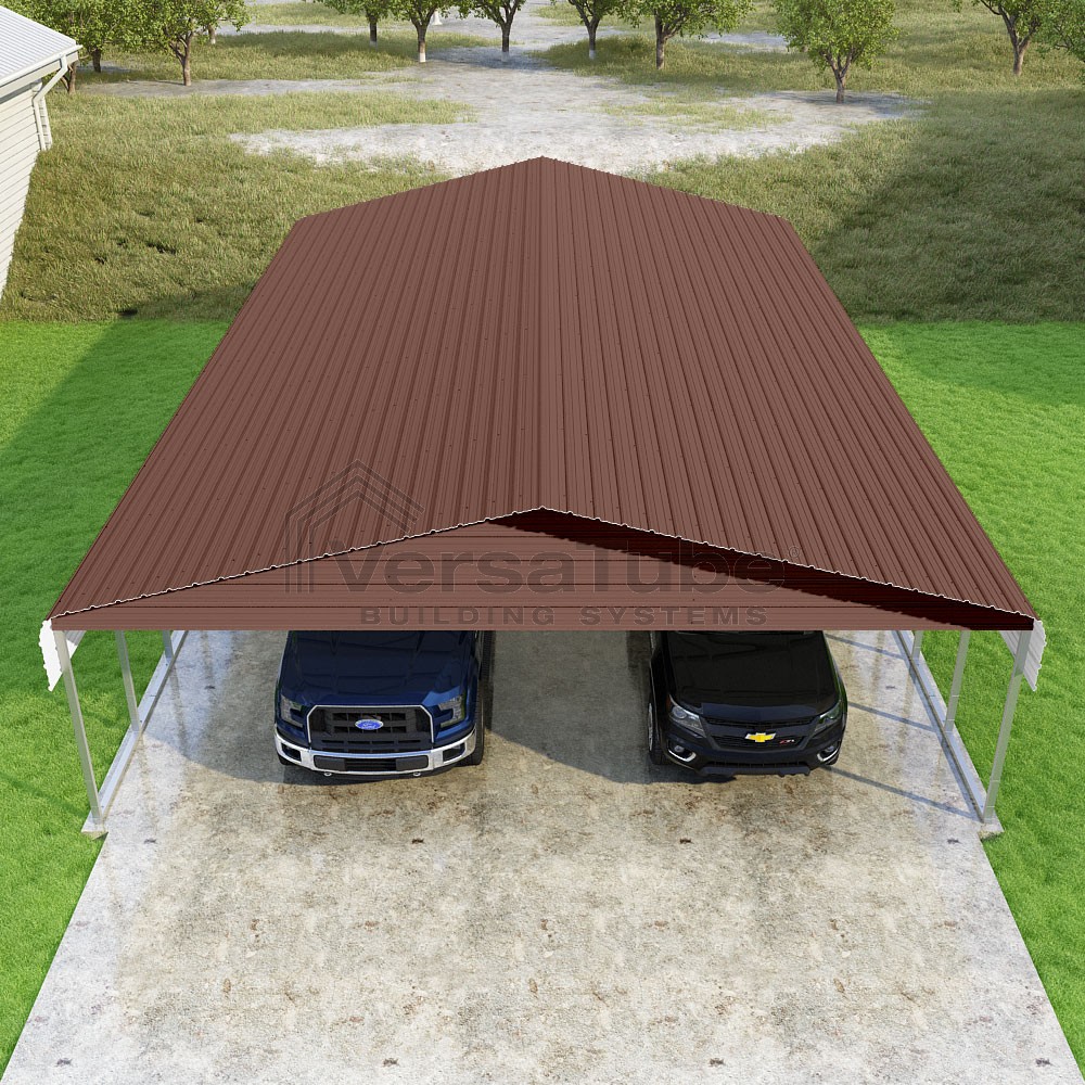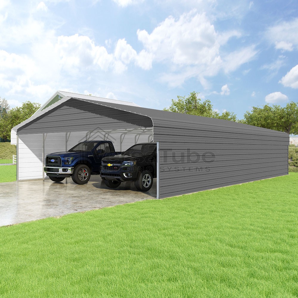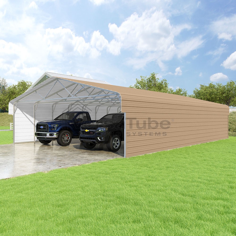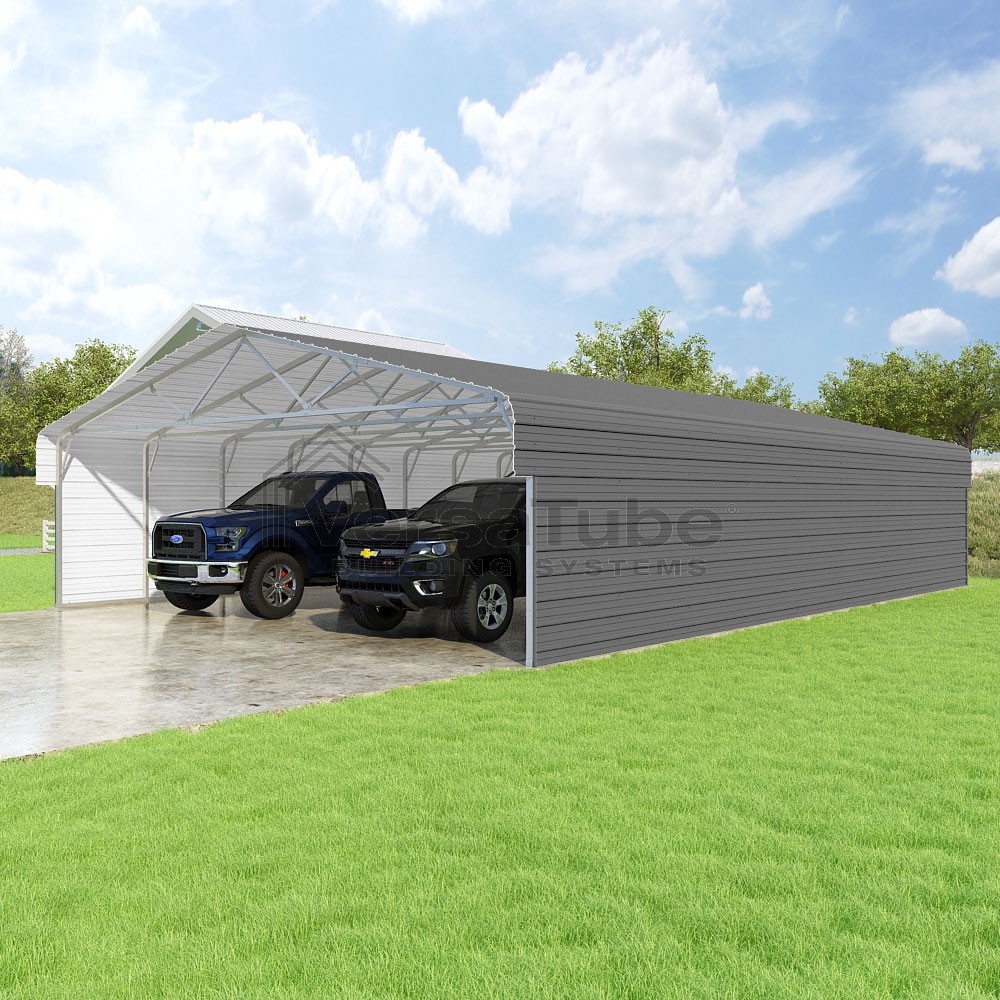 Classic Series DIY carport kit features horizontal application of sheet metal panels with the extra protection of rounded eaves.