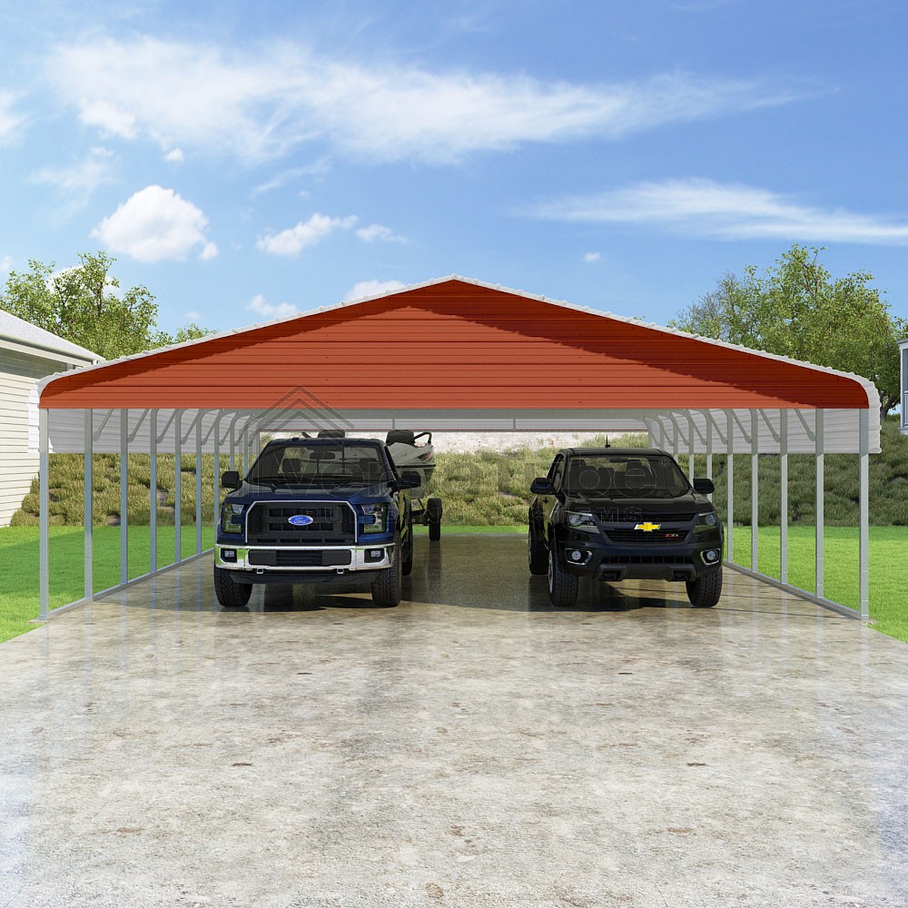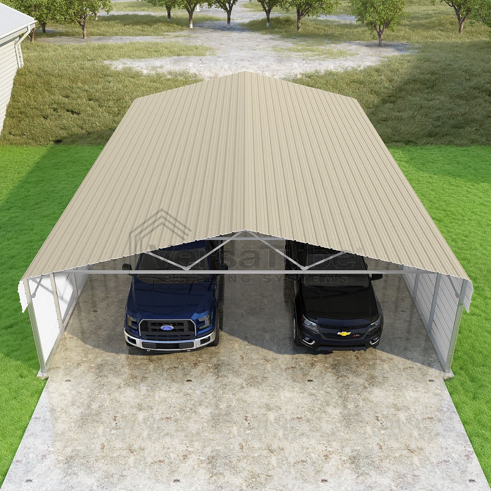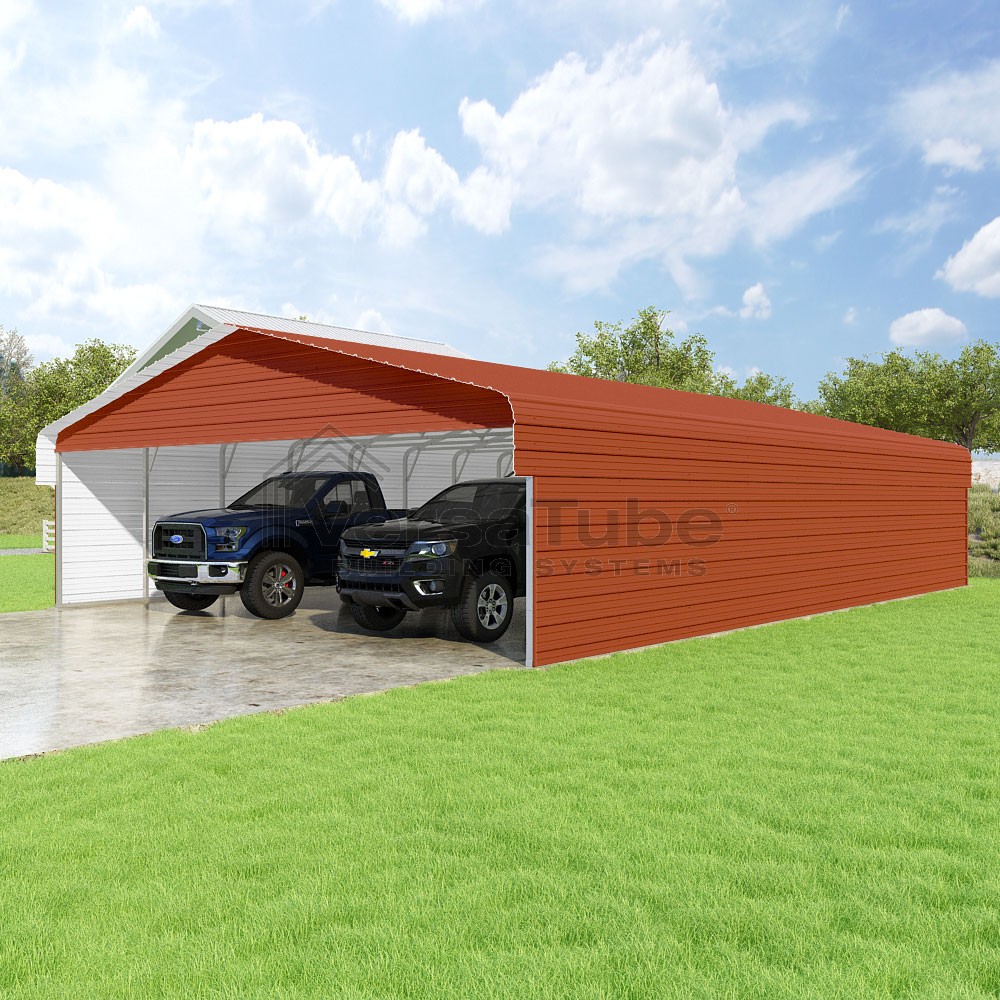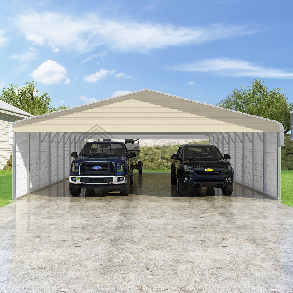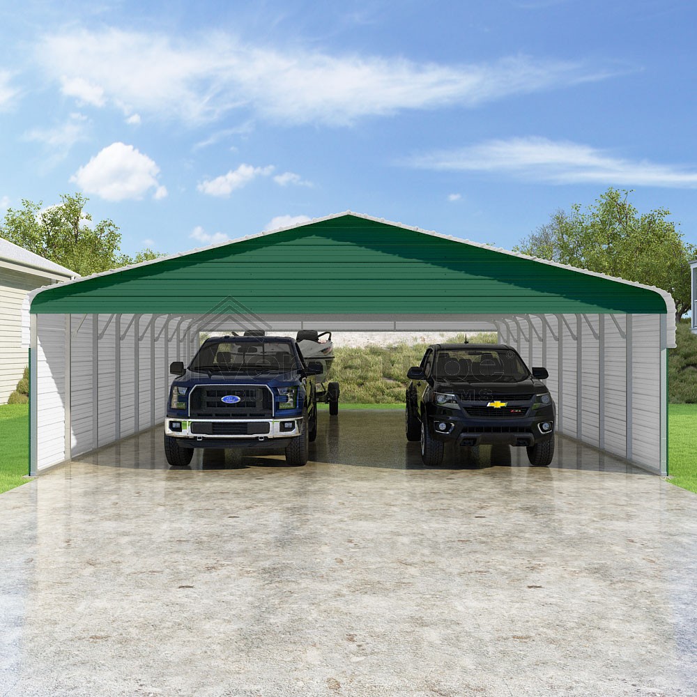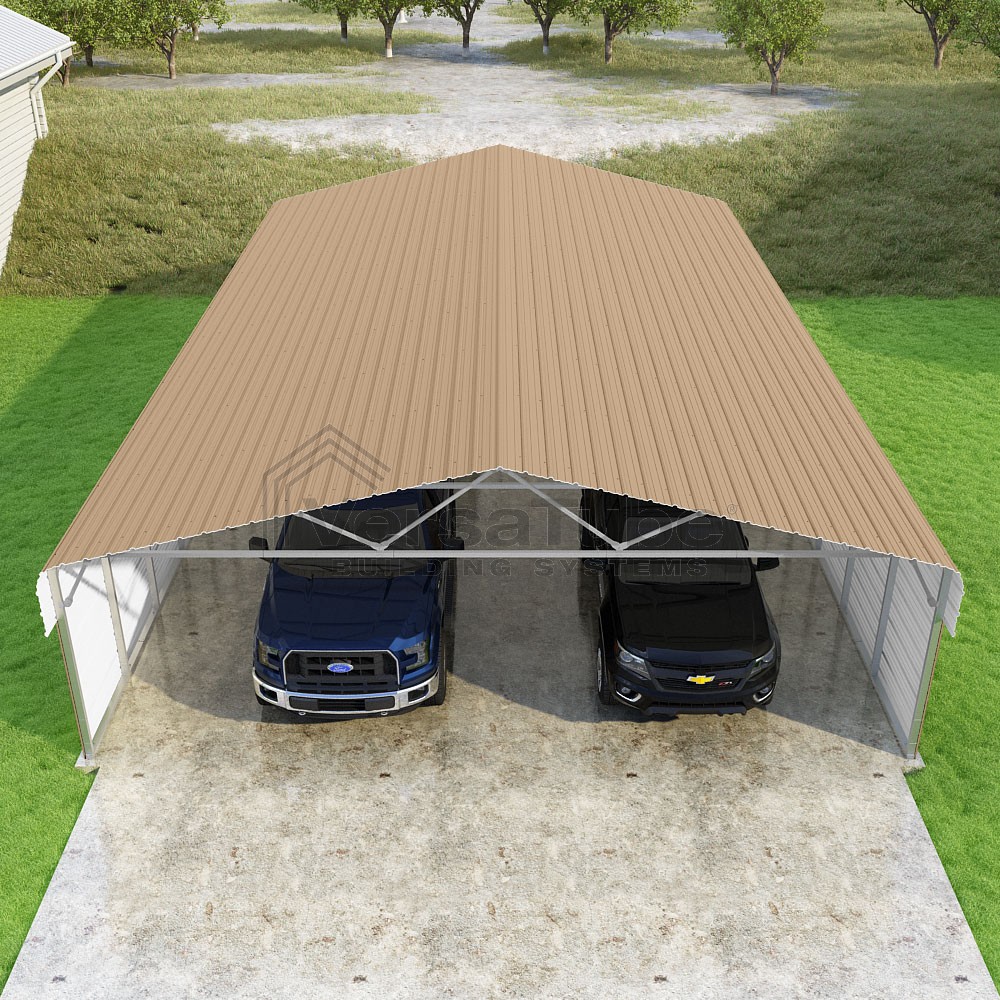 Classic Series DIY carport kit features horizontal application of sheet metal panels with the extra protection of rounded eaves.