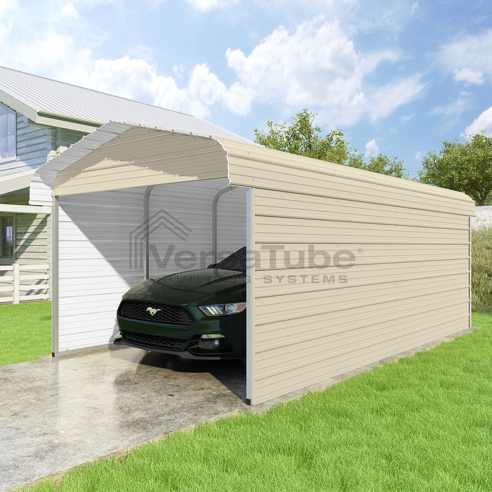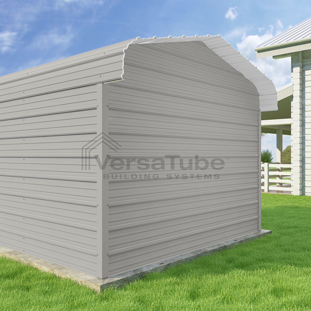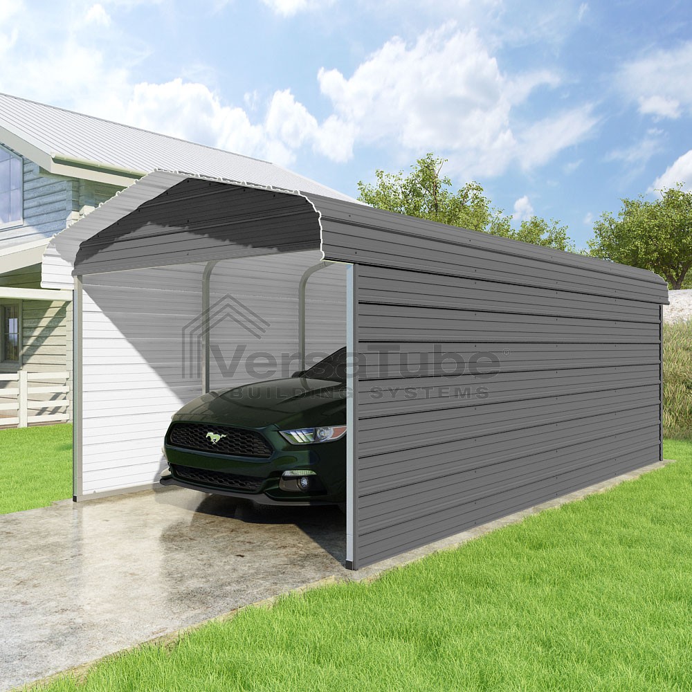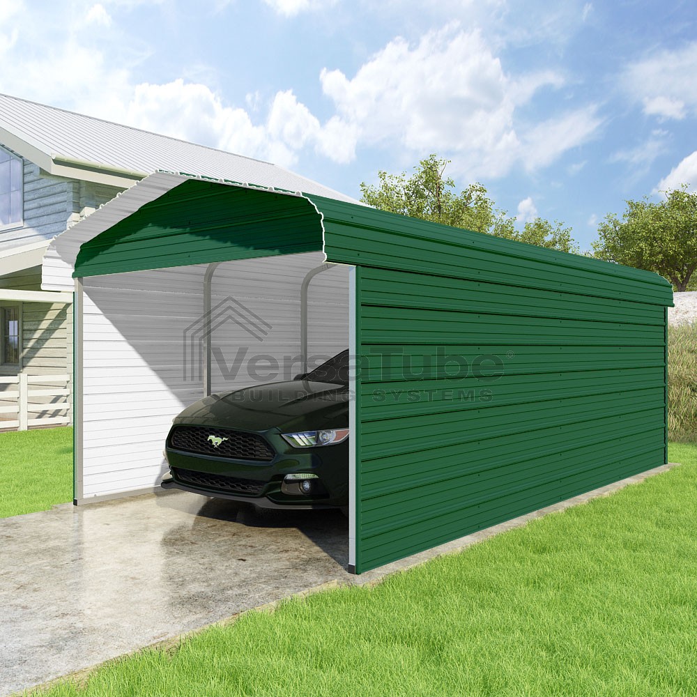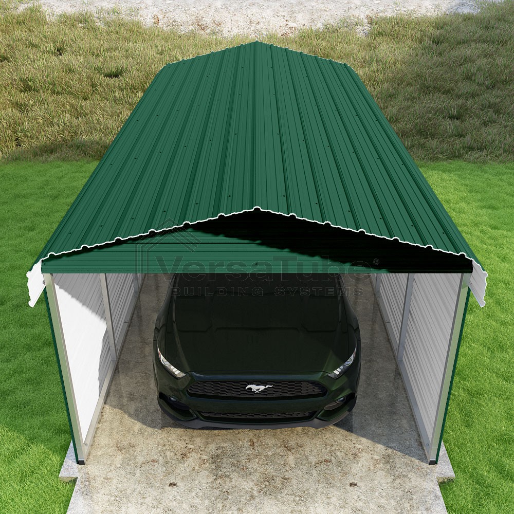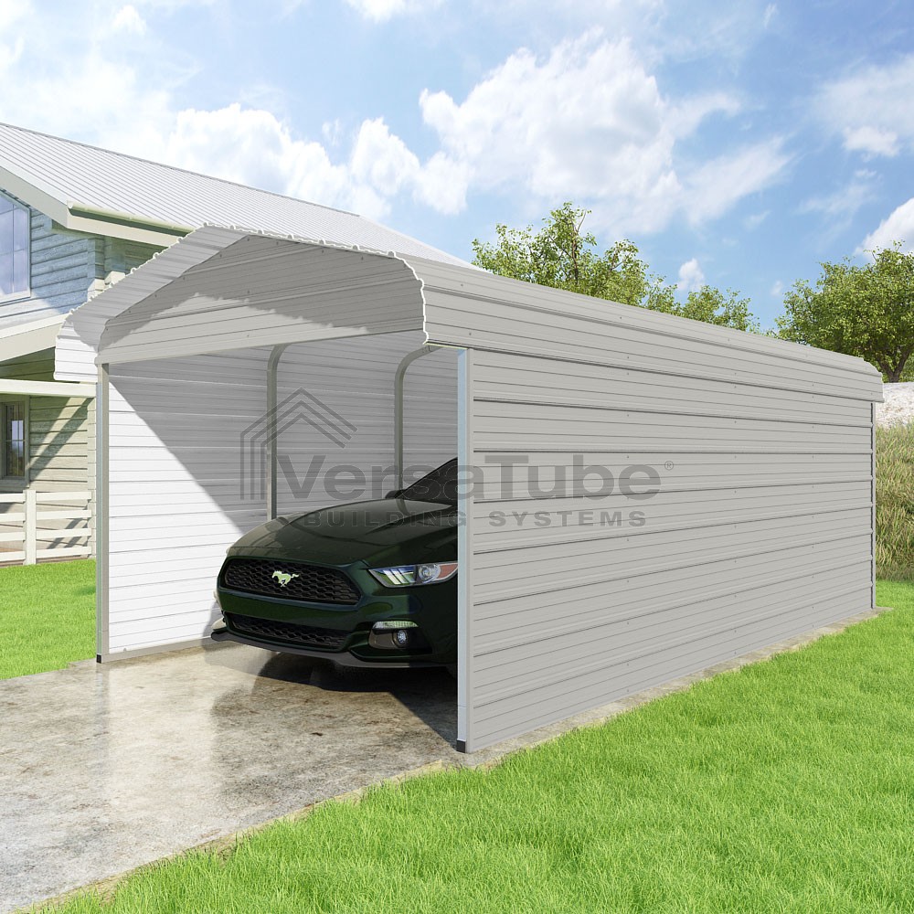 Classic Series DIY carport kit features horizontal application of sheet metal panels with the extra protection of rounded eaves.