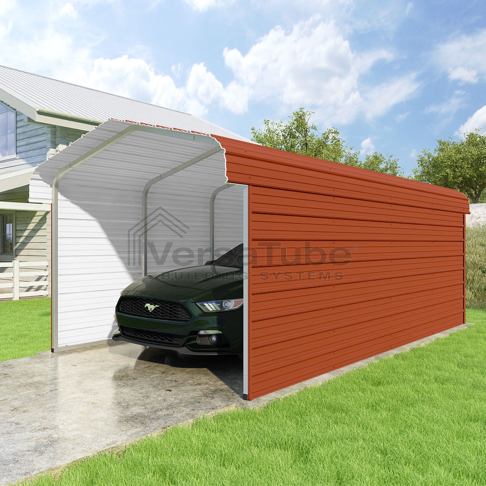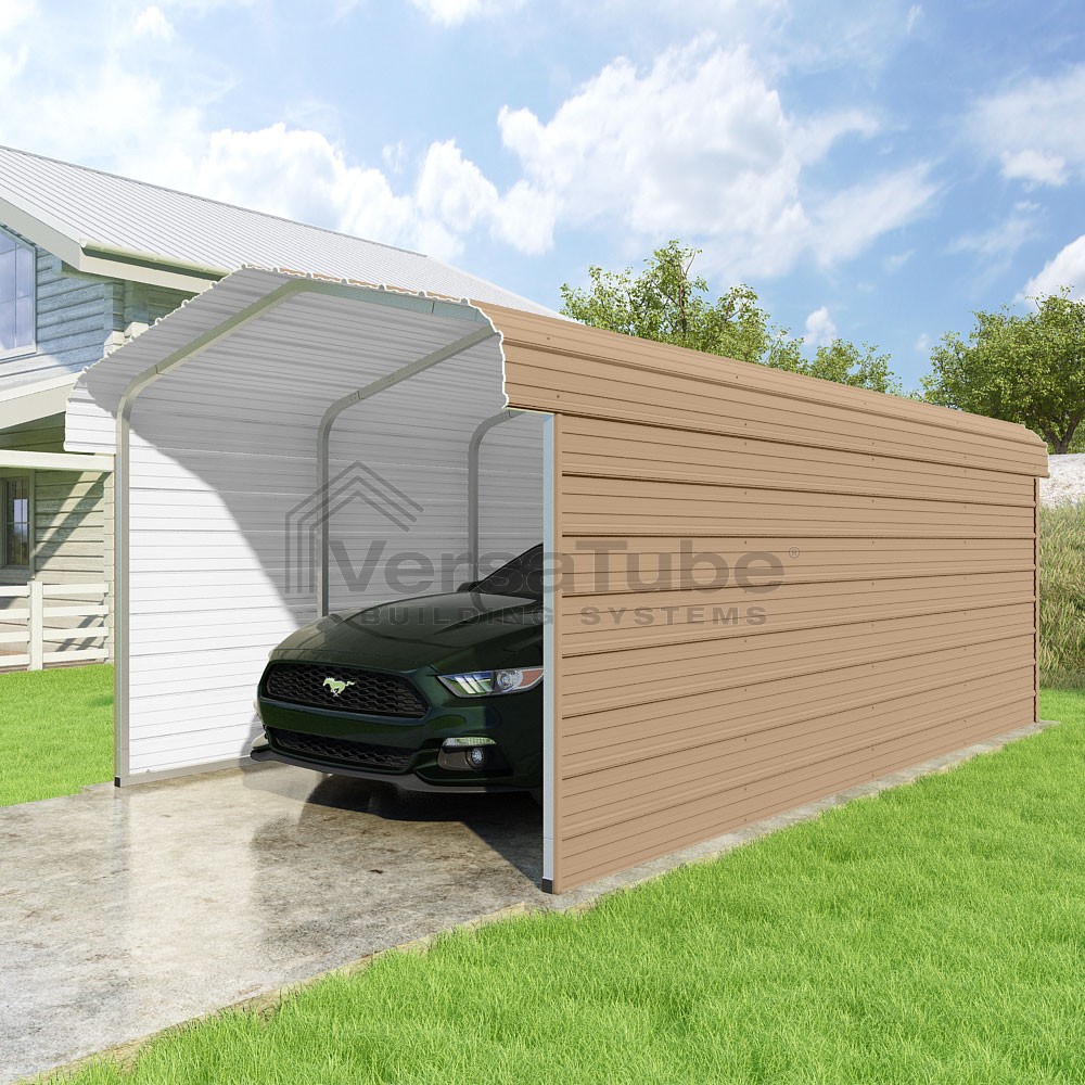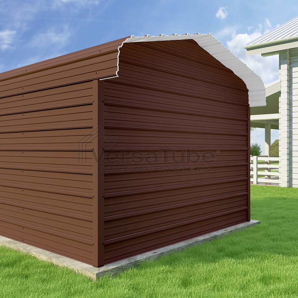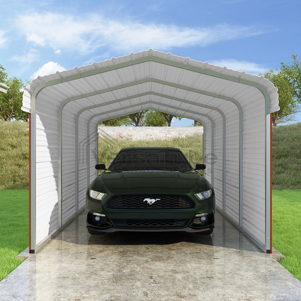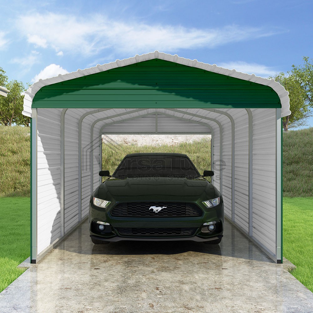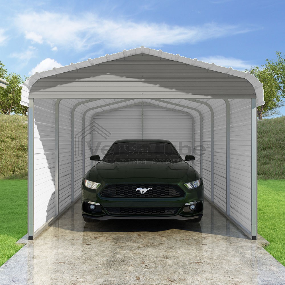 Classic Series DIY carport kit features horizontal application of sheet metal panels with the extra protection of rounded eaves.
