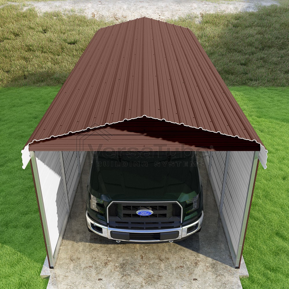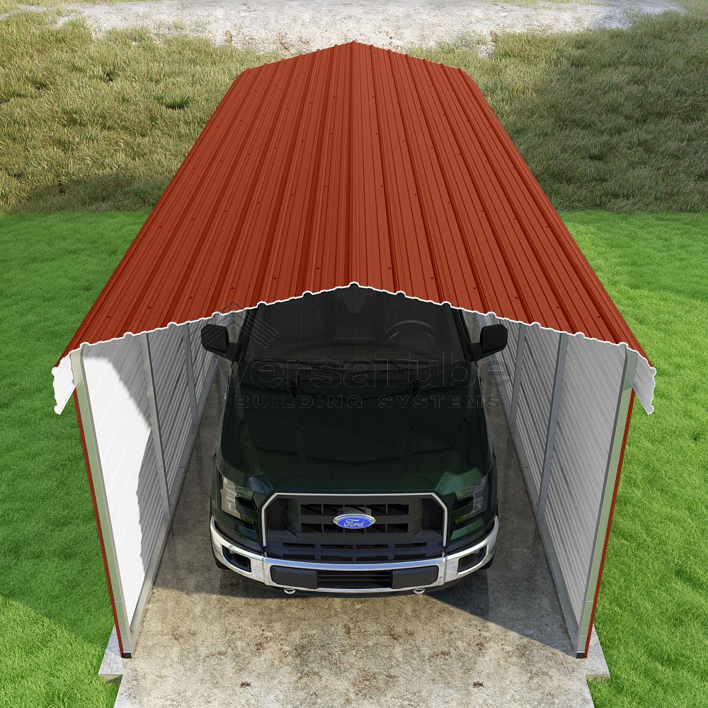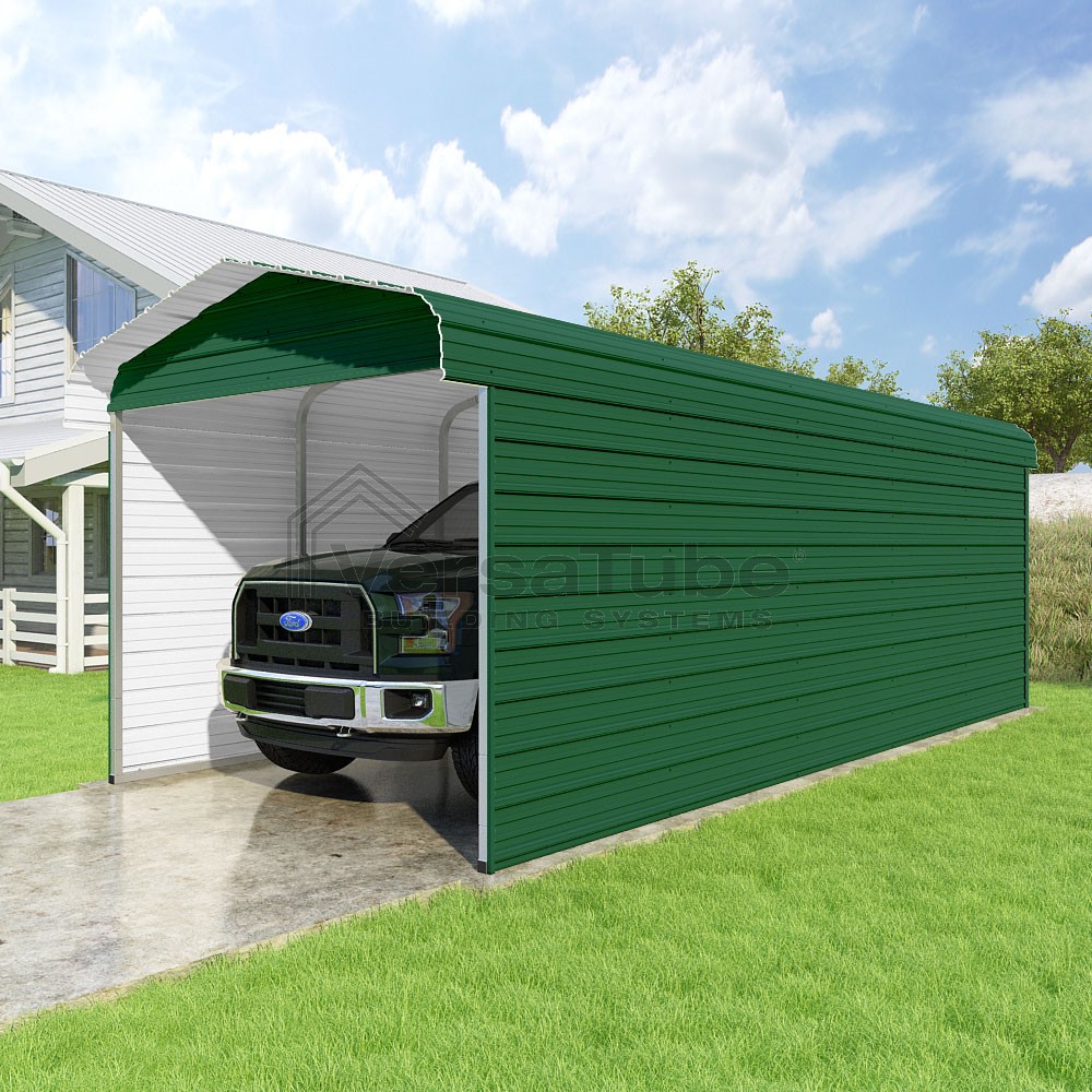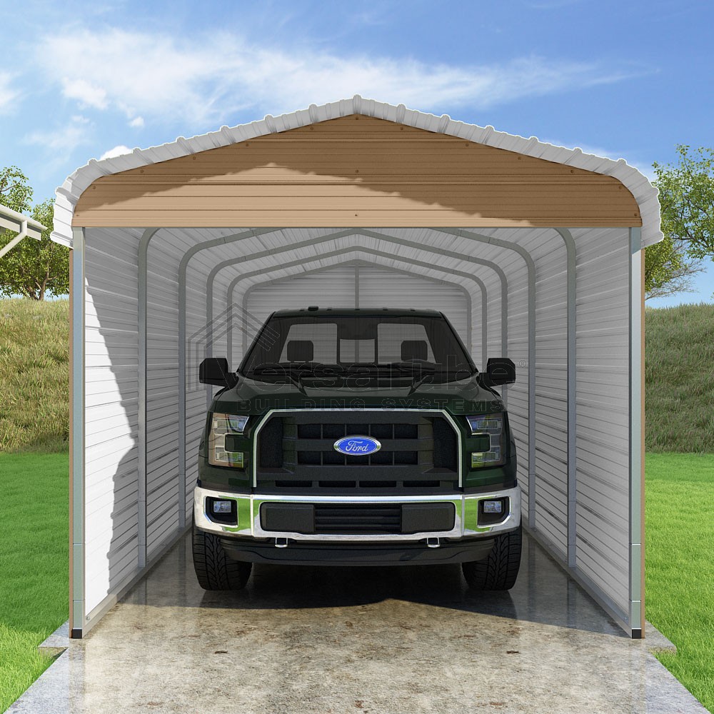 Classic Series DIY carport kit features horizontal application of sheet metal panels with the extra protection of rounded eaves.