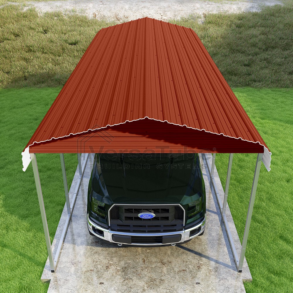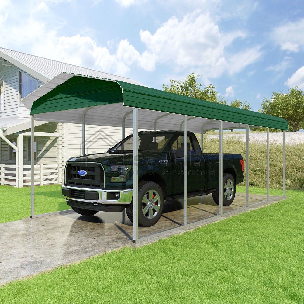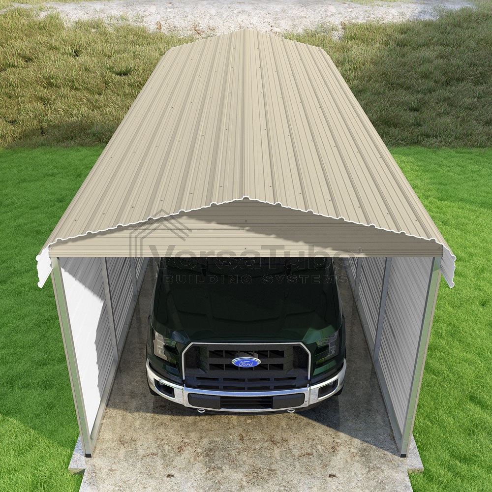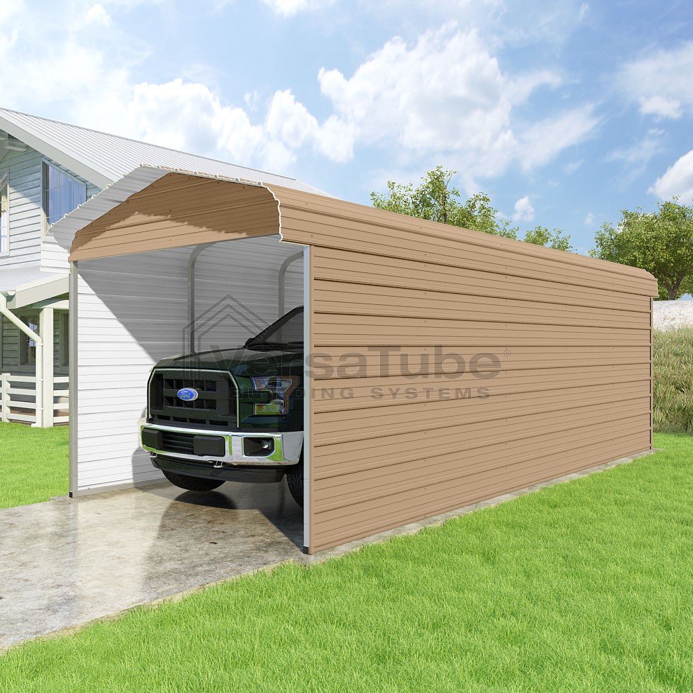 Classic Series DIY carport kit features horizontal application of sheet metal panels with the extra protection of rounded eaves.