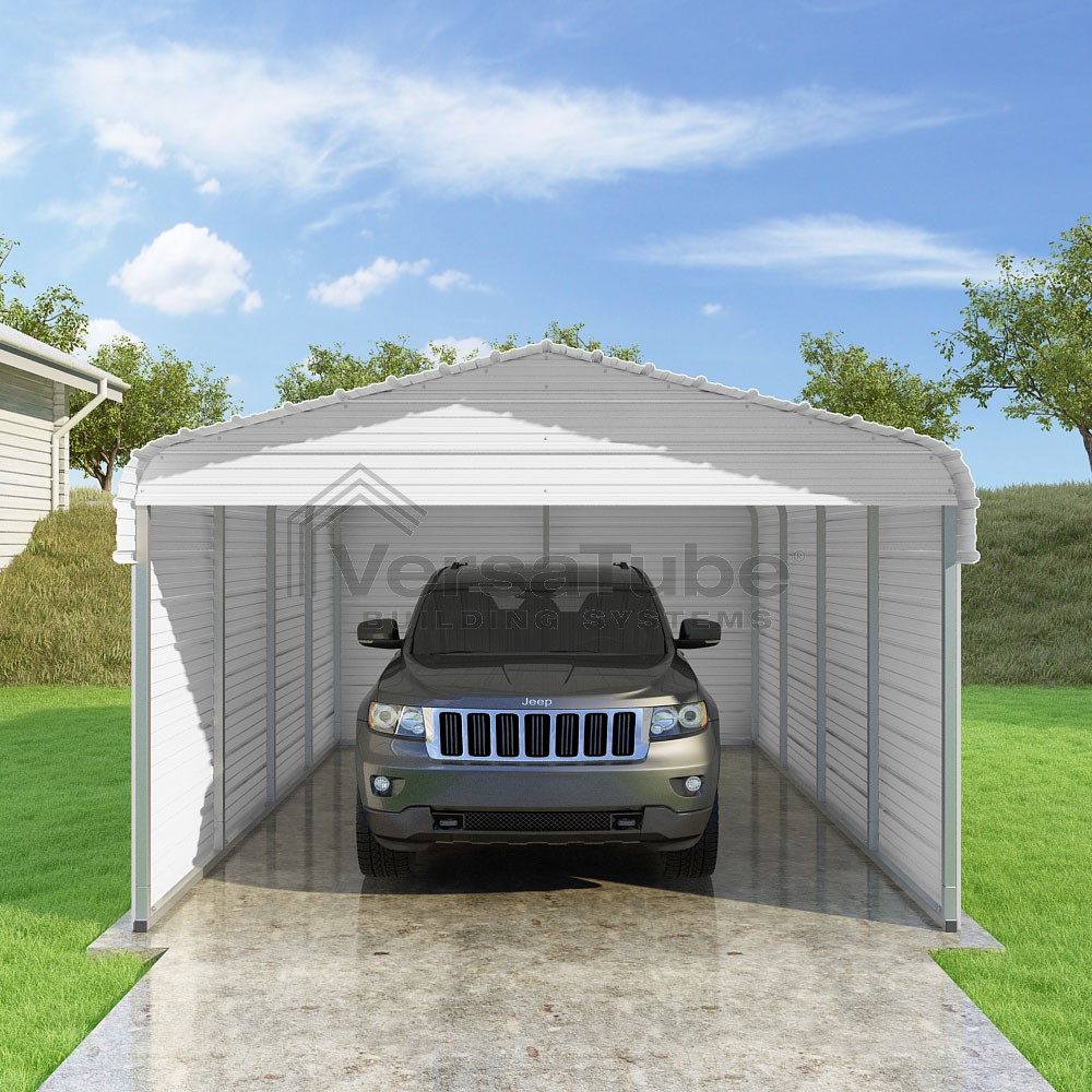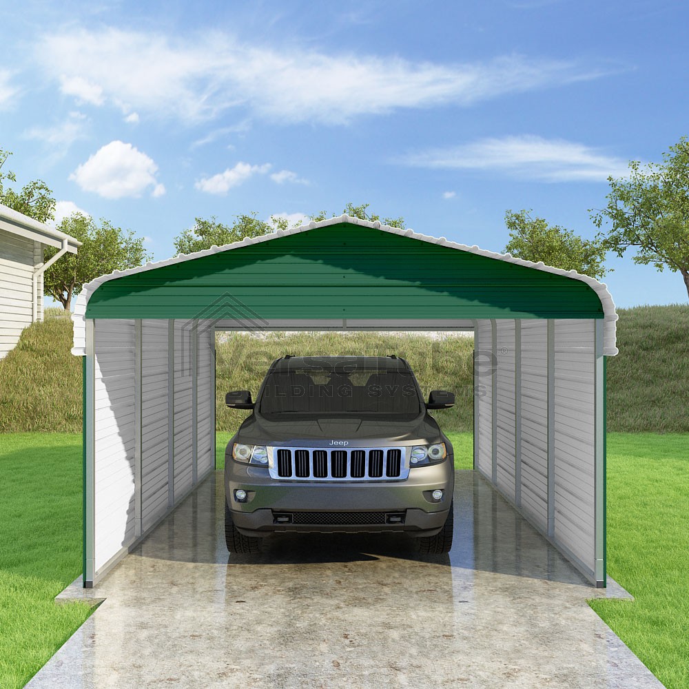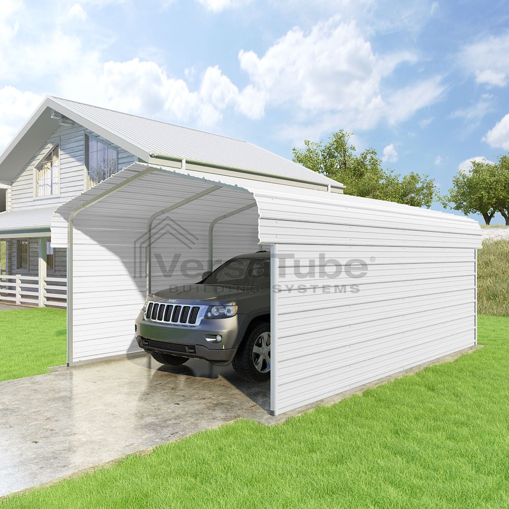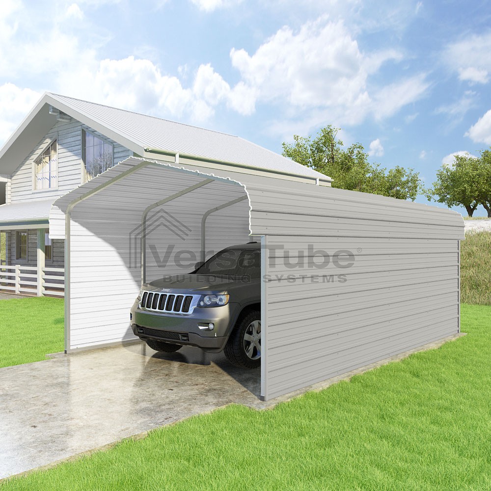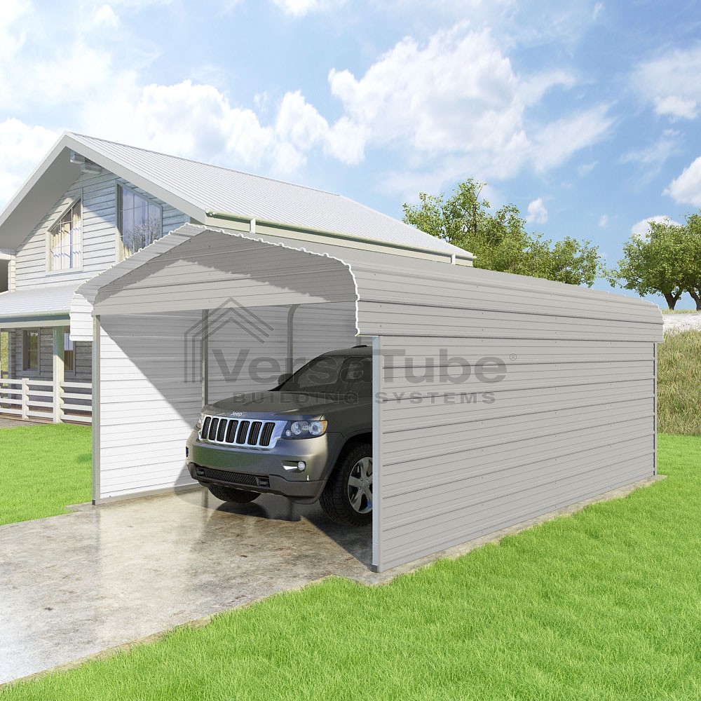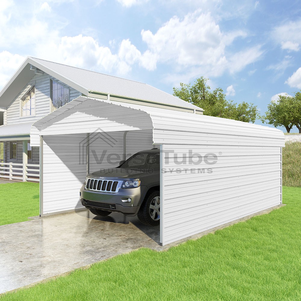 Classic Series DIY carport kit features horizontal application of sheet metal panels with the extra protection of rounded eaves.