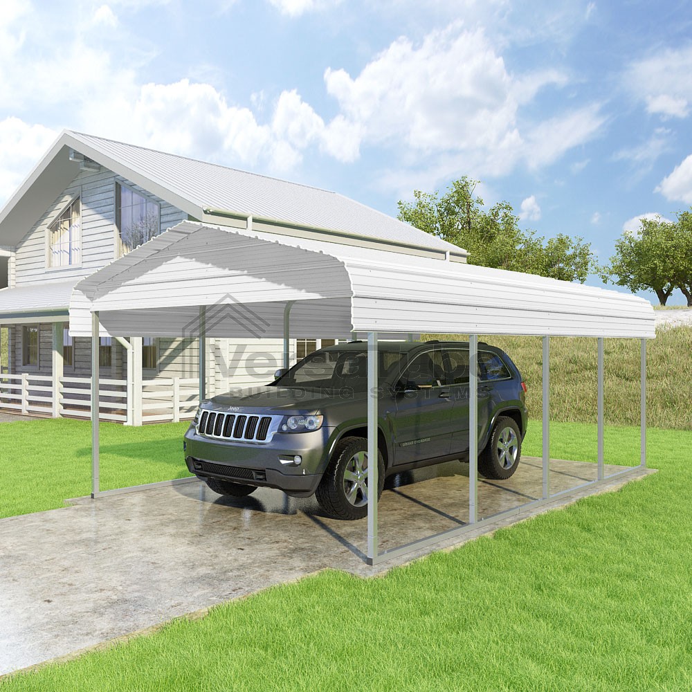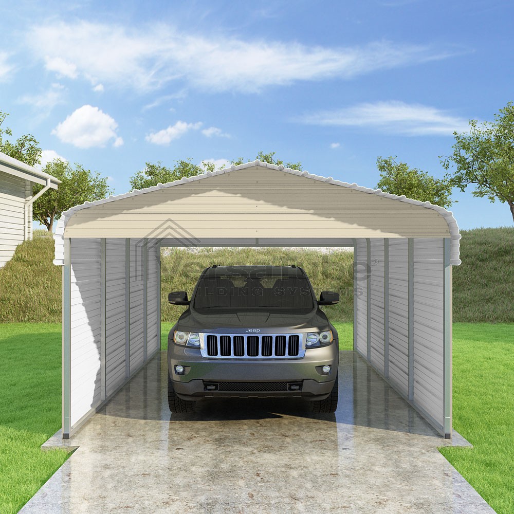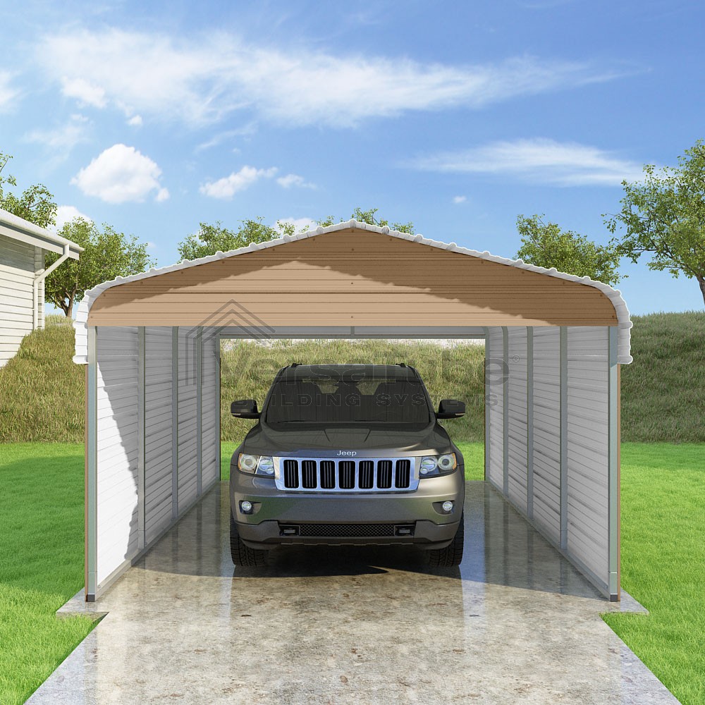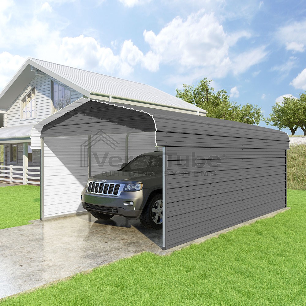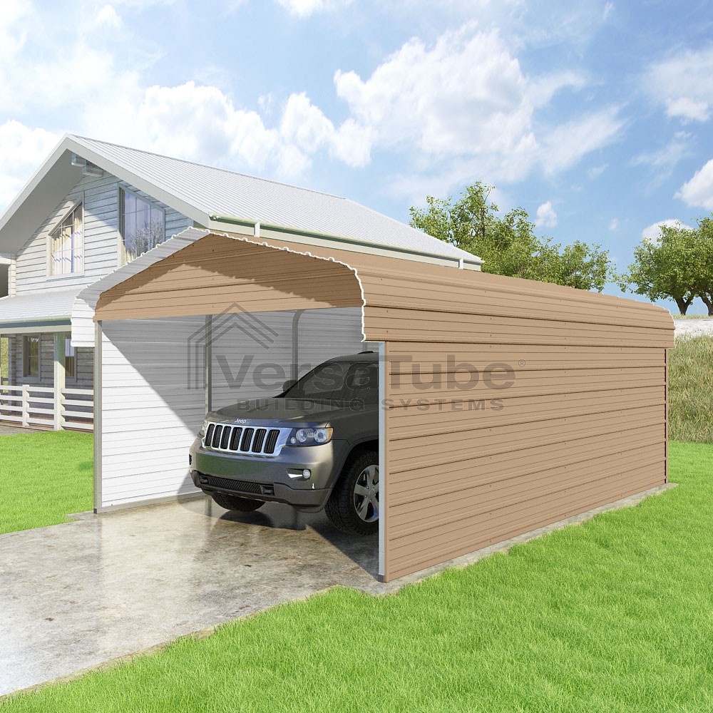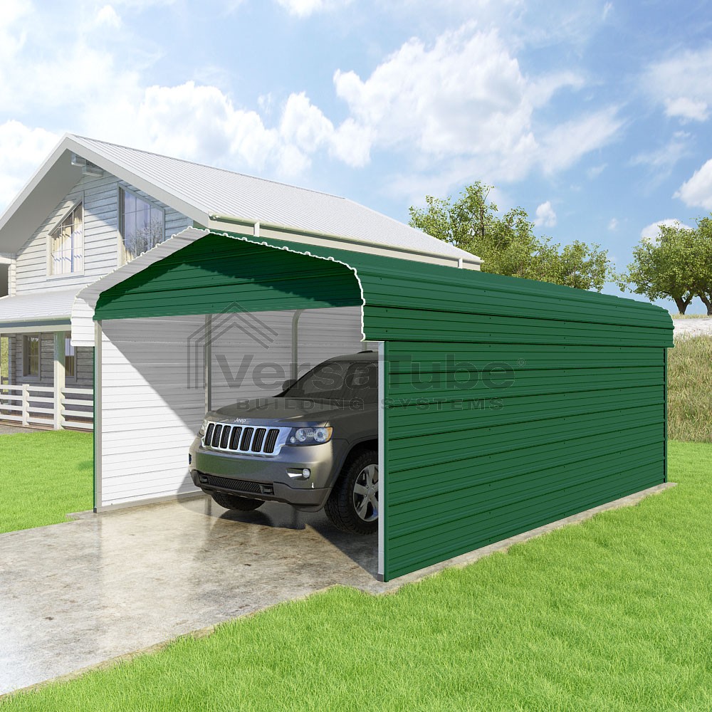 Classic Series DIY carport kit features horizontal application of sheet metal panels with the extra protection of rounded eaves.
