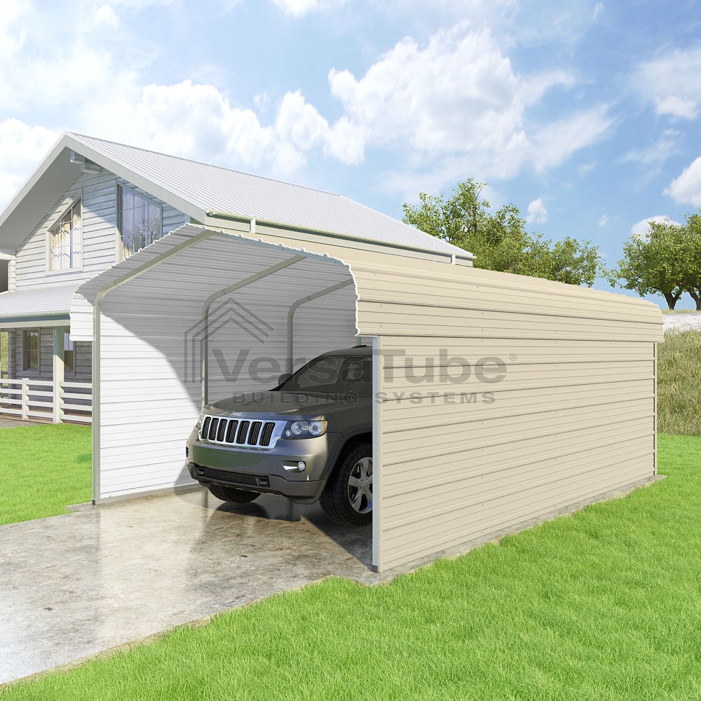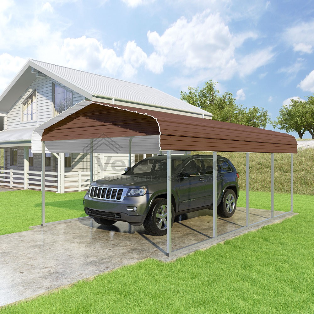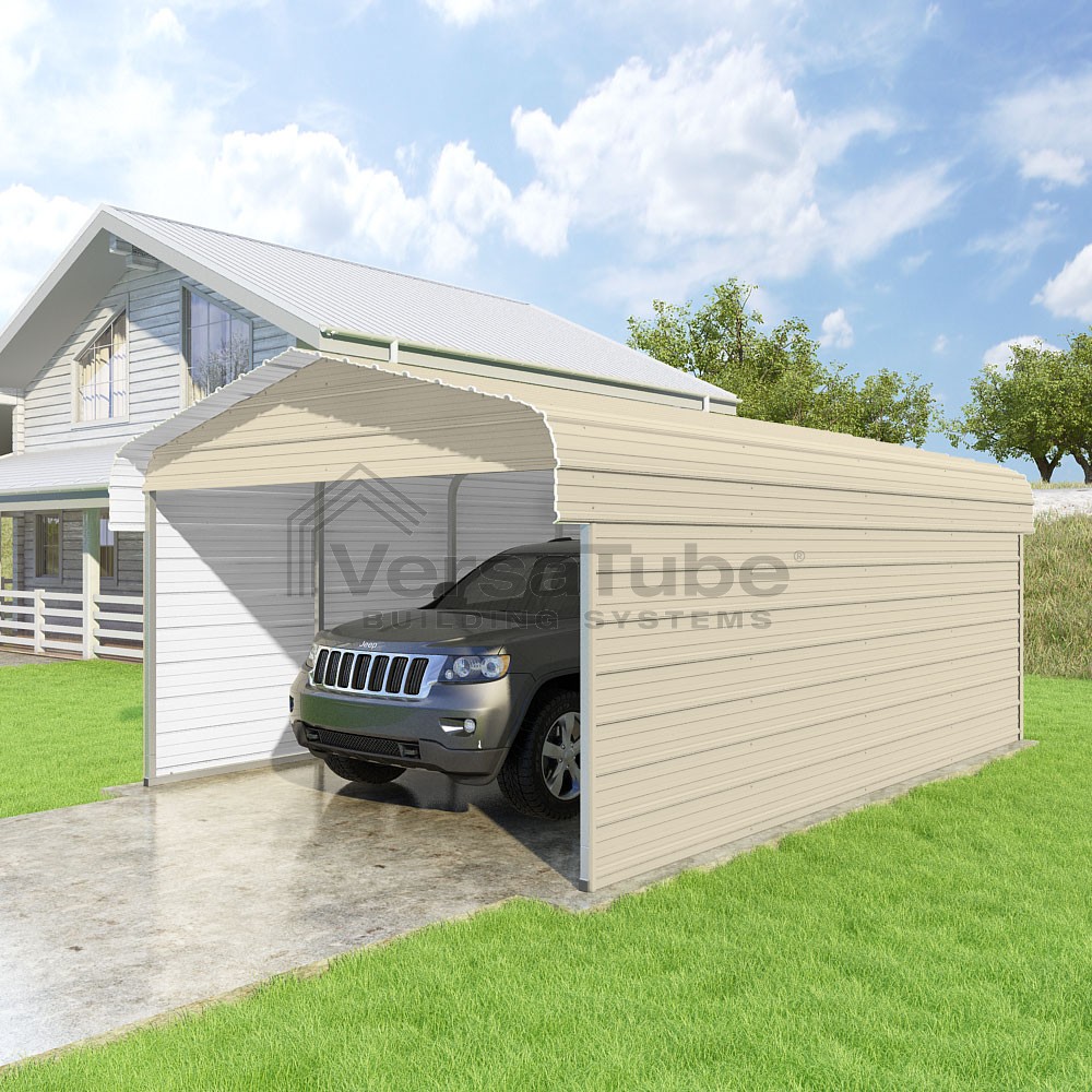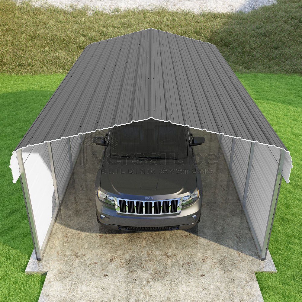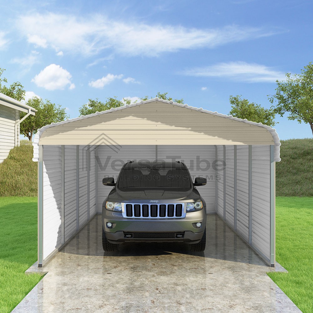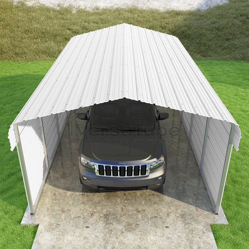 Classic Series DIY carport kit features horizontal application of sheet metal panels with the extra protection of rounded eaves.
