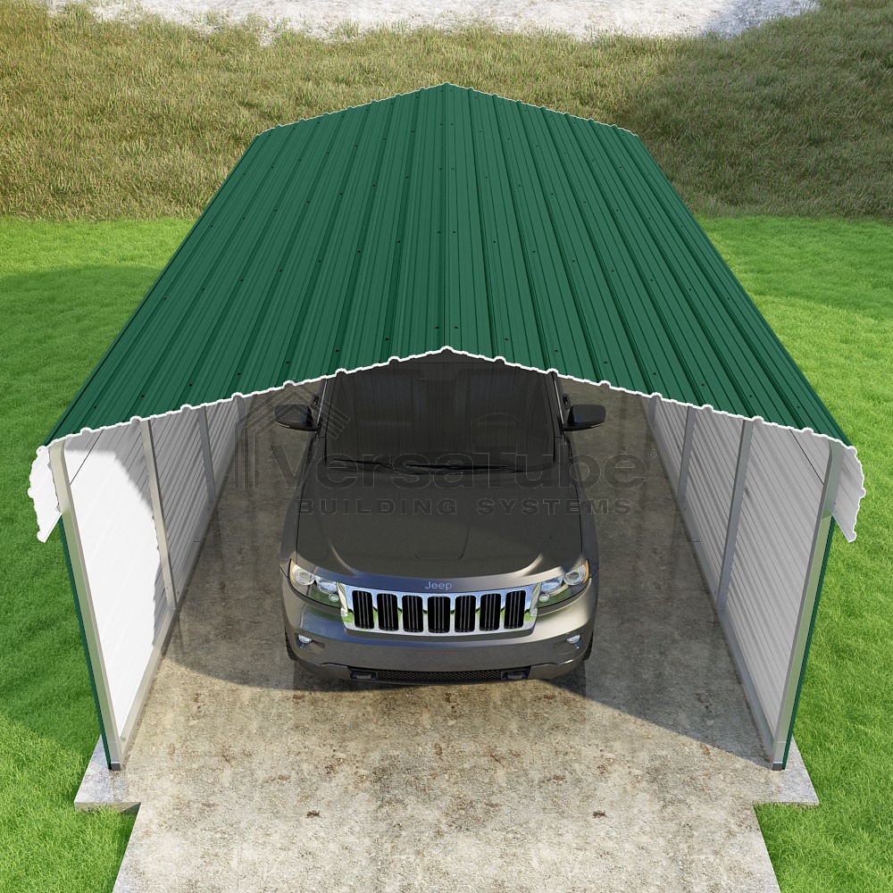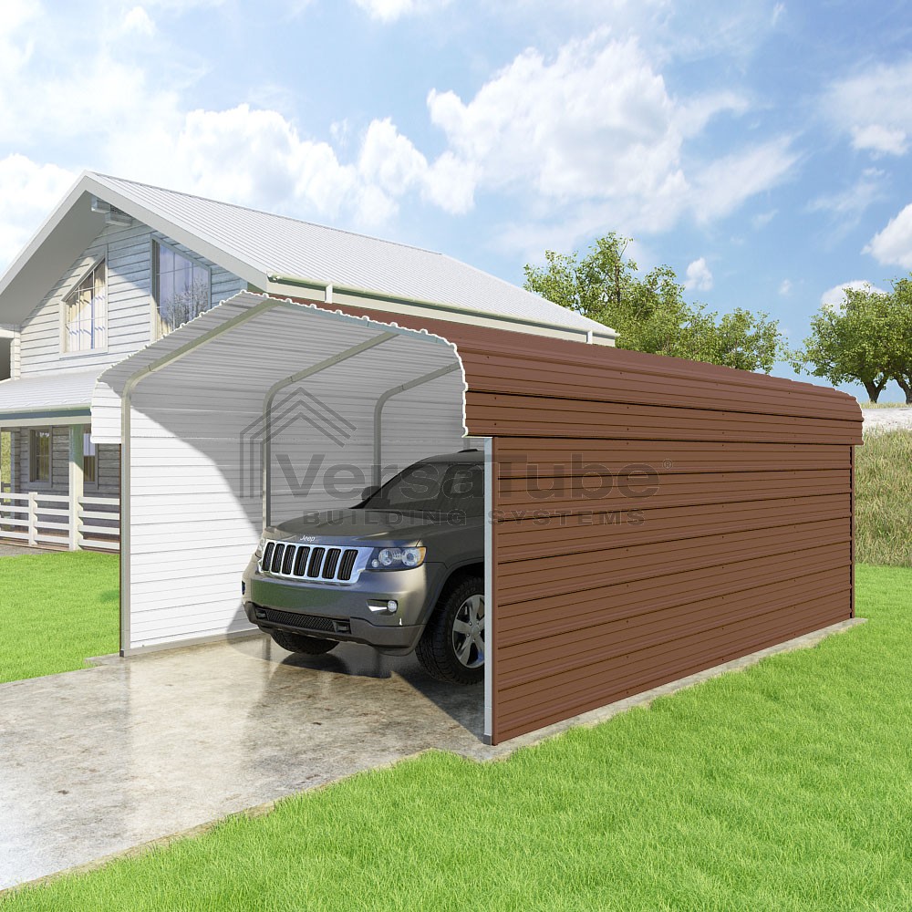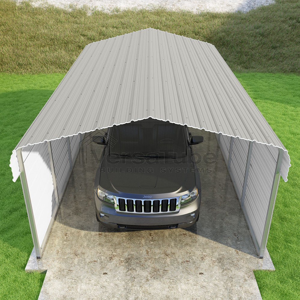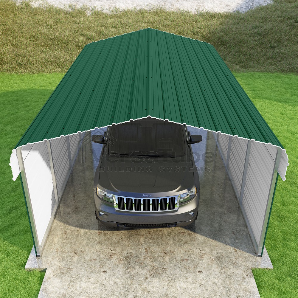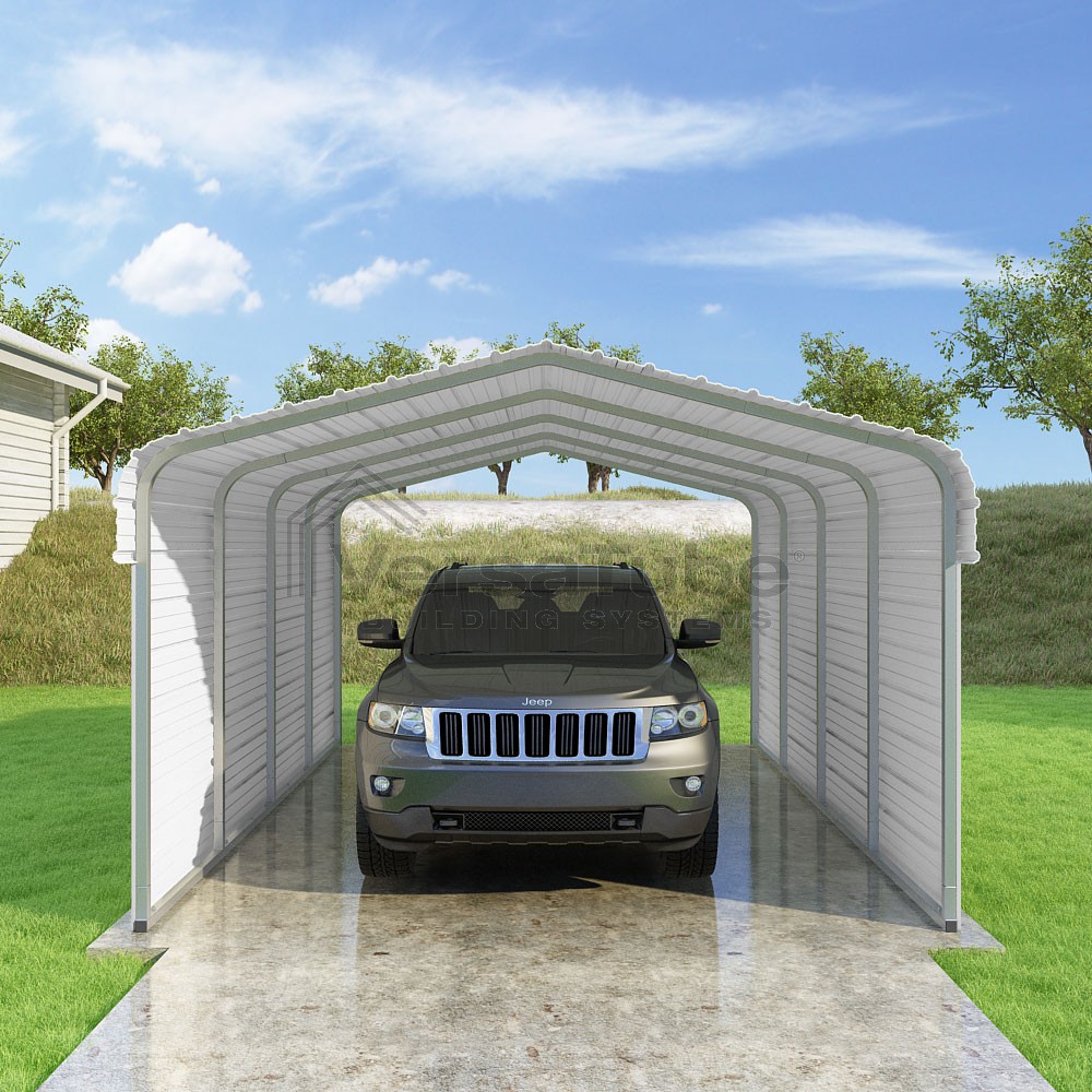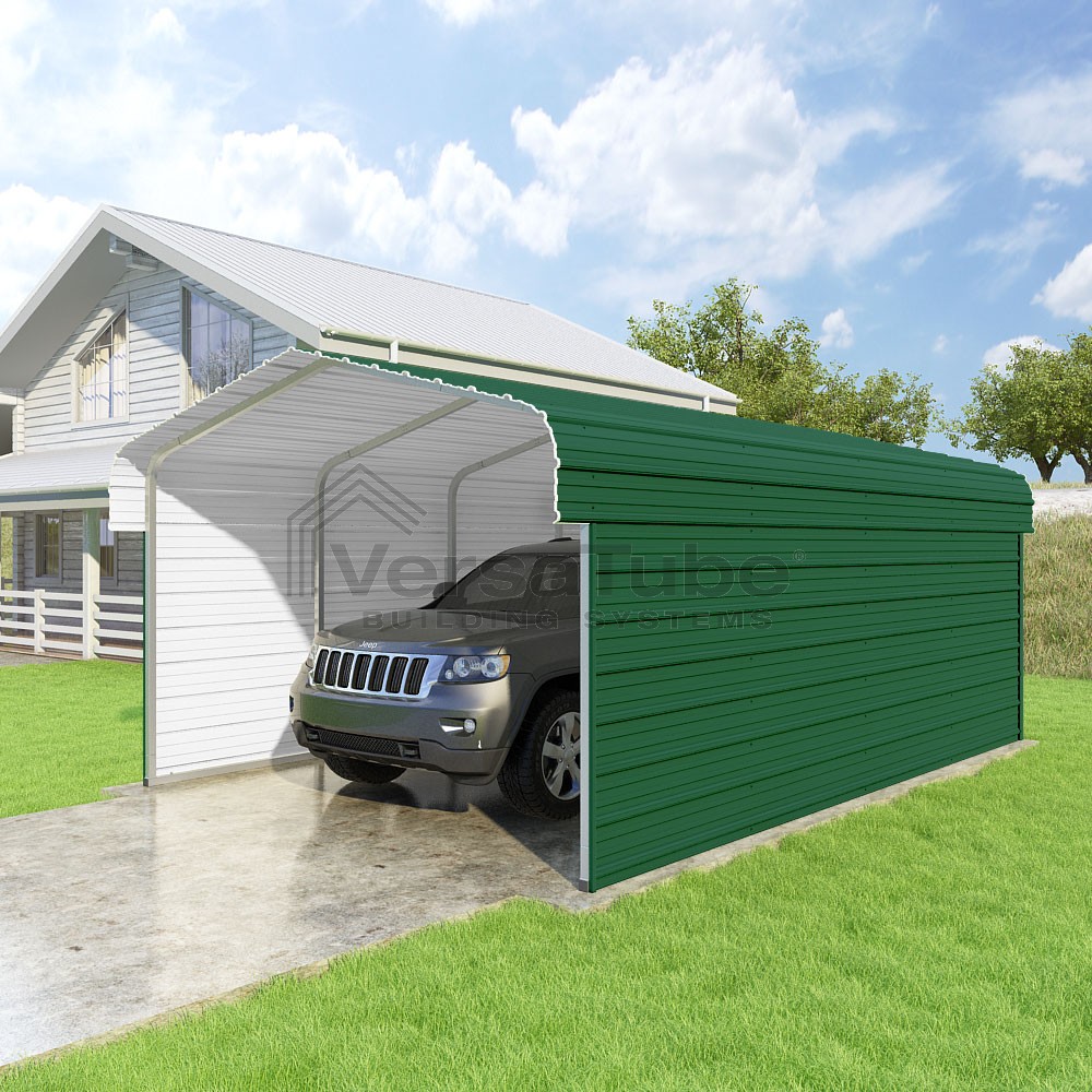 Classic Series DIY carport kit features horizontal application of sheet metal panels with the extra protection of rounded eaves.
