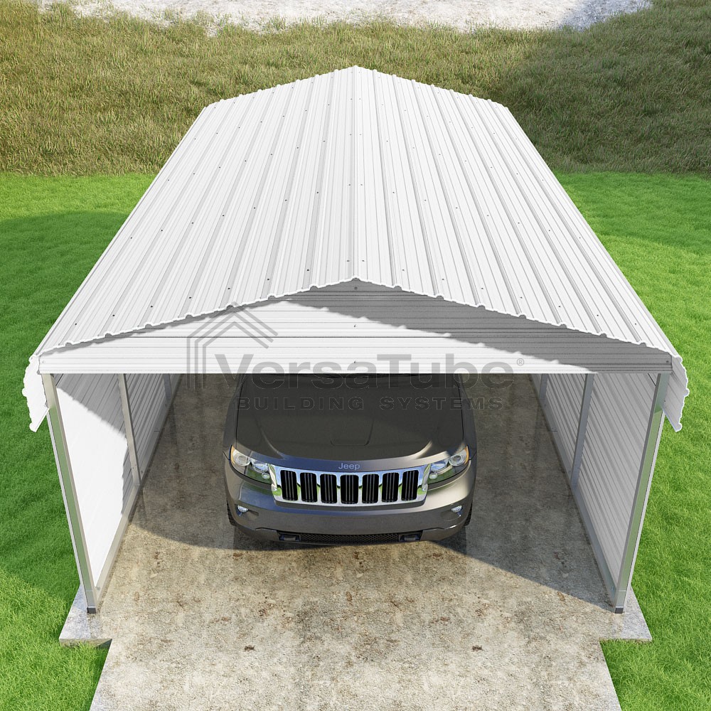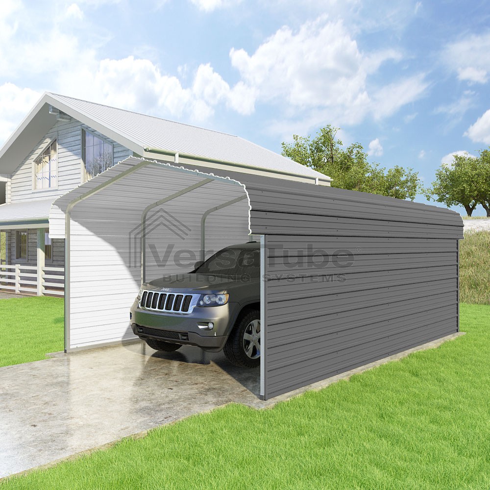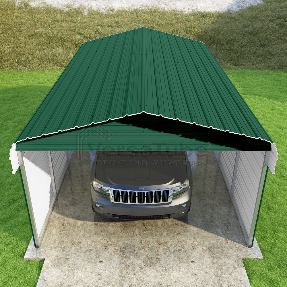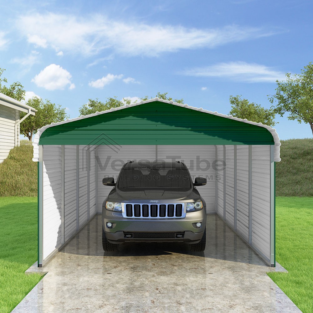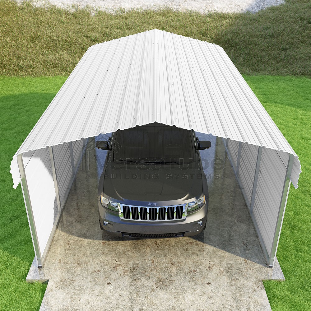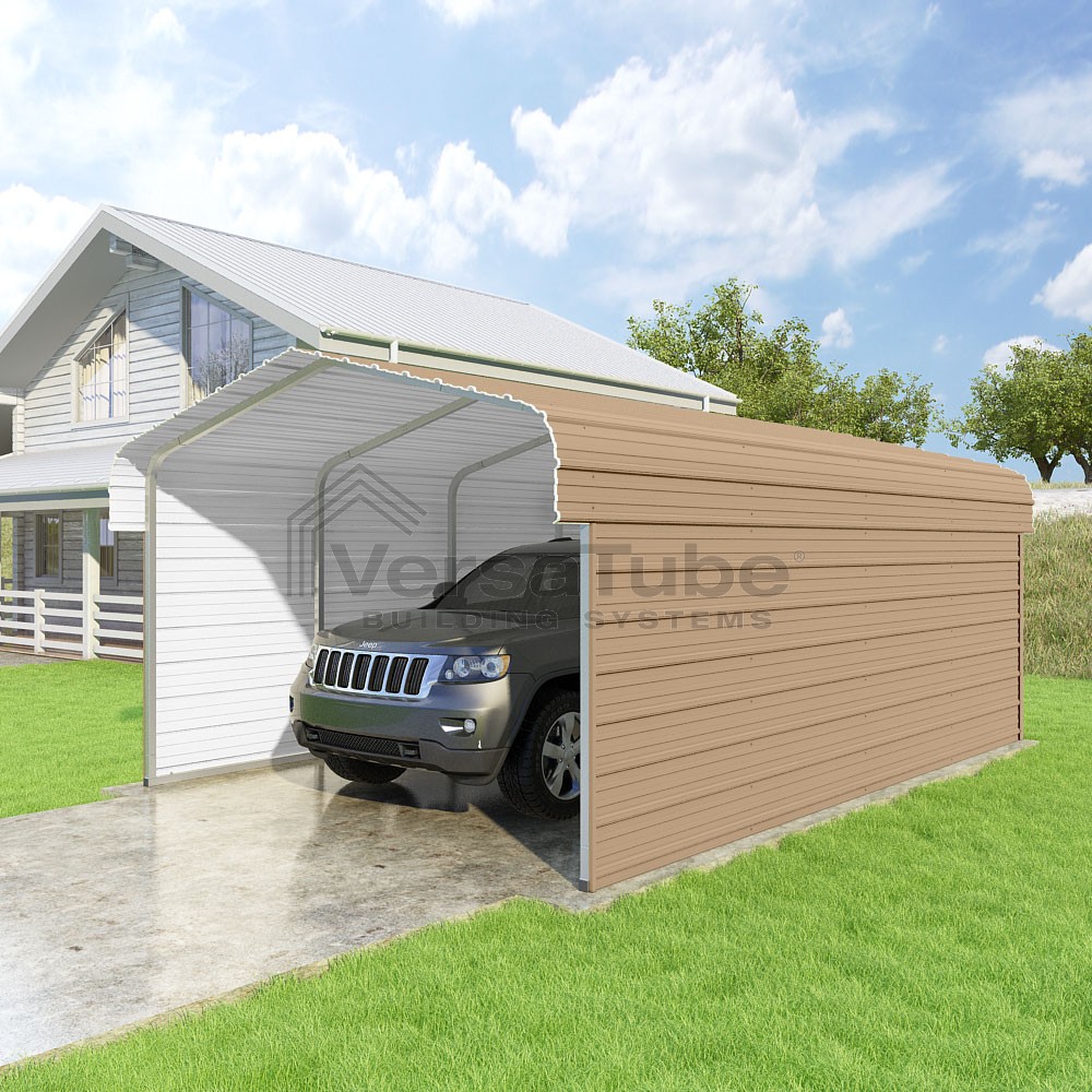 Classic Series DIY carport kit features horizontal application of sheet metal panels with the extra protection of rounded eaves.