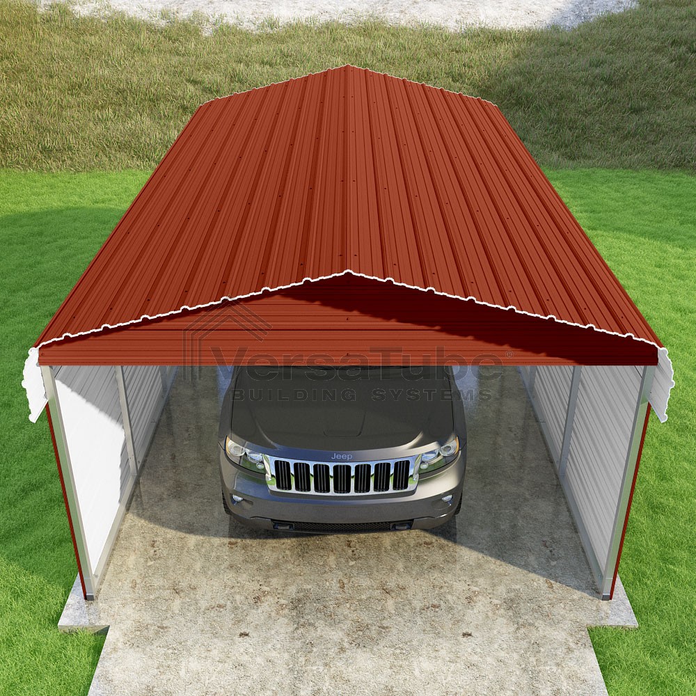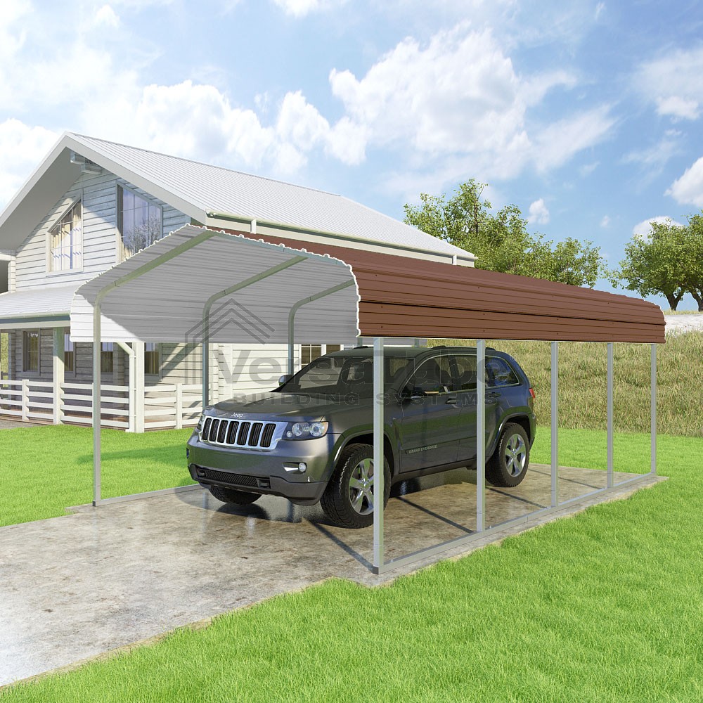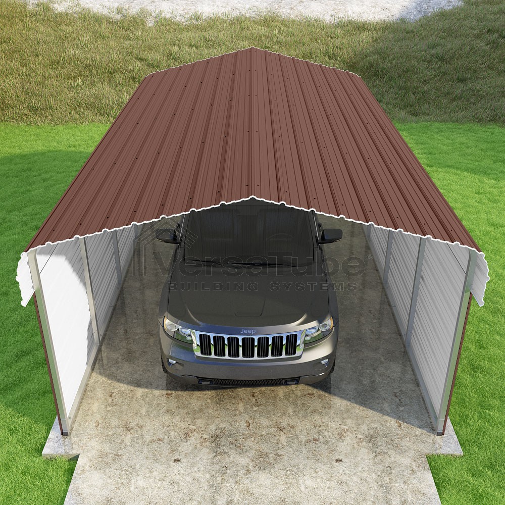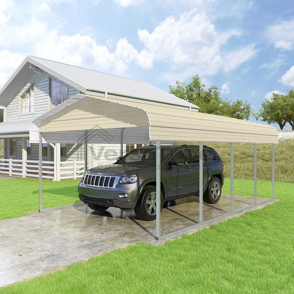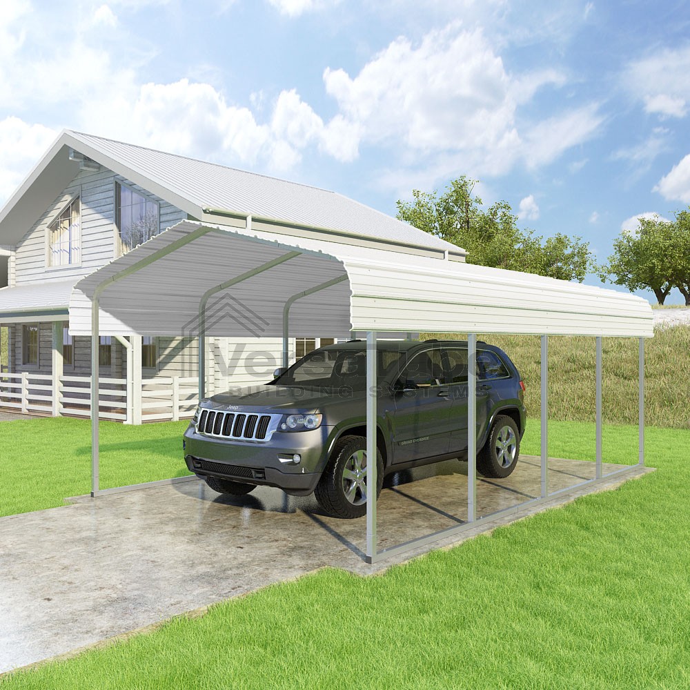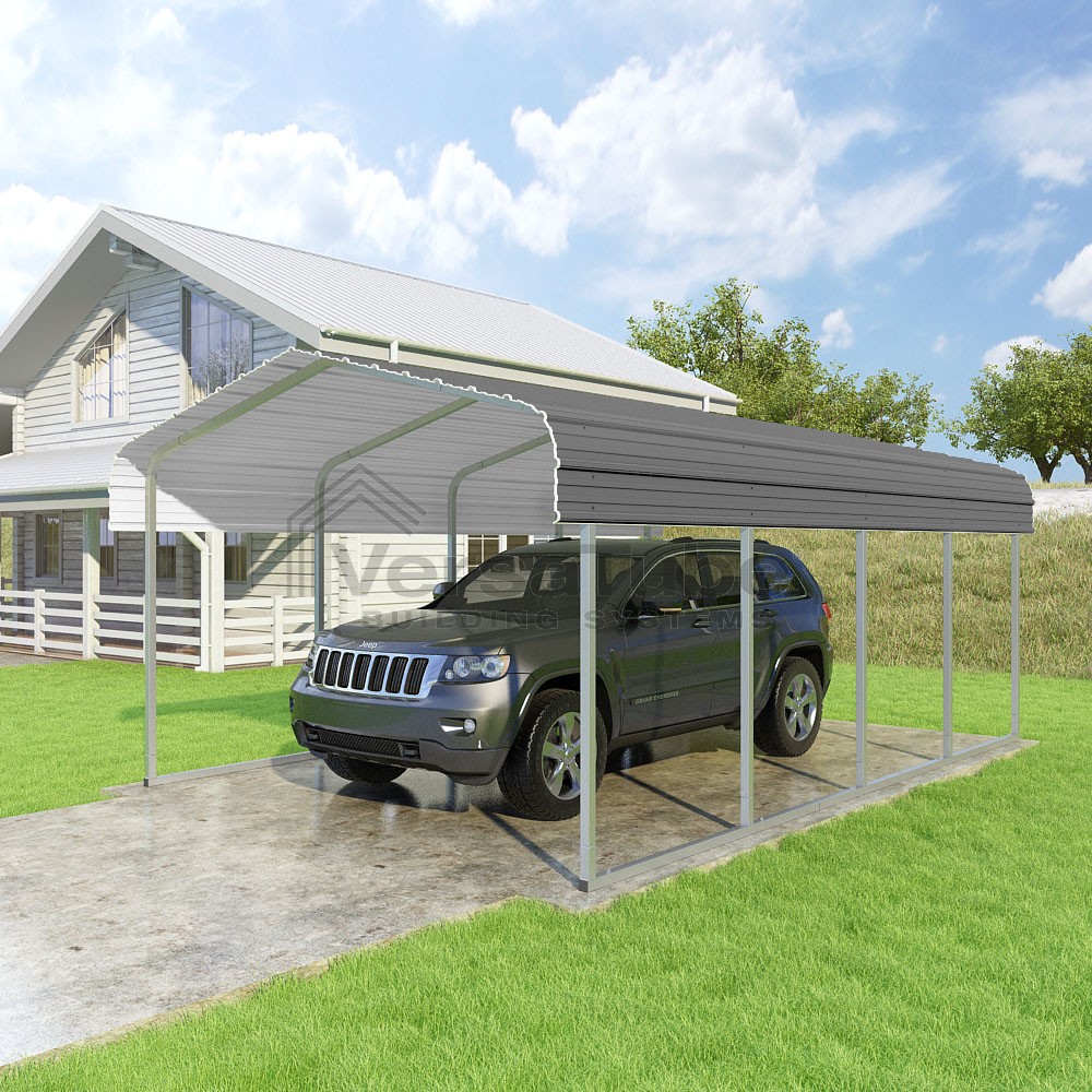 Classic Series DIY carport kit features horizontal application of sheet metal panels with the extra protection of rounded eaves.