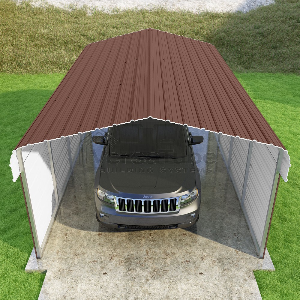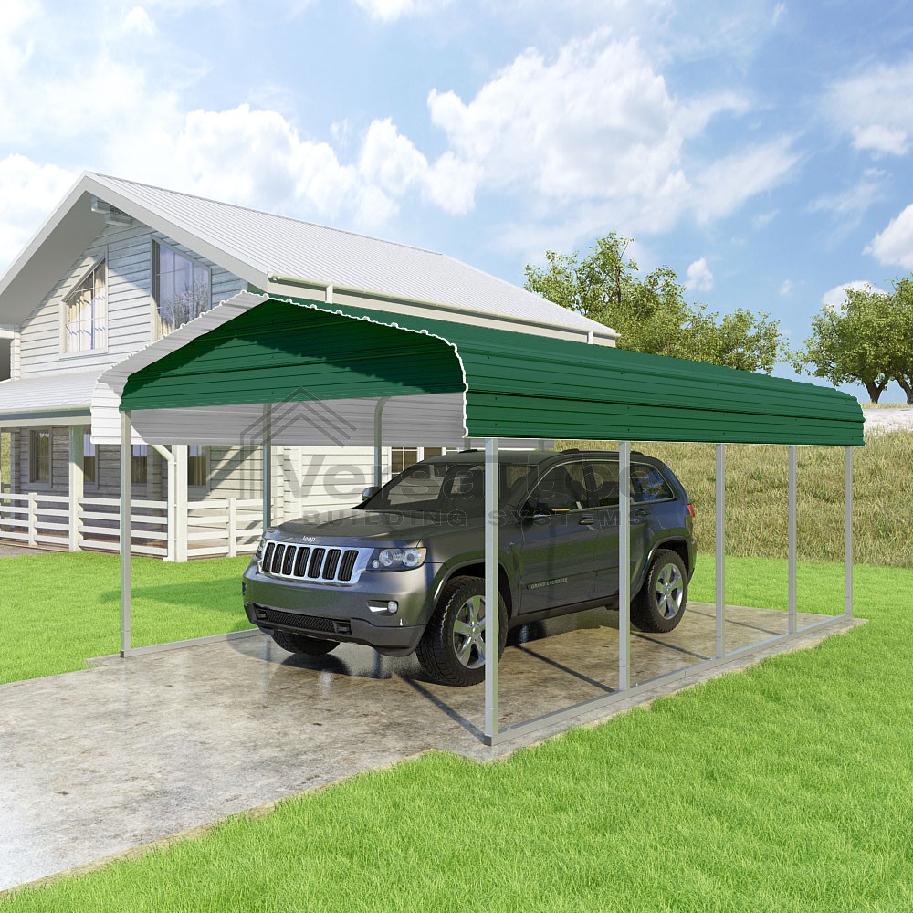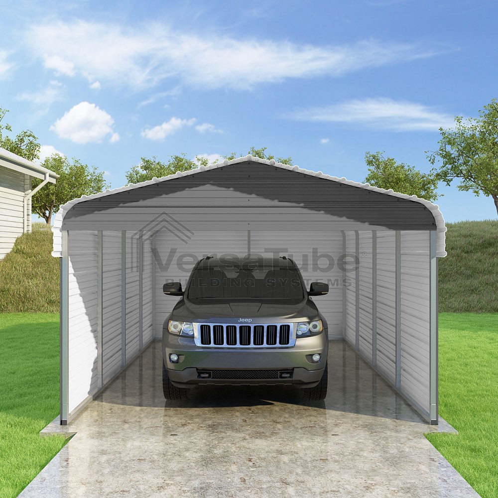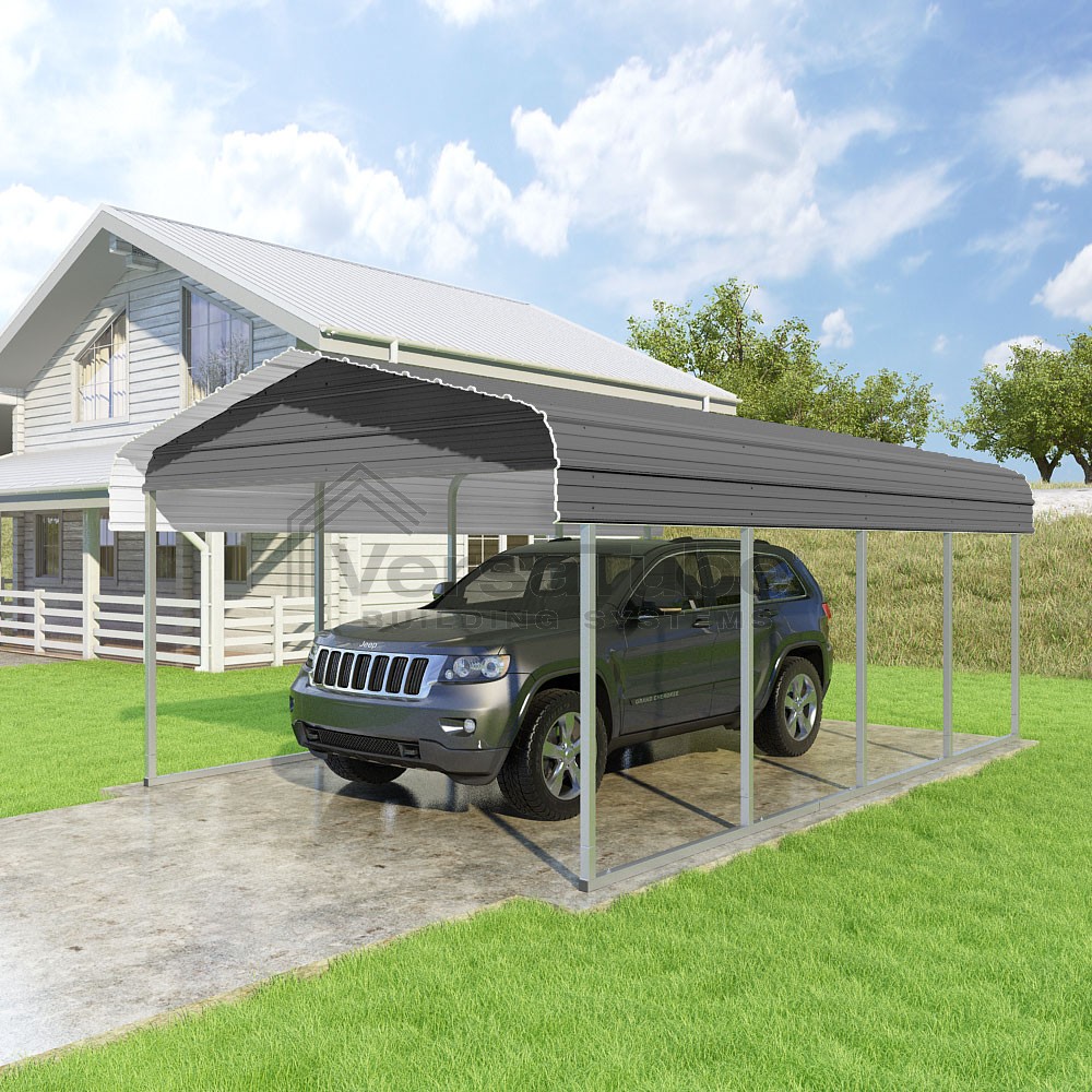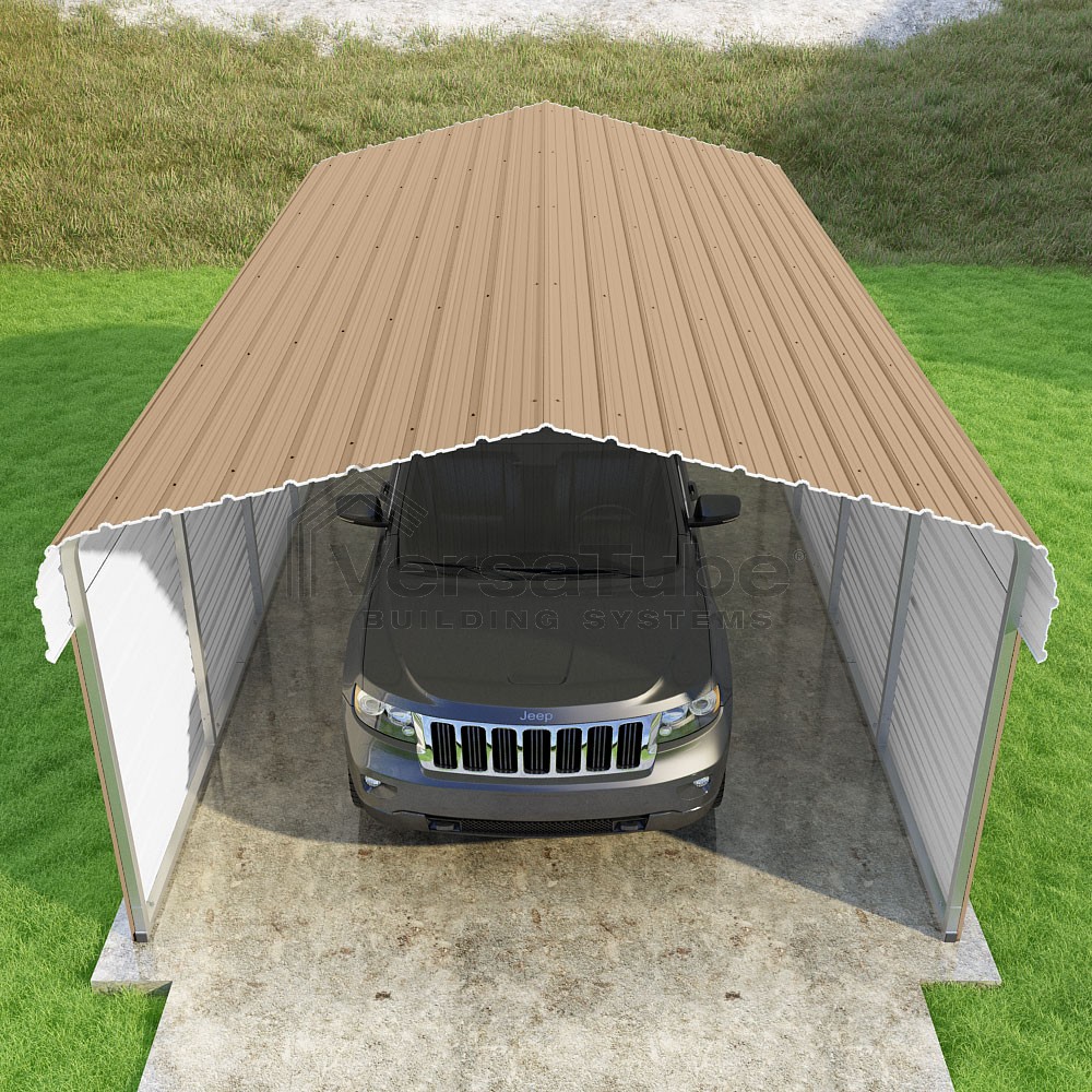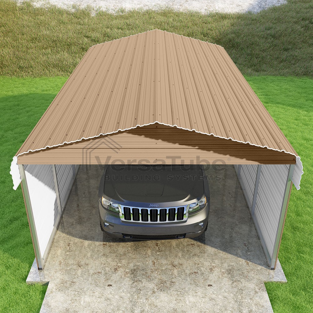 Classic Series DIY carport kit features horizontal application of sheet metal panels with the extra protection of rounded eaves.