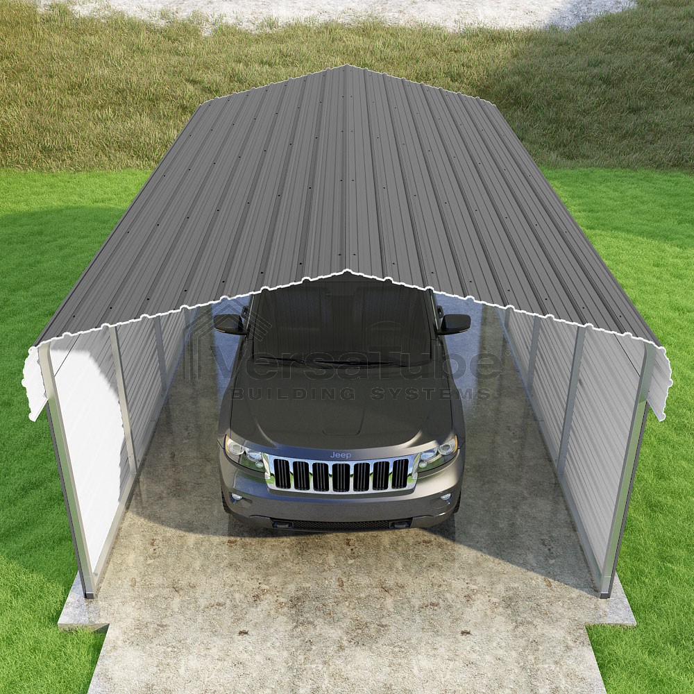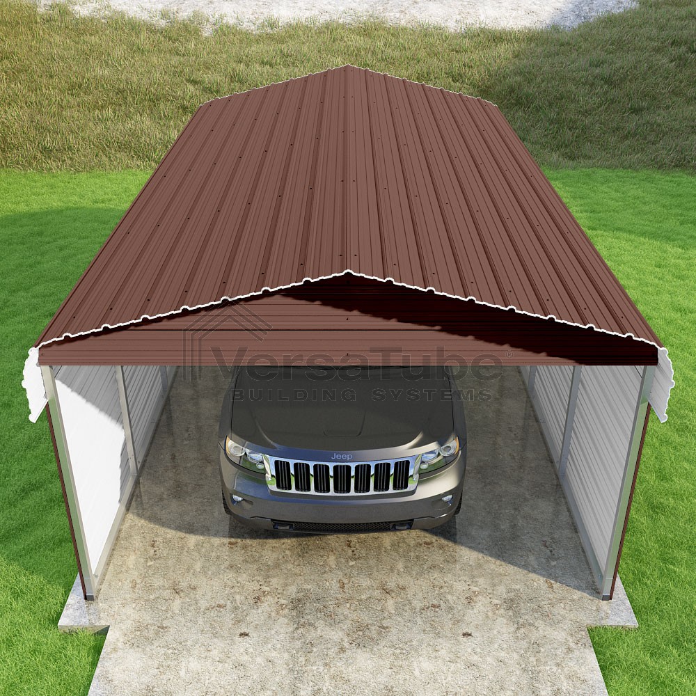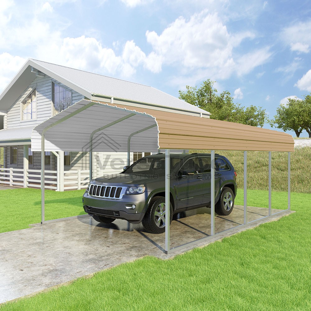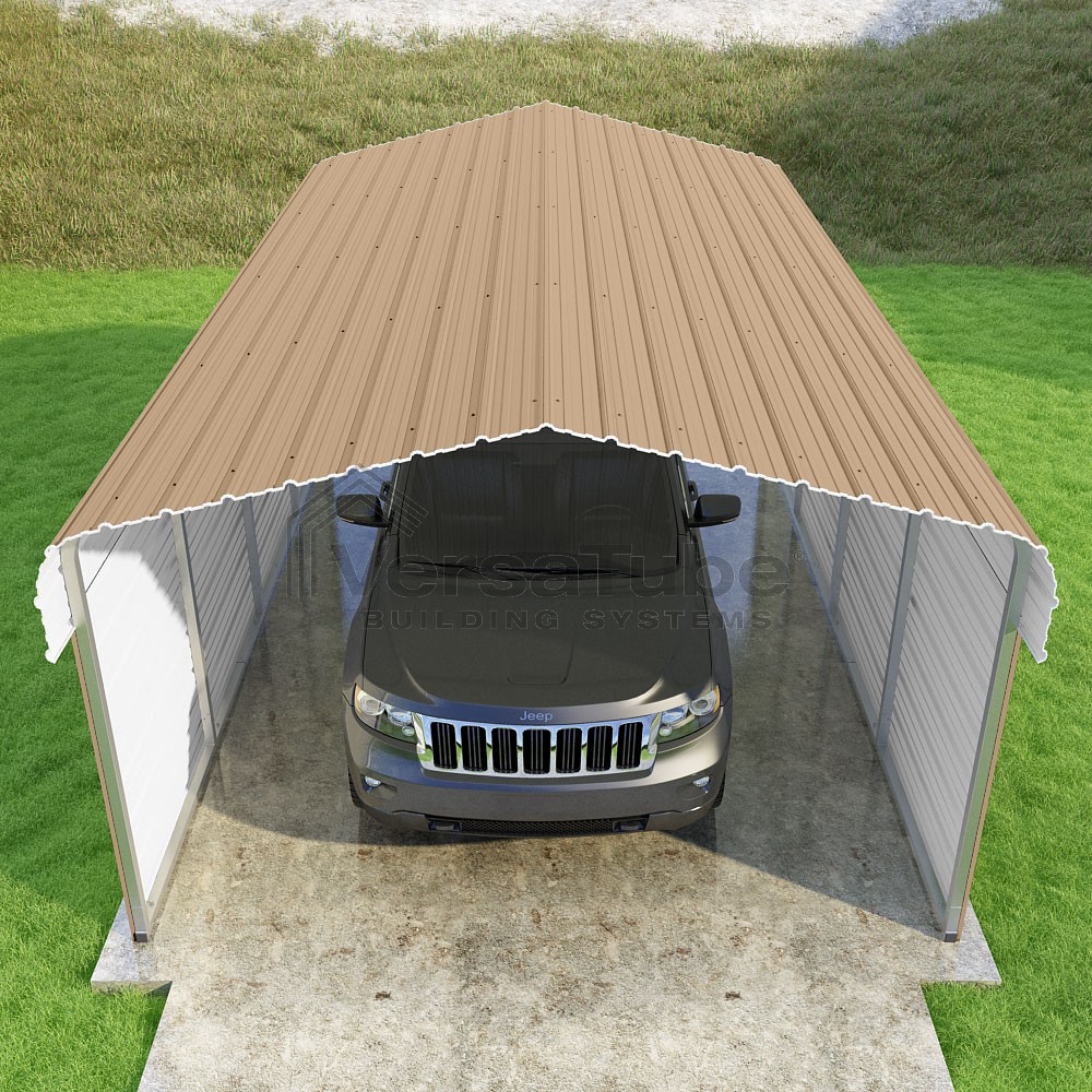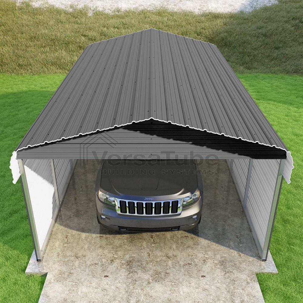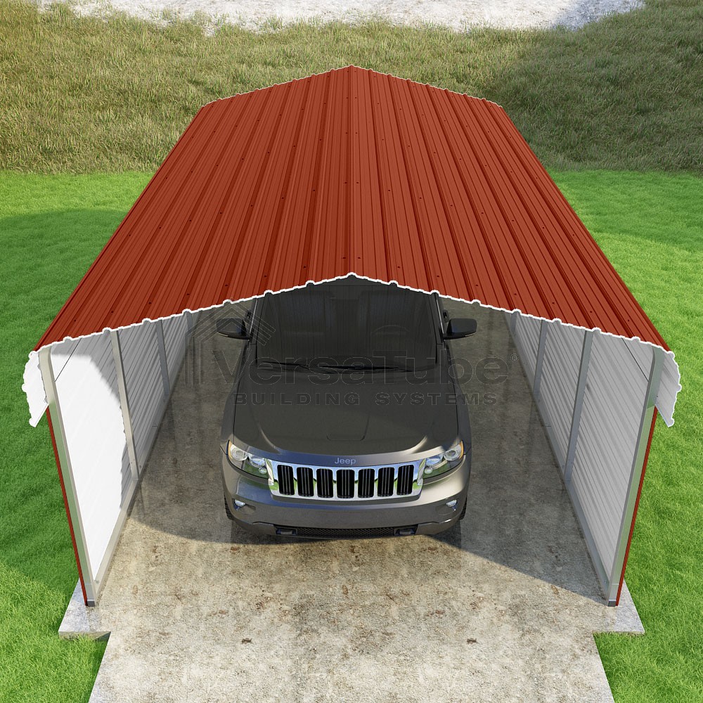 Classic Series DIY carport kit features horizontal application of sheet metal panels with the extra protection of rounded eaves.