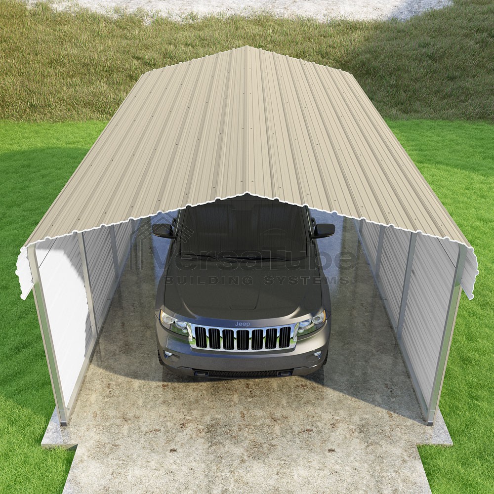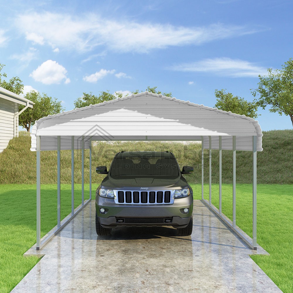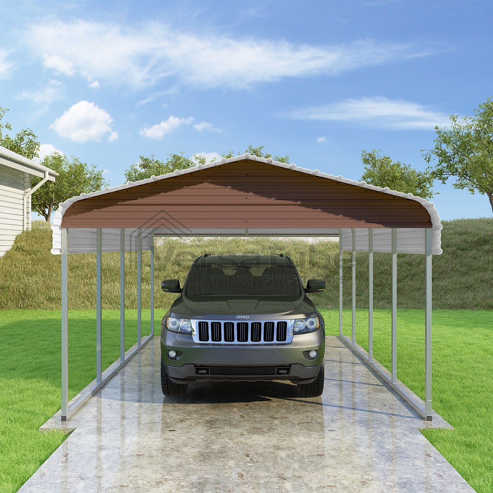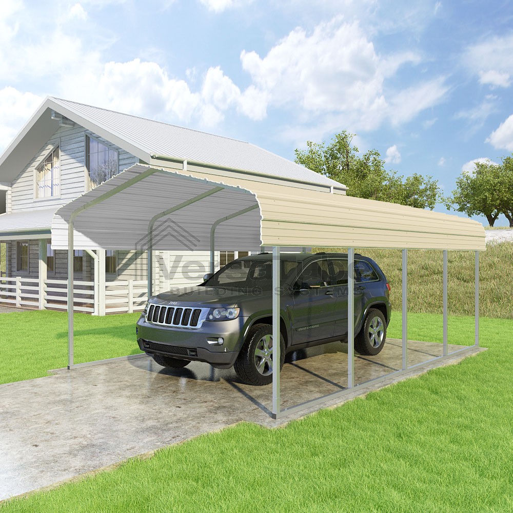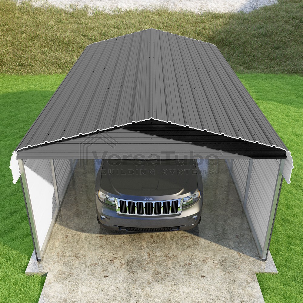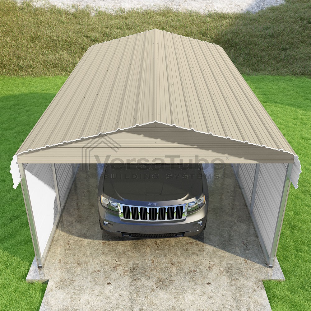 Classic Series DIY carport kit features horizontal application of sheet metal panels with the extra protection of rounded eaves.