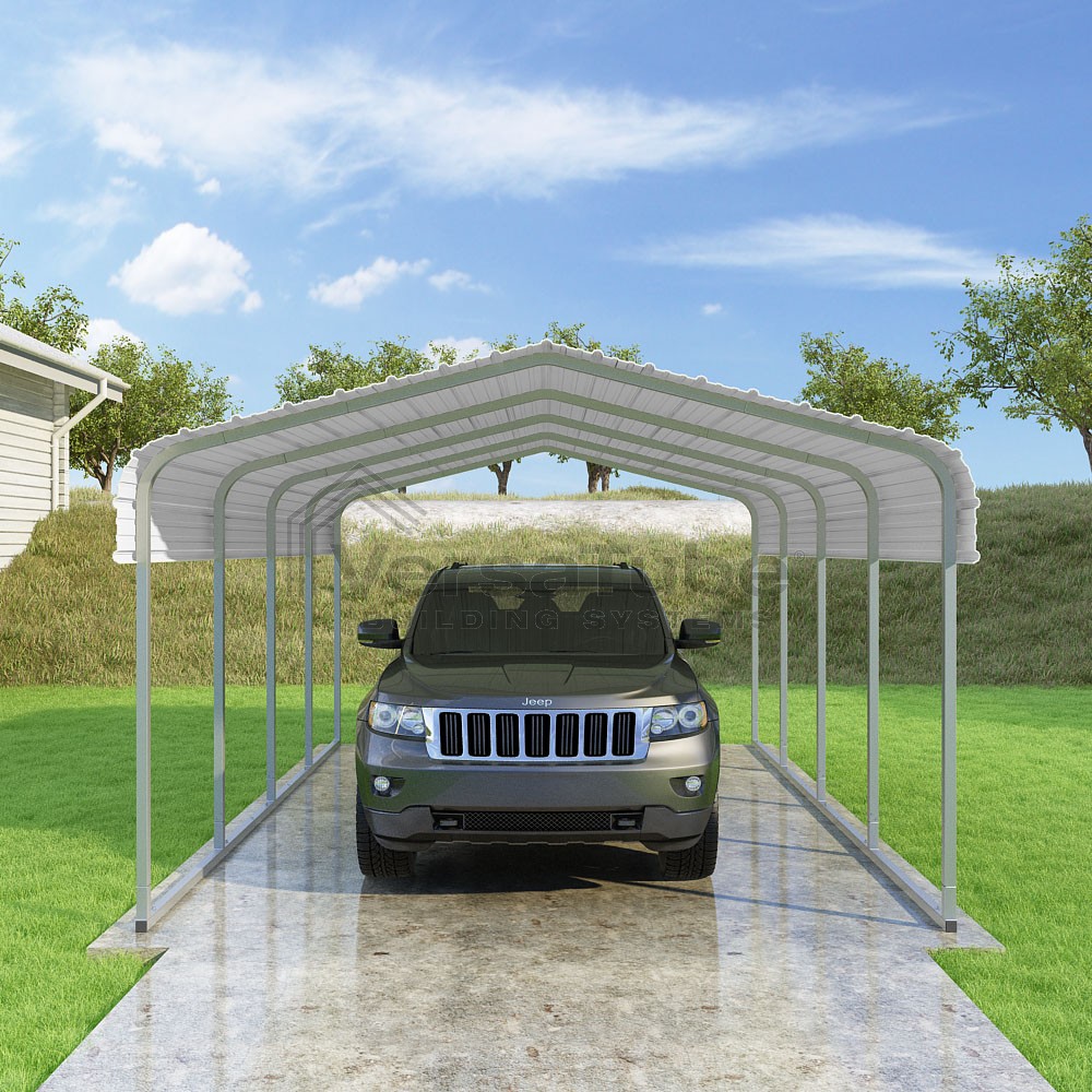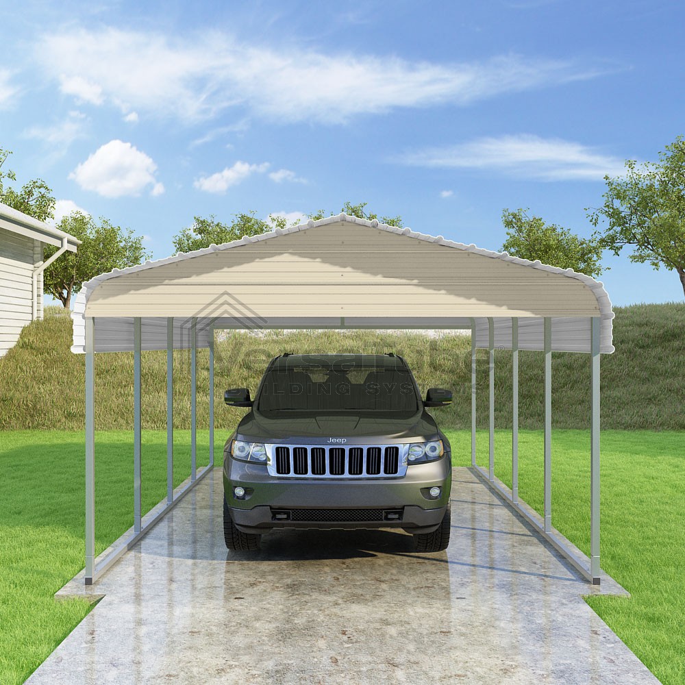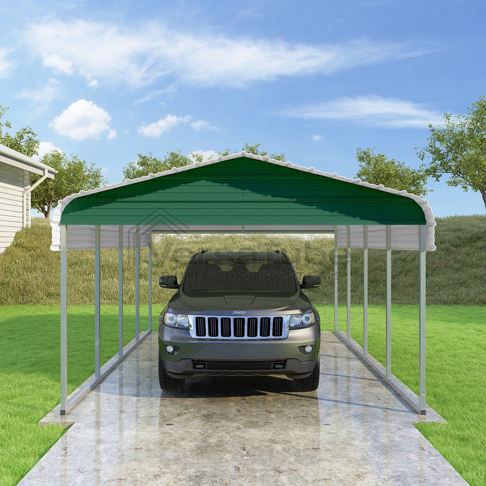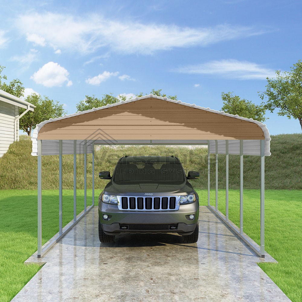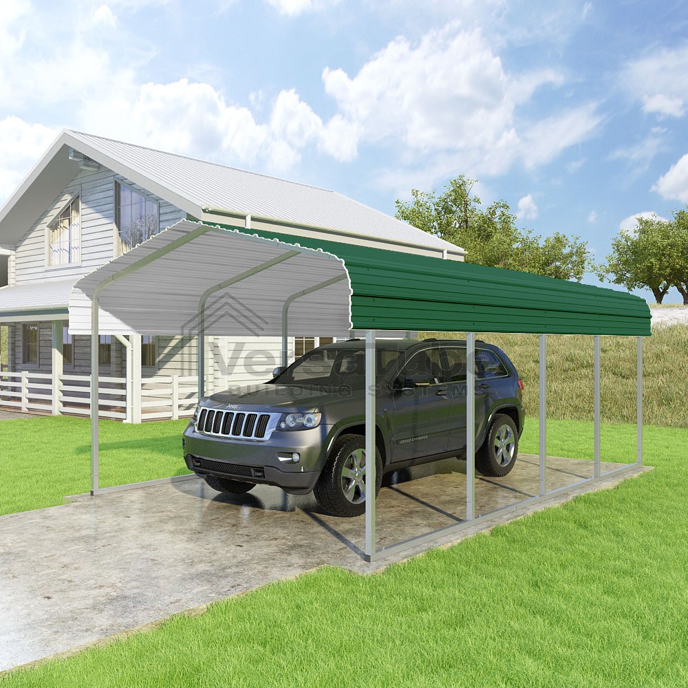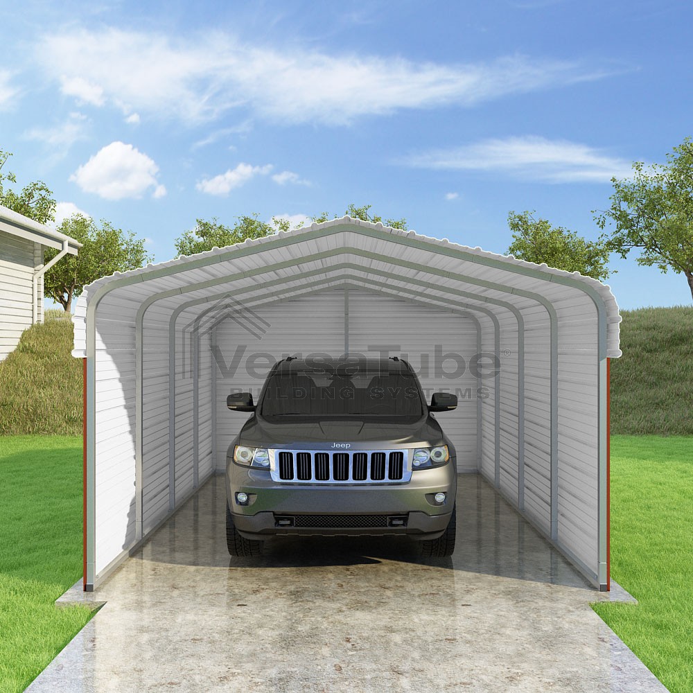 Classic Series DIY carport kit features horizontal application of sheet metal panels with the extra protection of rounded eaves.