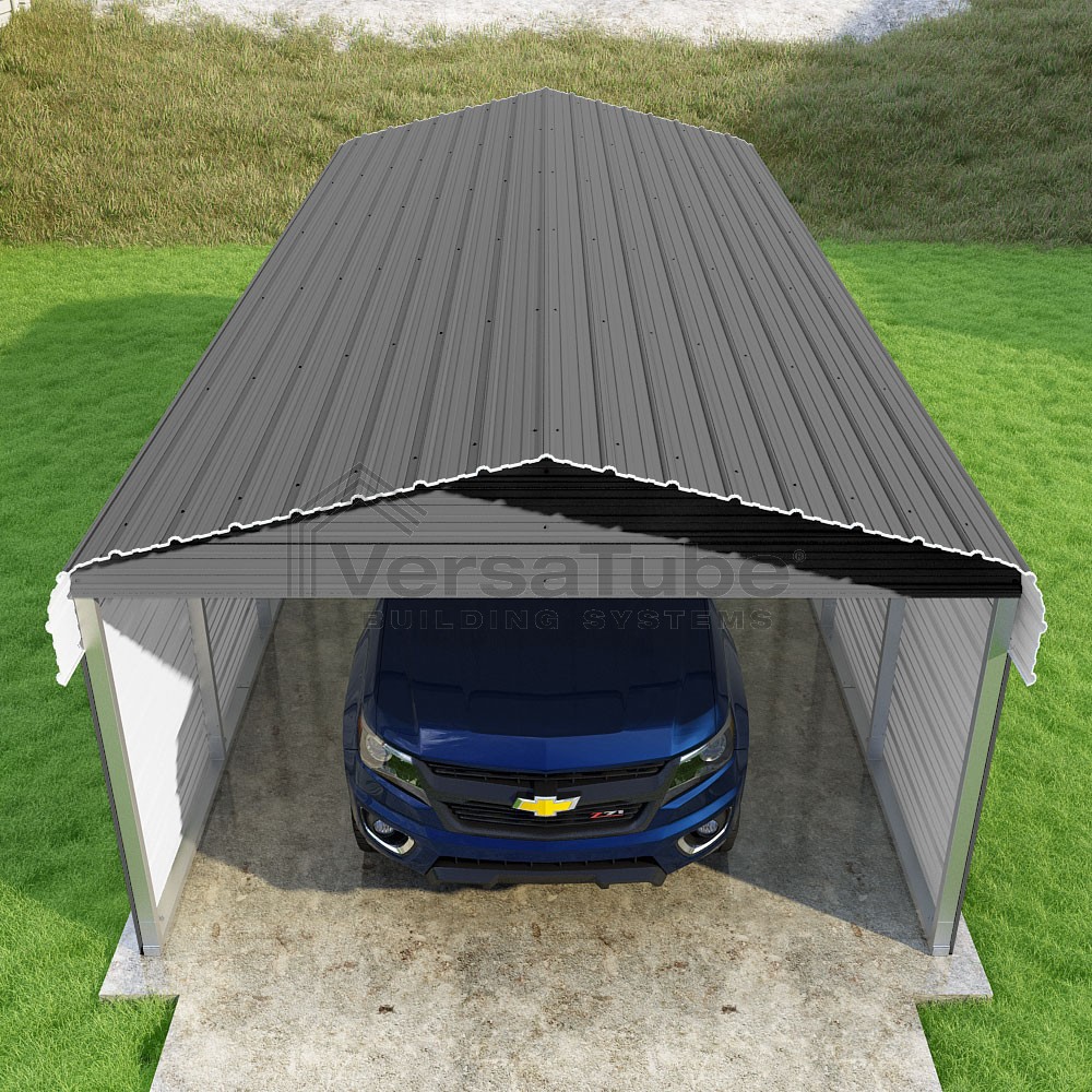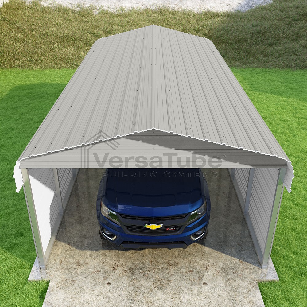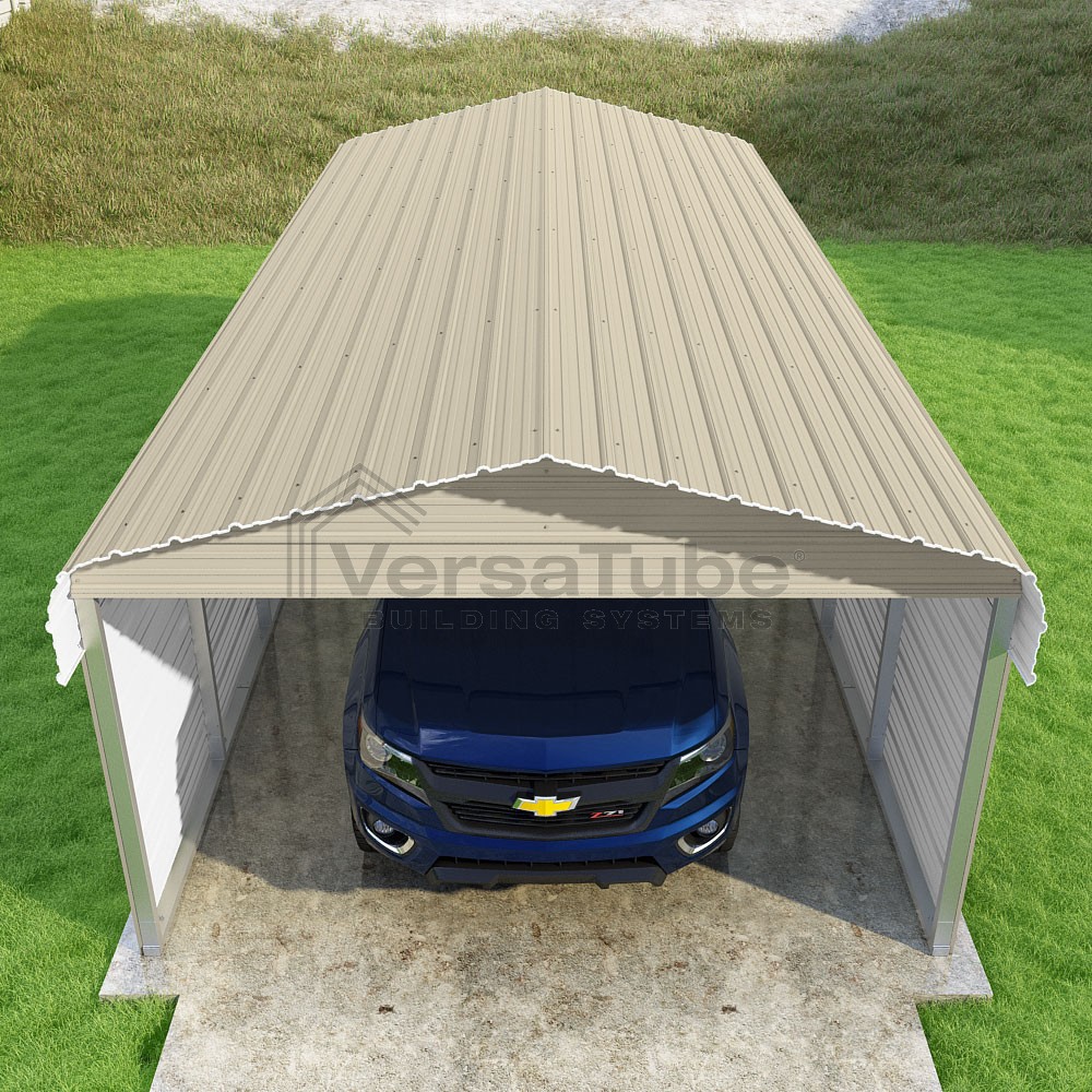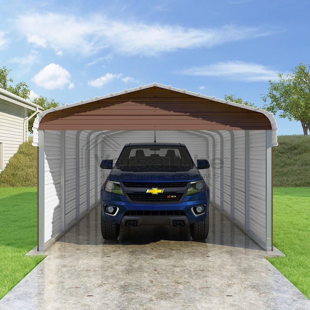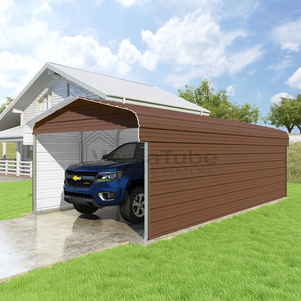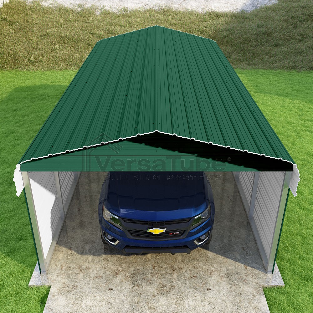 Classic Series DIY carport kit features horizontal application of sheet metal panels with the extra protection of rounded eaves.