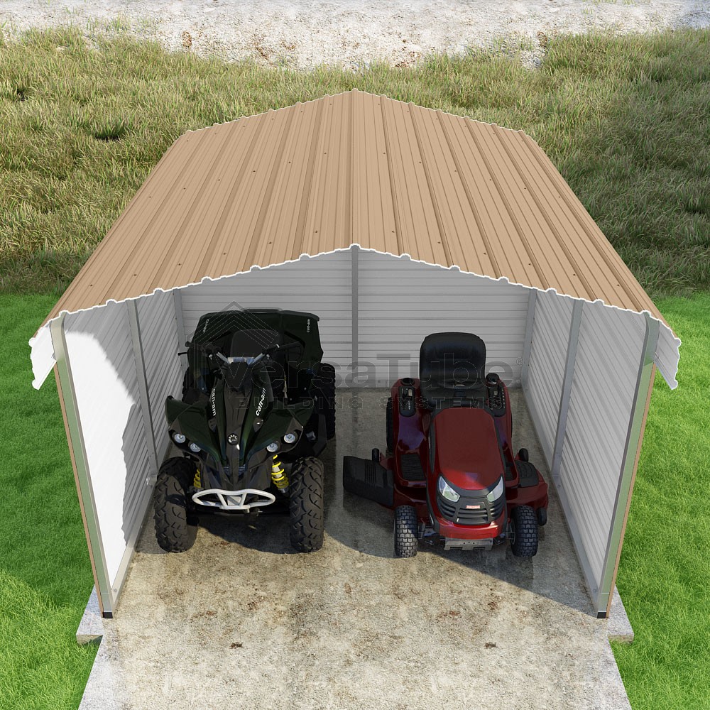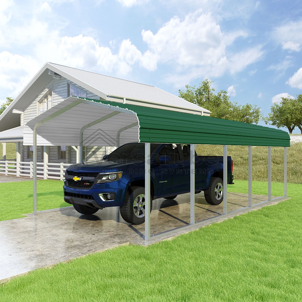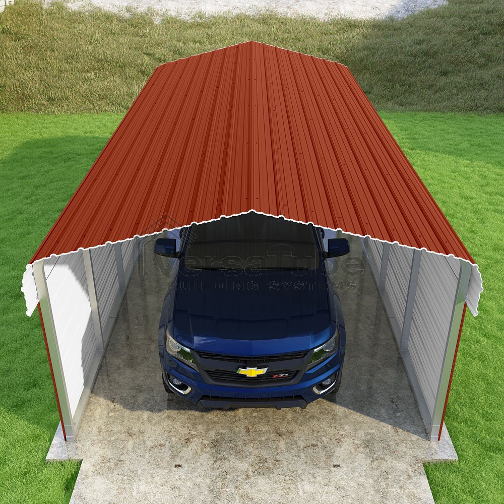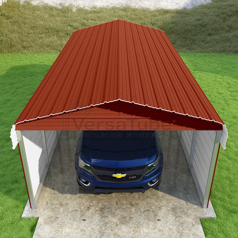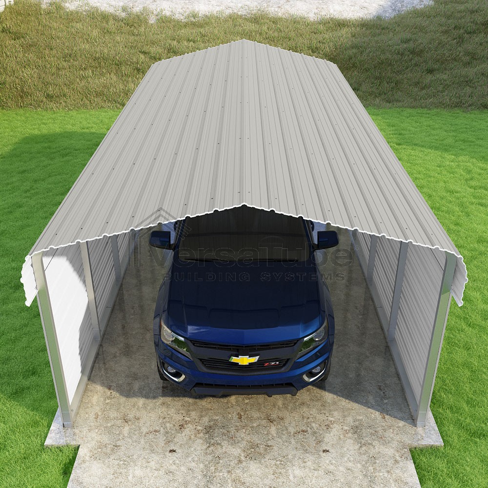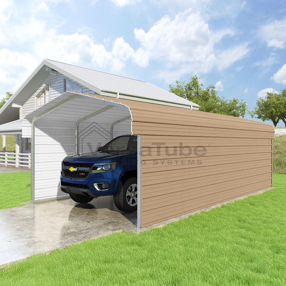Classic Series DIY carport kit features horizontal application of sheet metal panels with the extra protection of rounded eaves.