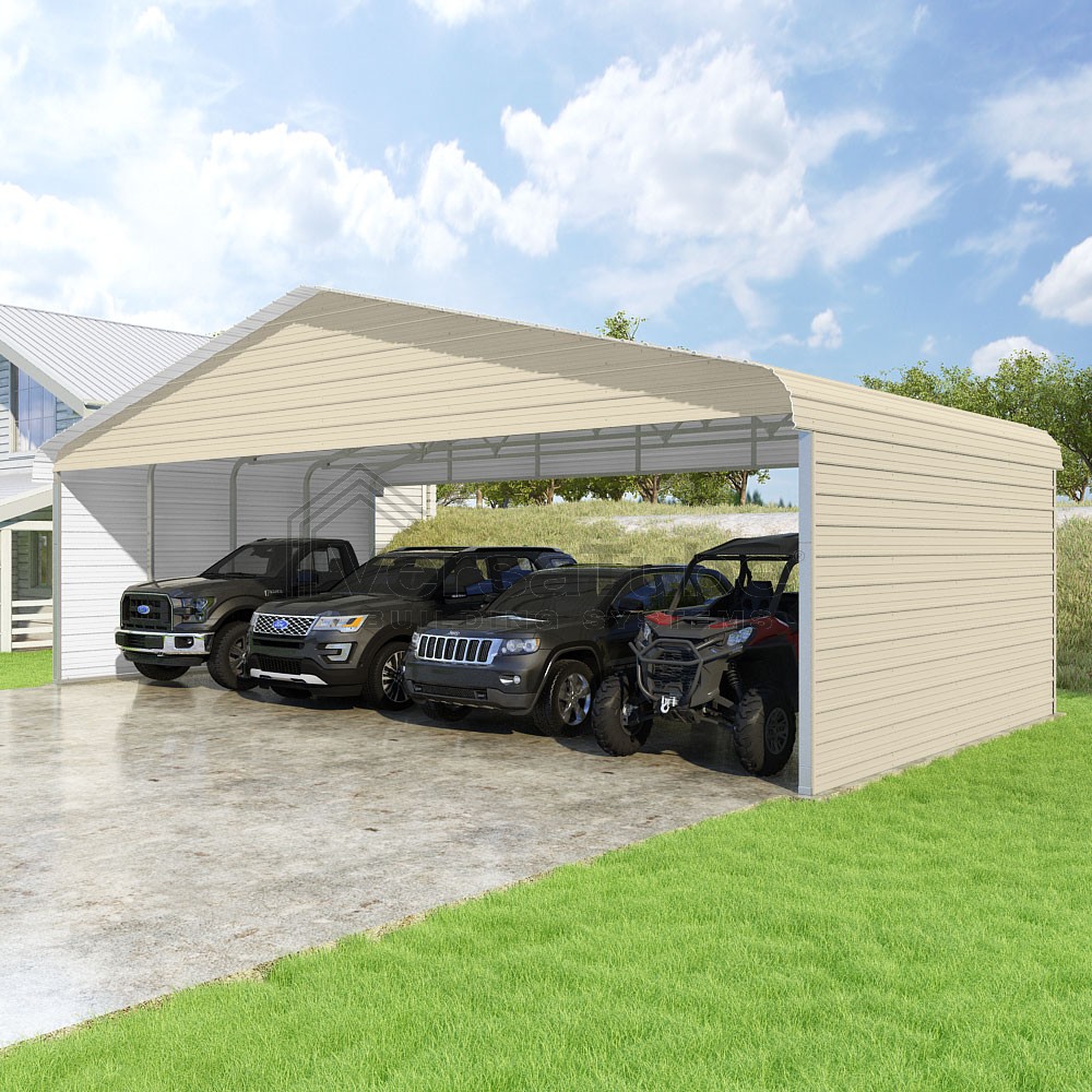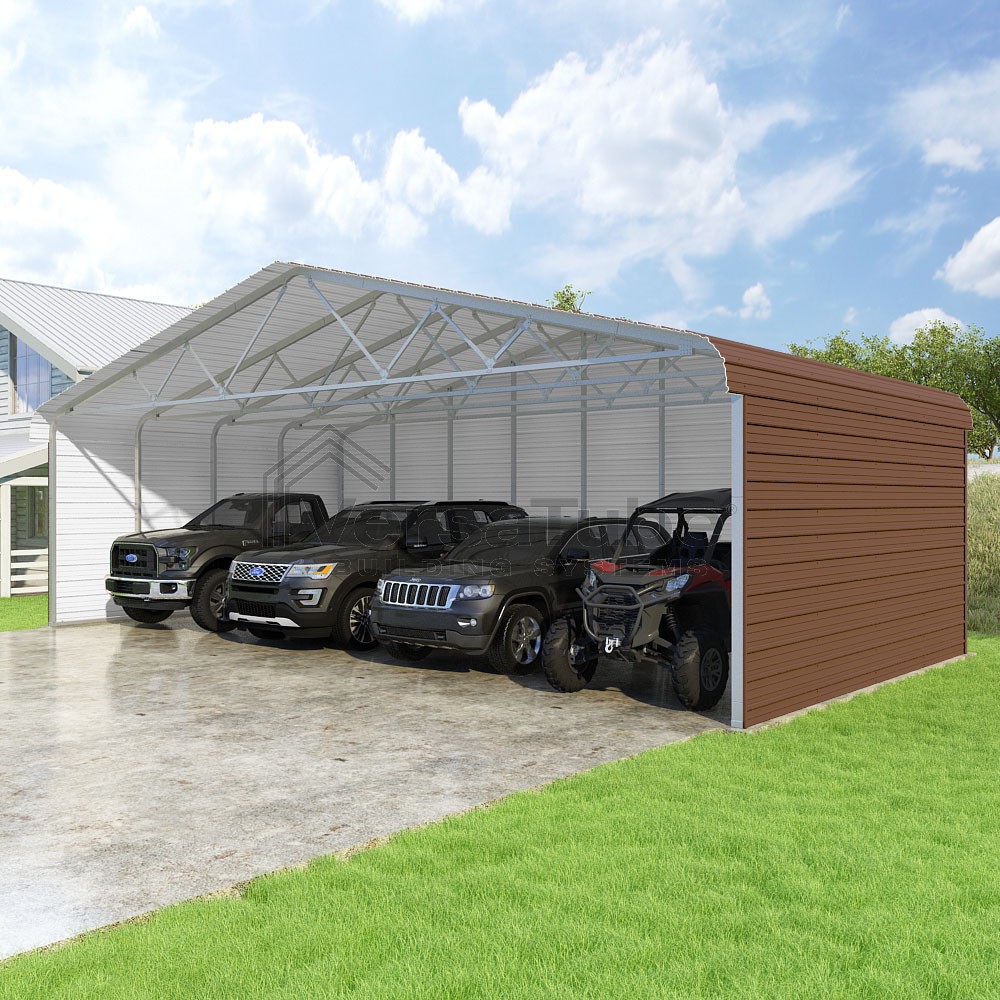 Classic Series DIY carport kit features horizontal application of sheet metal panels with the extra protection of rounded eaves.