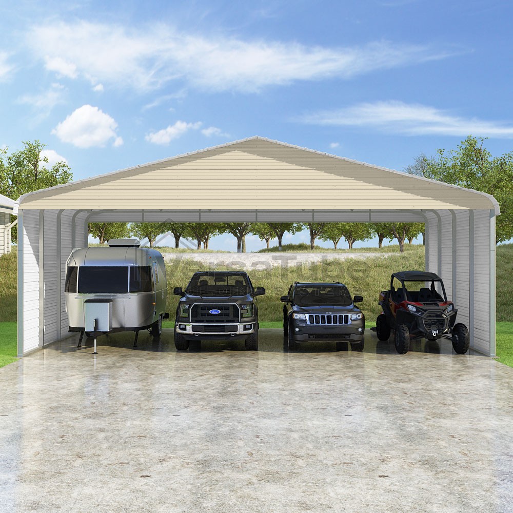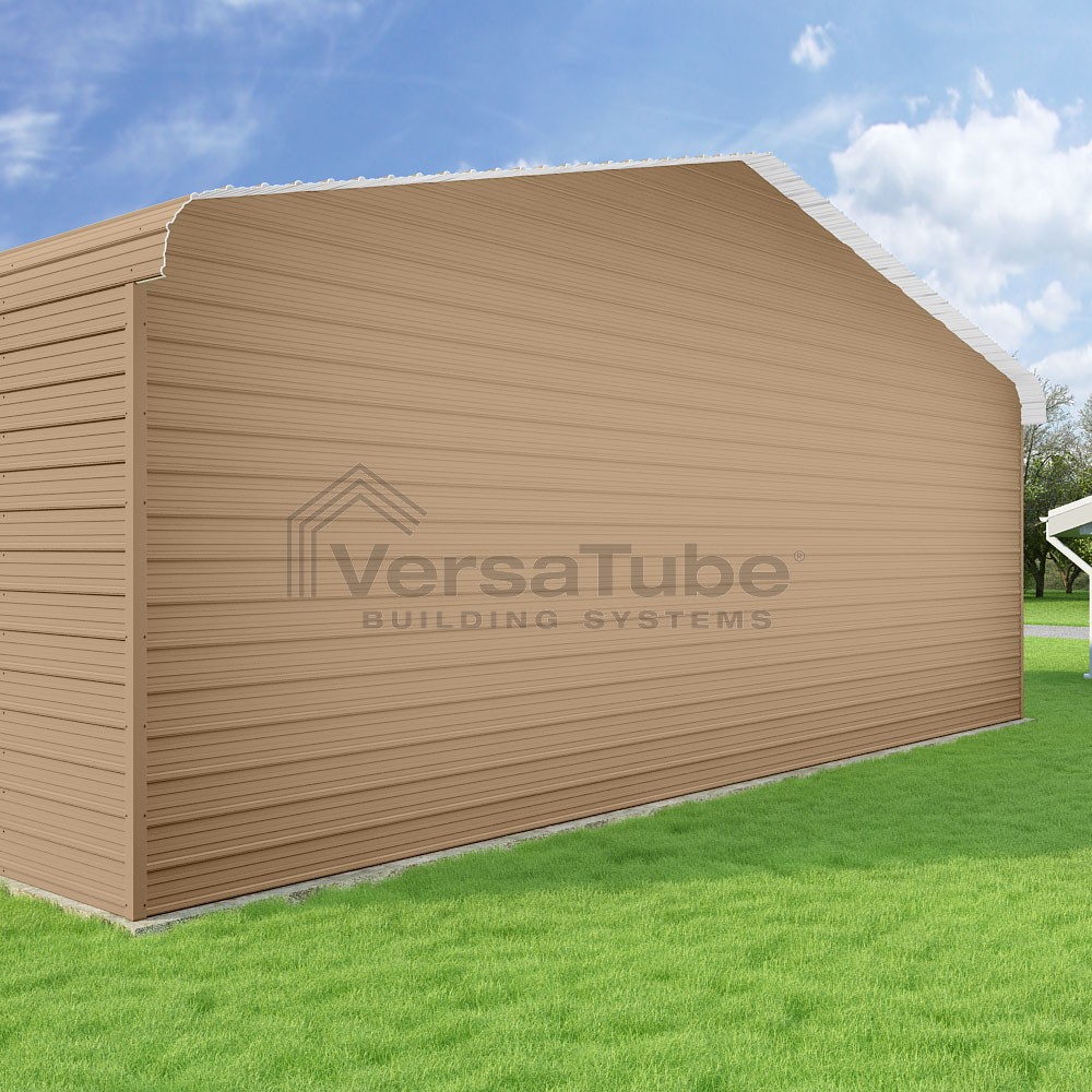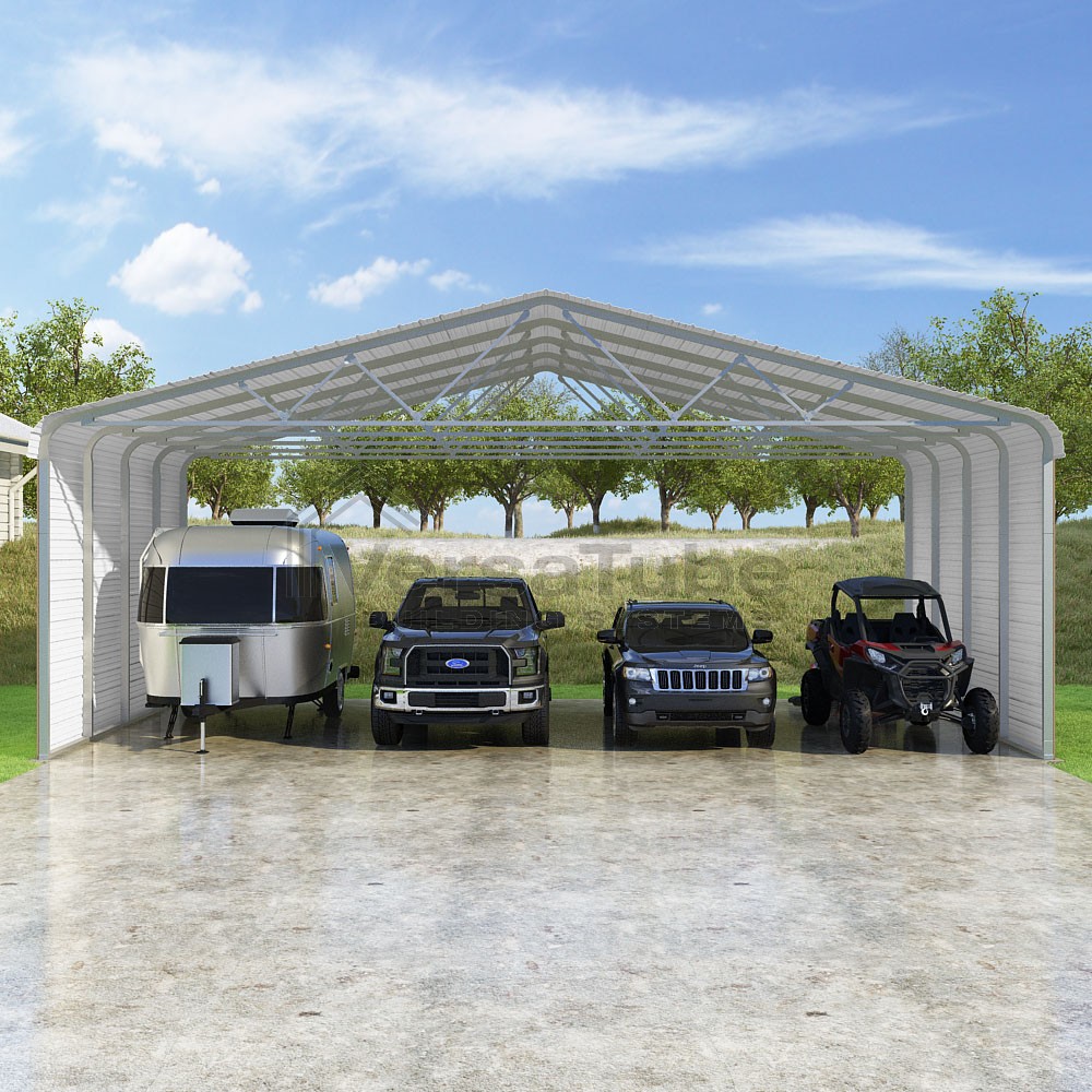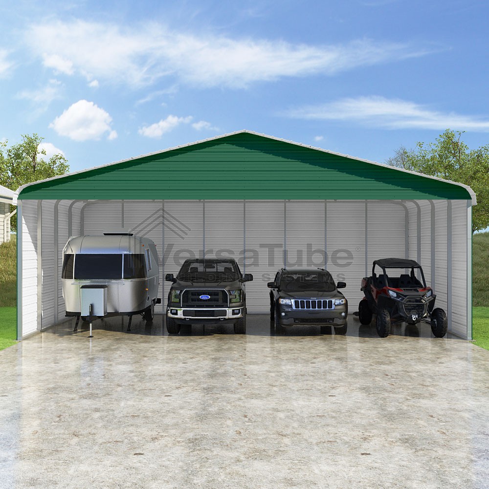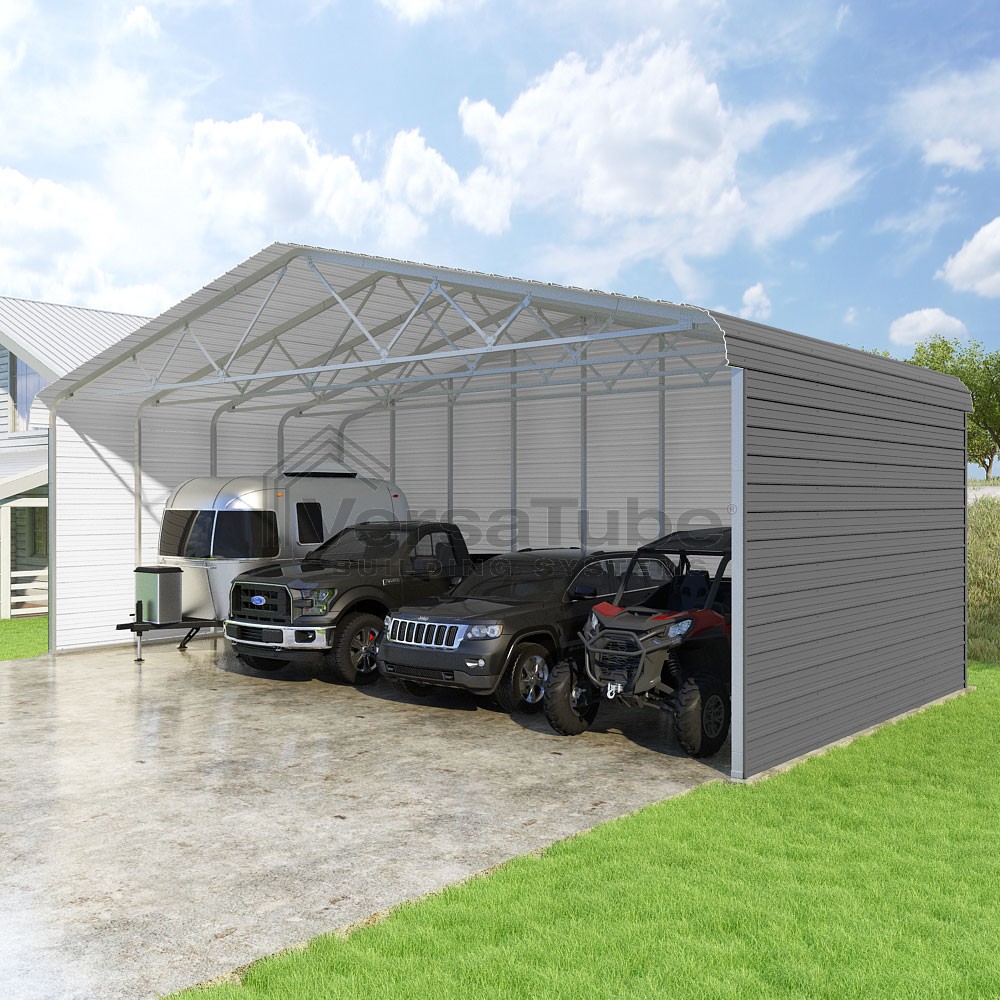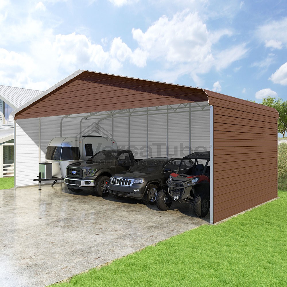 Classic Series DIY carport kit features horizontal application of sheet metal panels with the extra protection of rounded eaves.