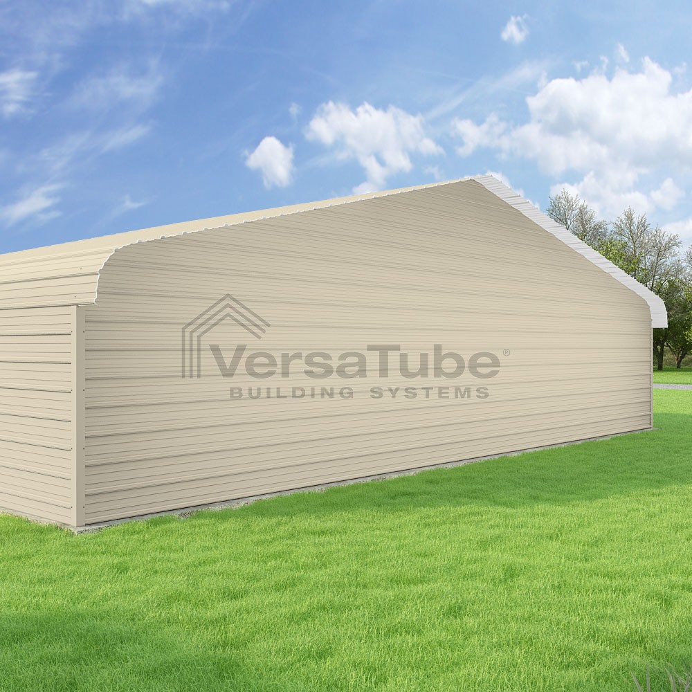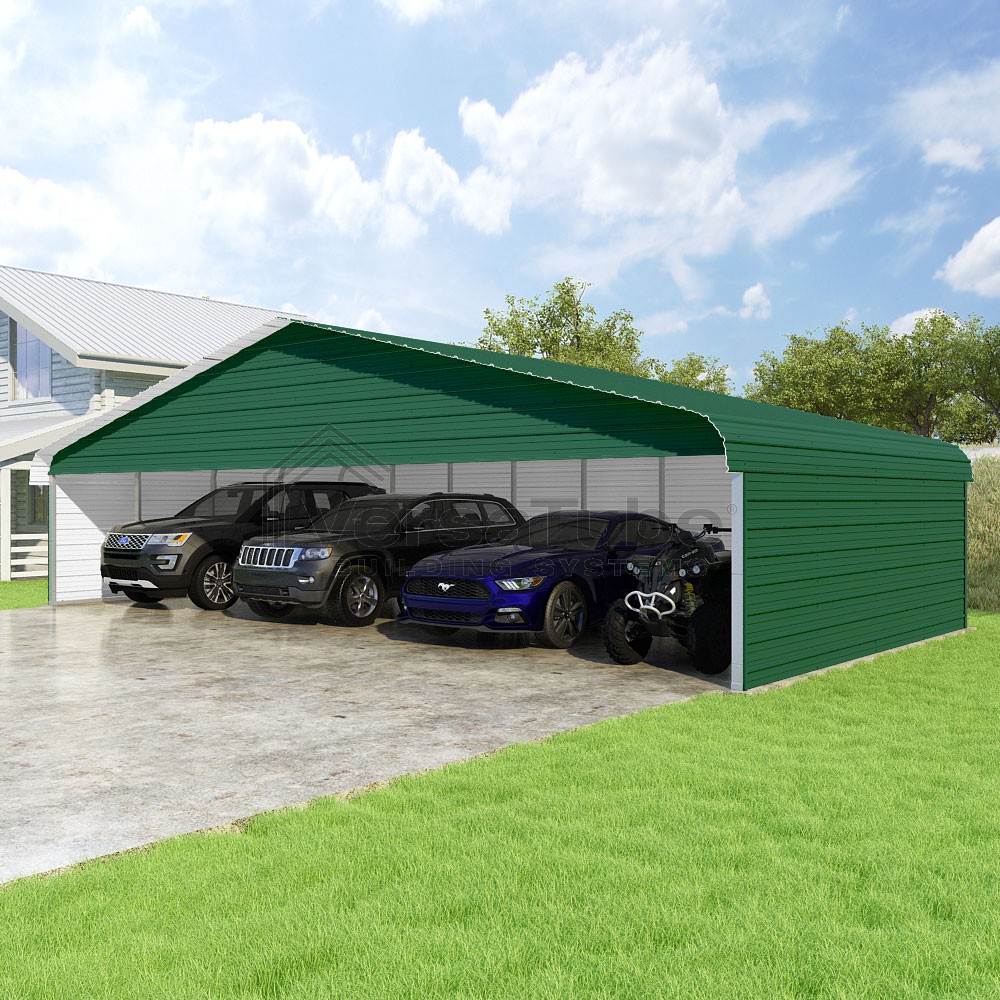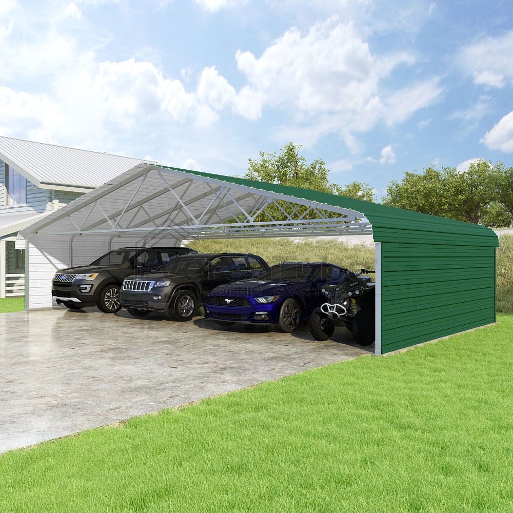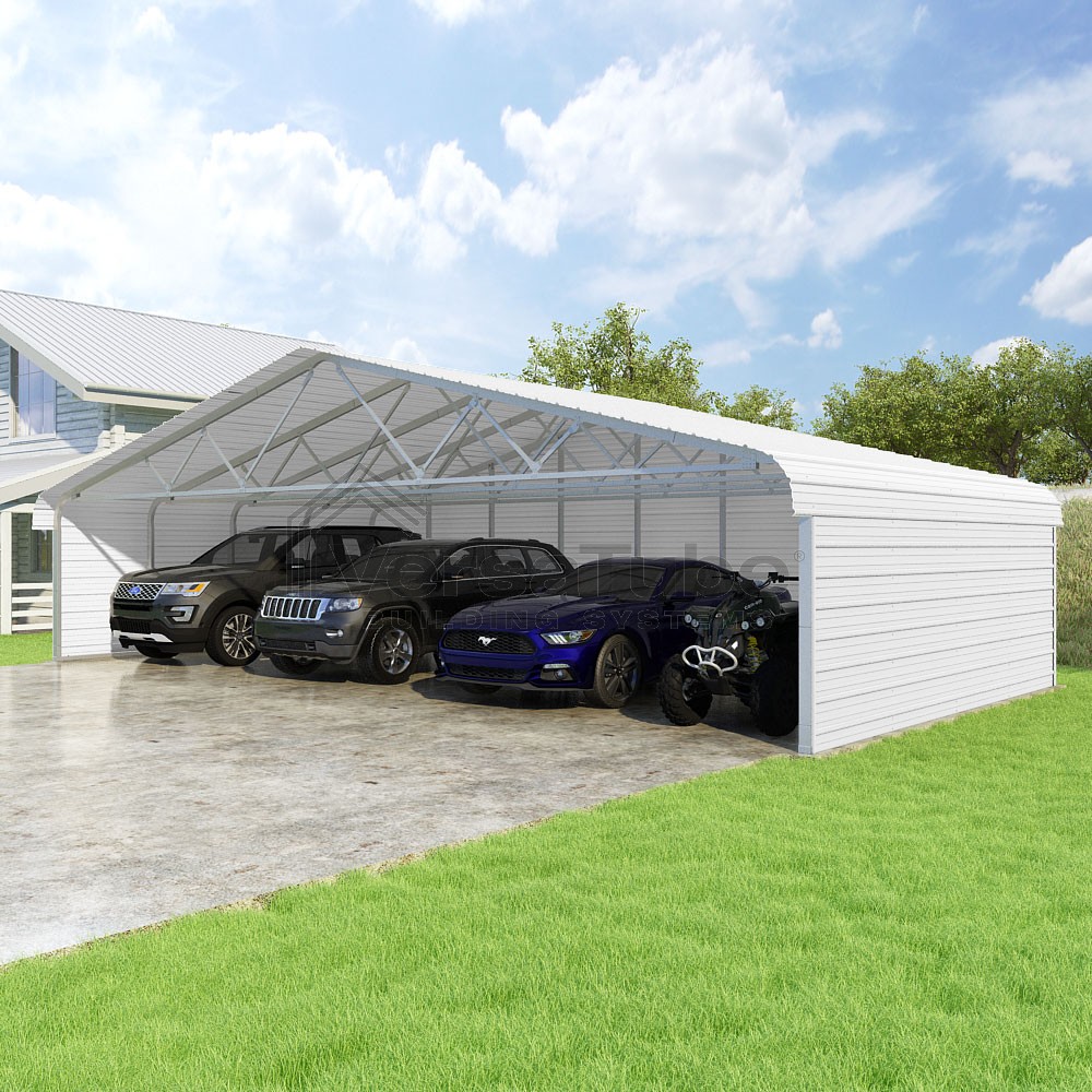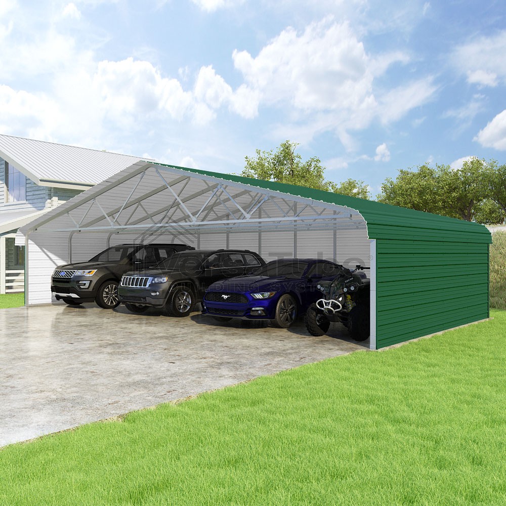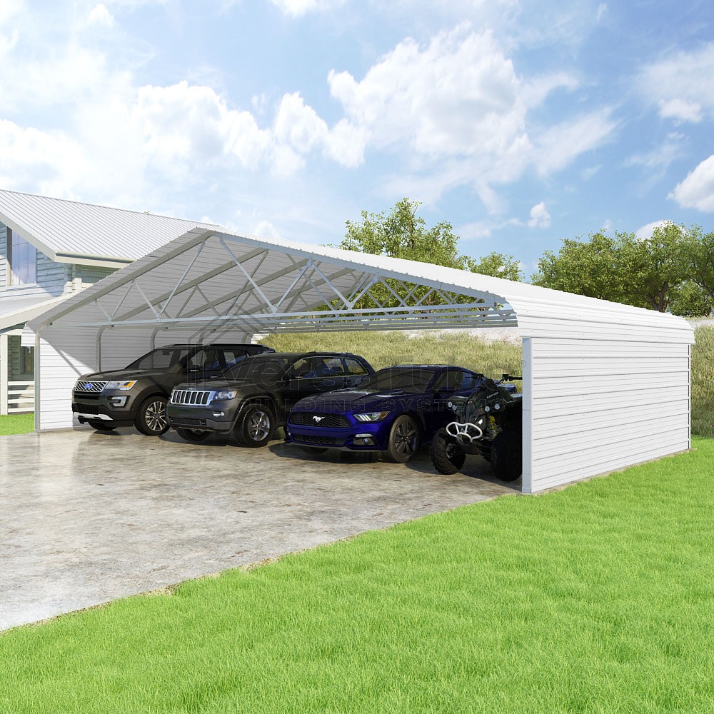 Classic Series DIY carport kit features horizontal application of sheet metal panels with the extra protection of rounded eaves.