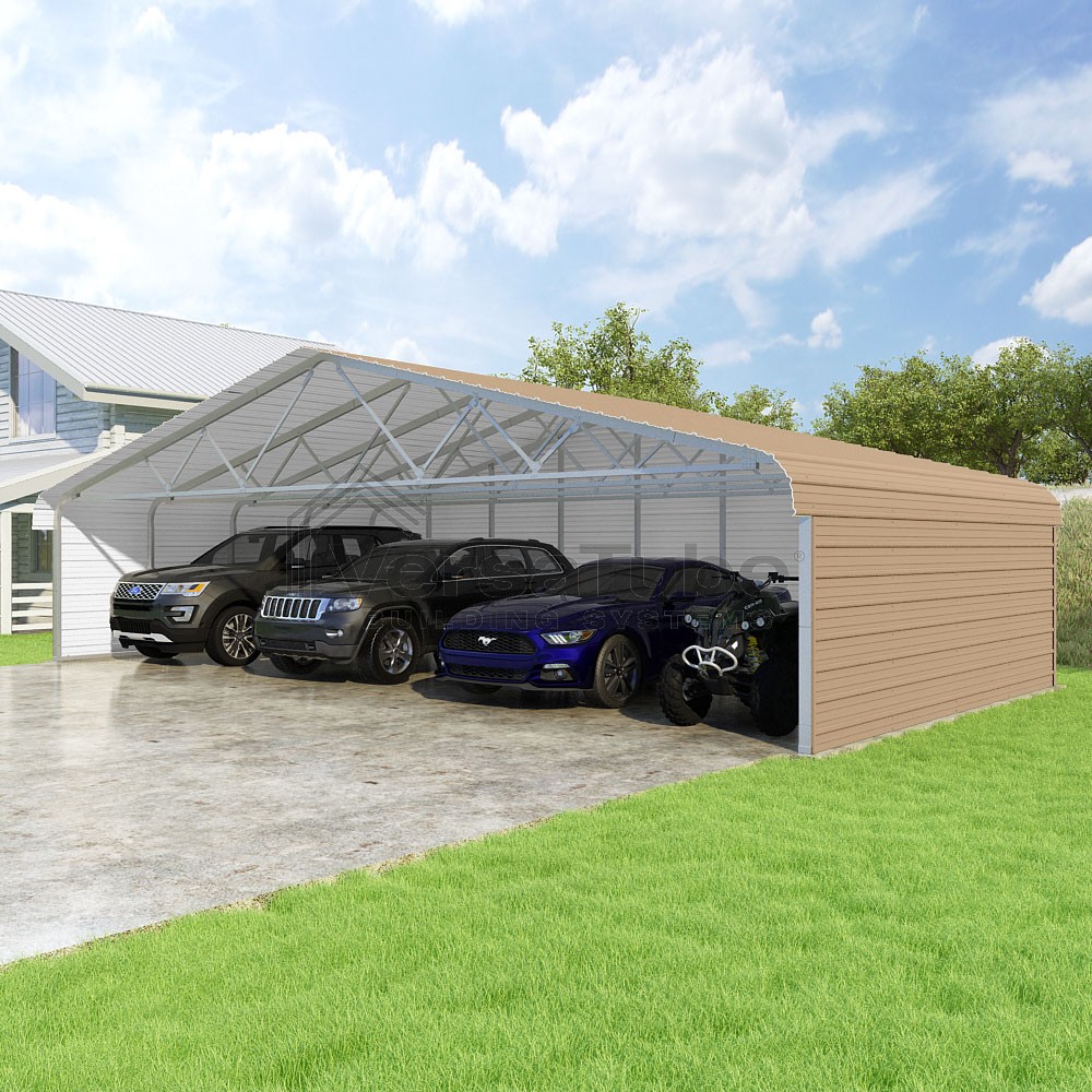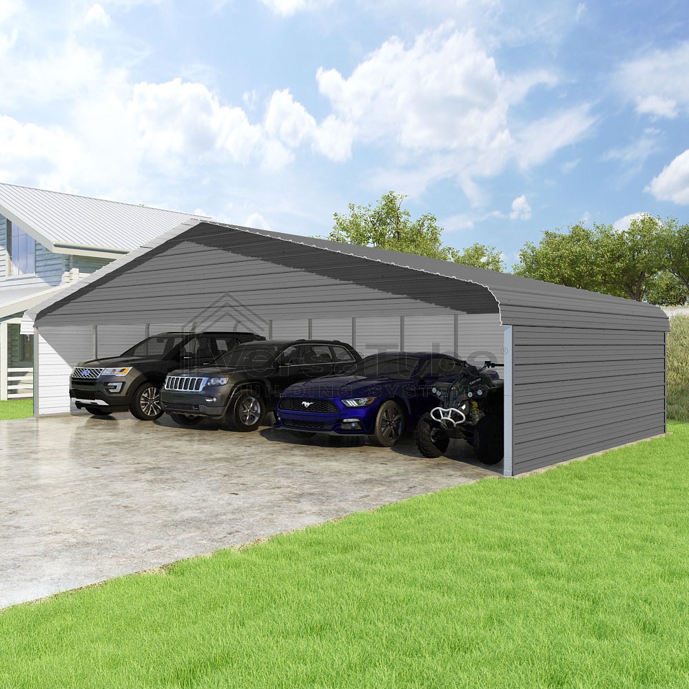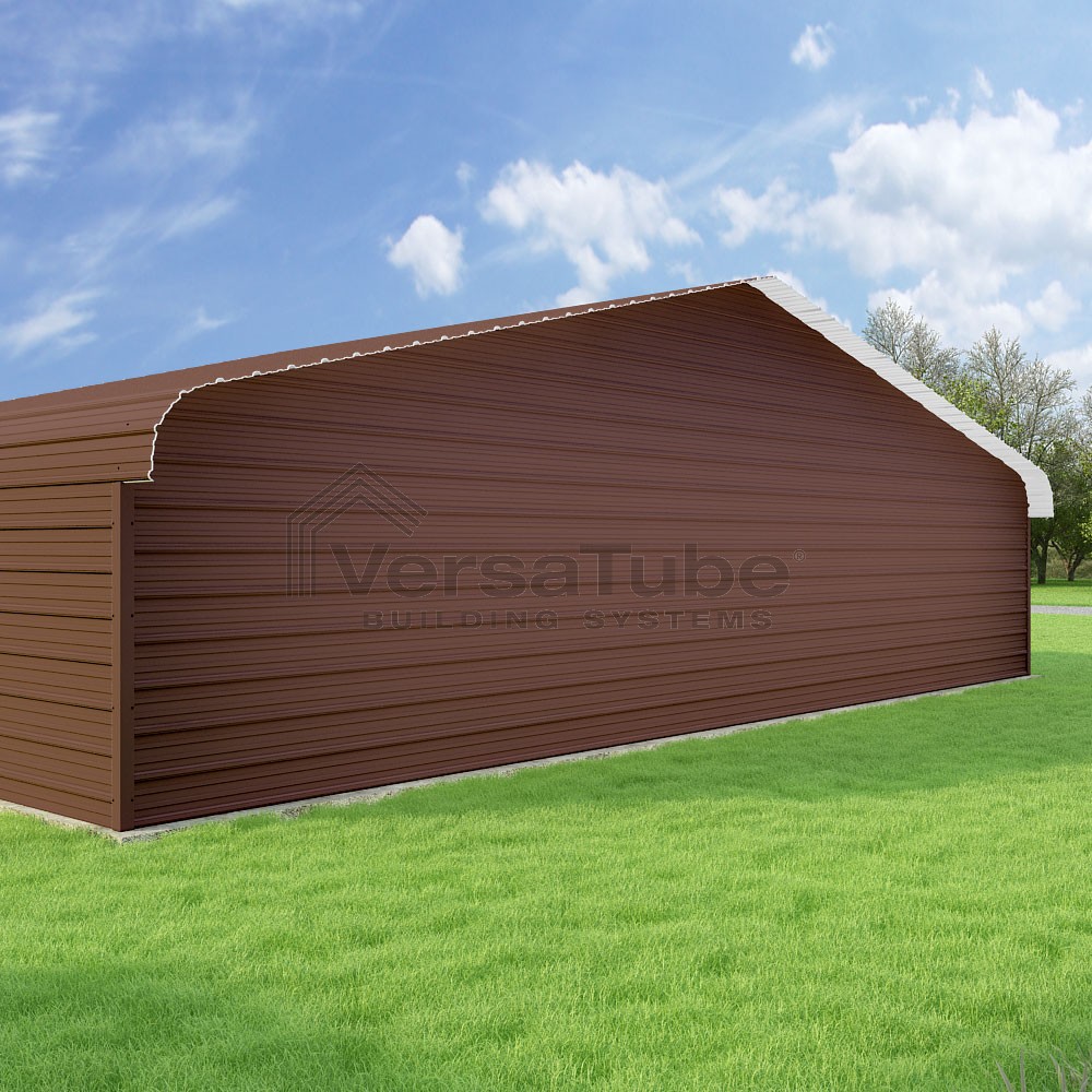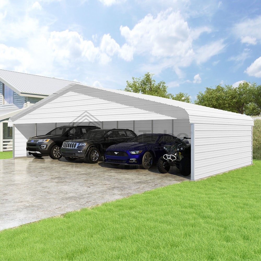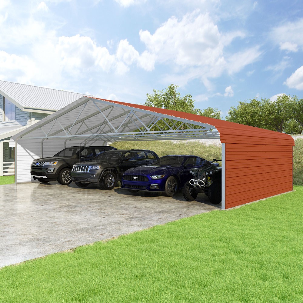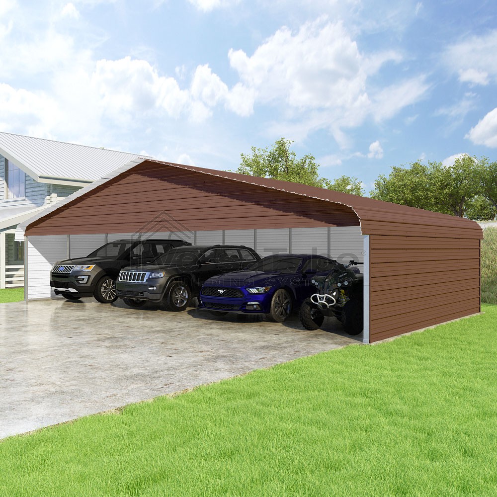 Classic Series DIY carport kit features horizontal application of sheet metal panels with the extra protection of rounded eaves.