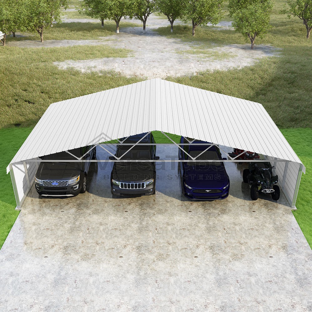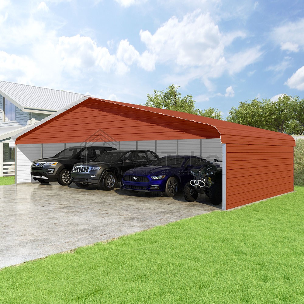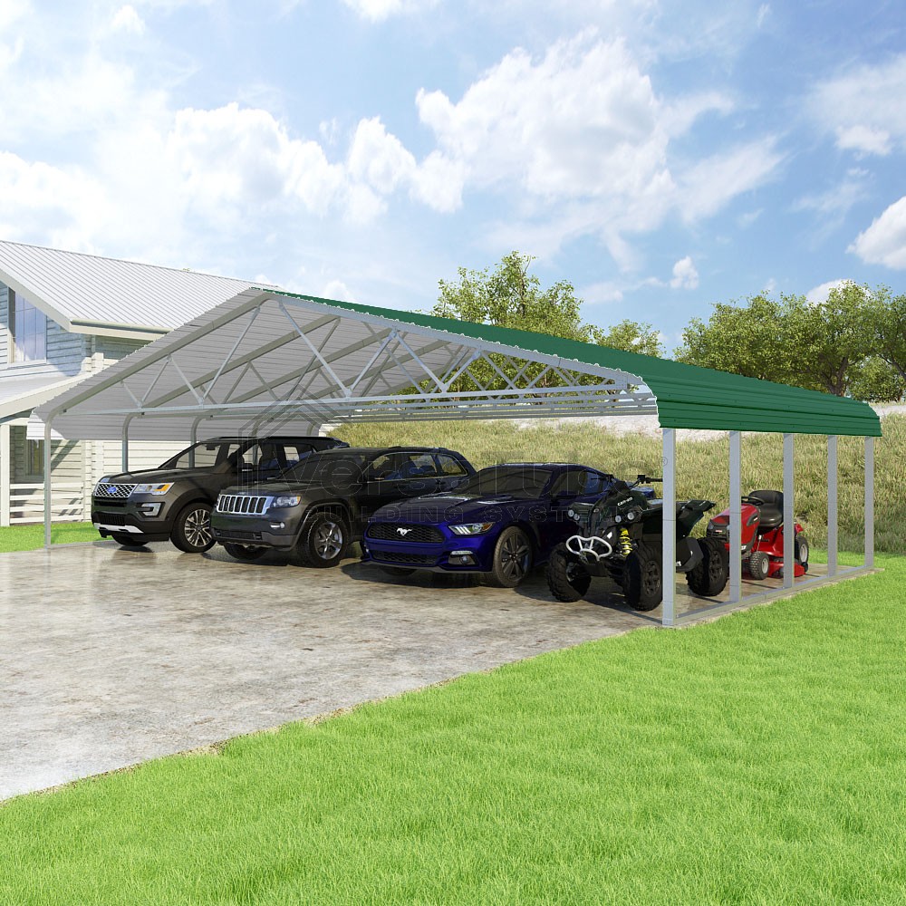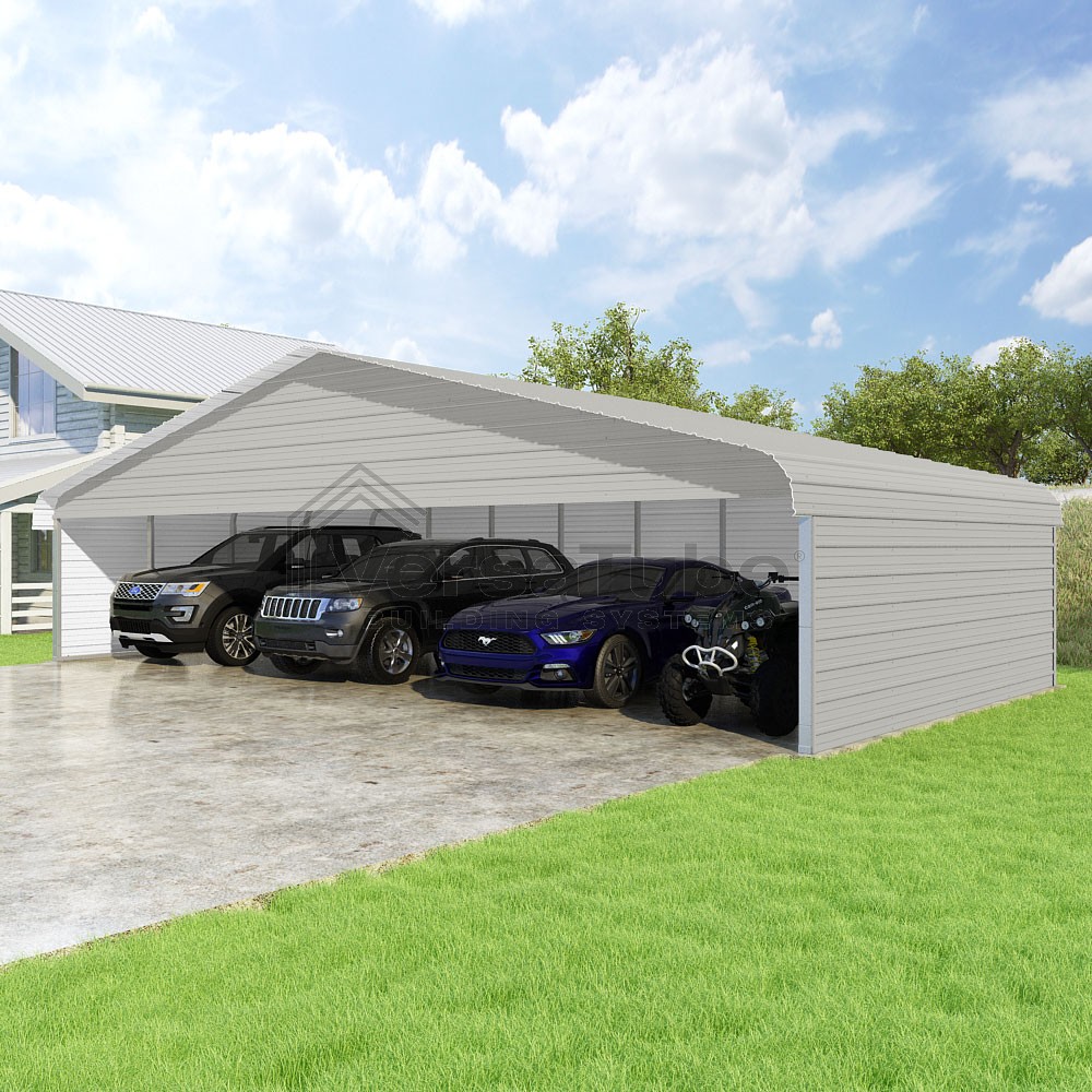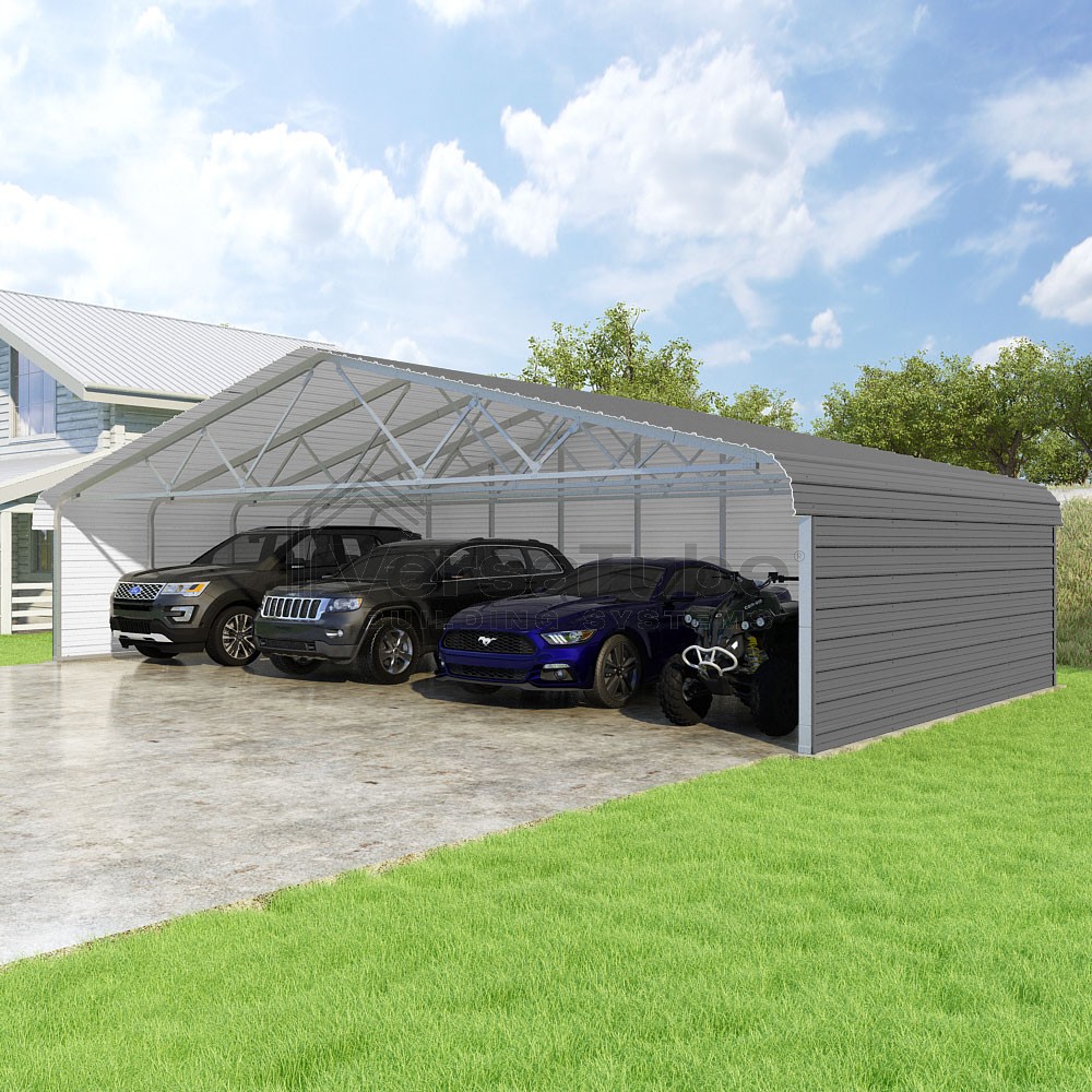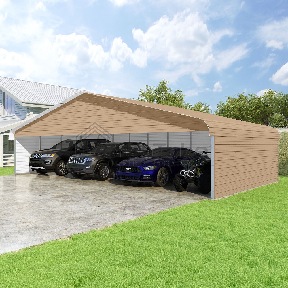 Classic Series DIY carport kit features horizontal application of sheet metal panels with the extra protection of rounded eaves.