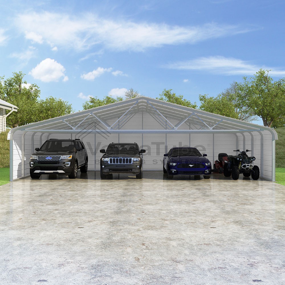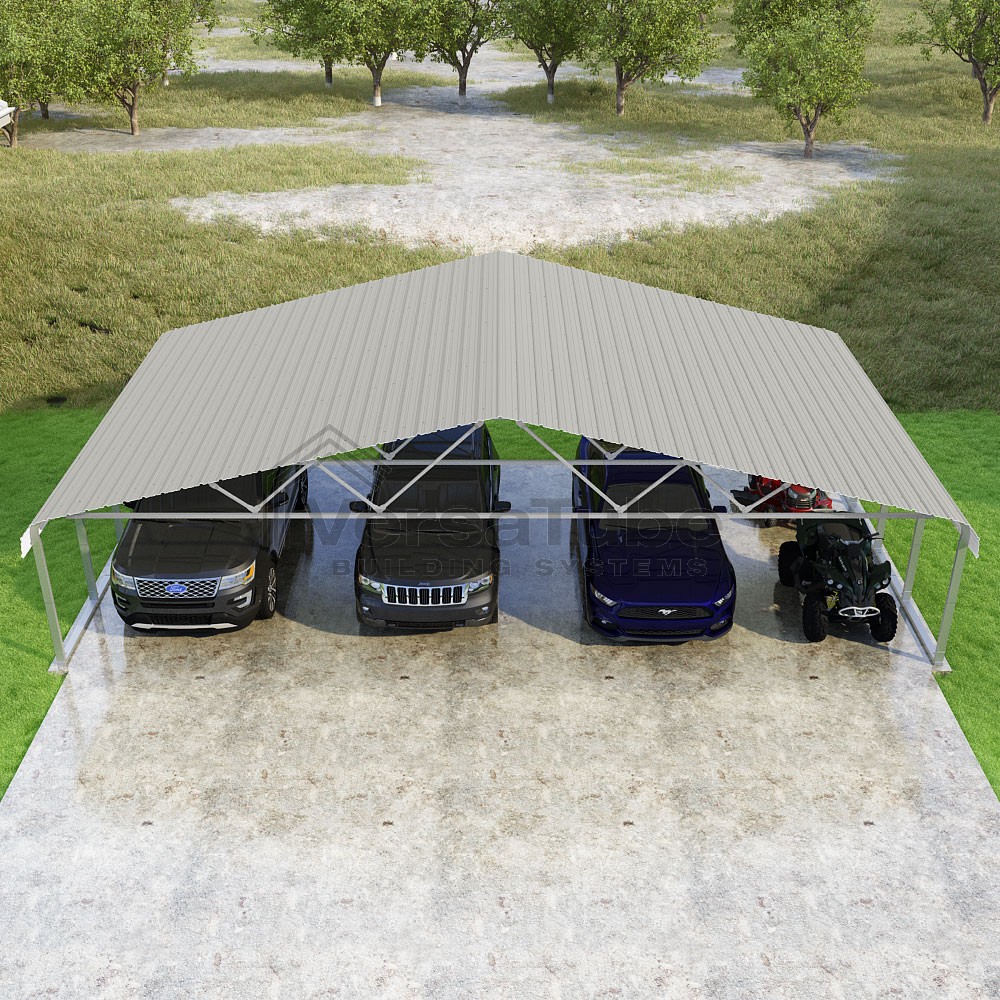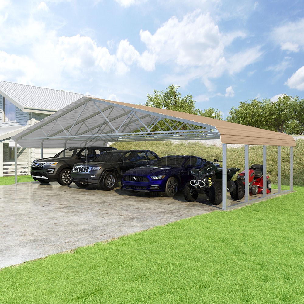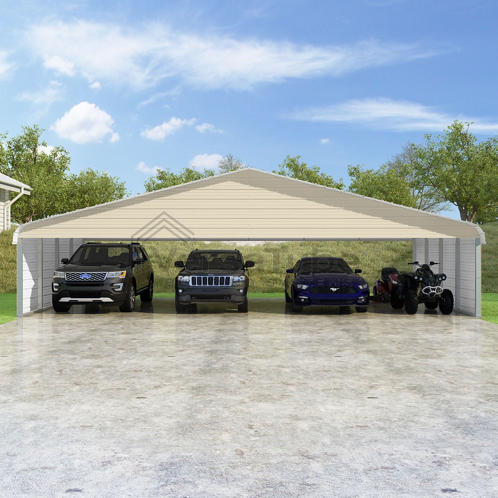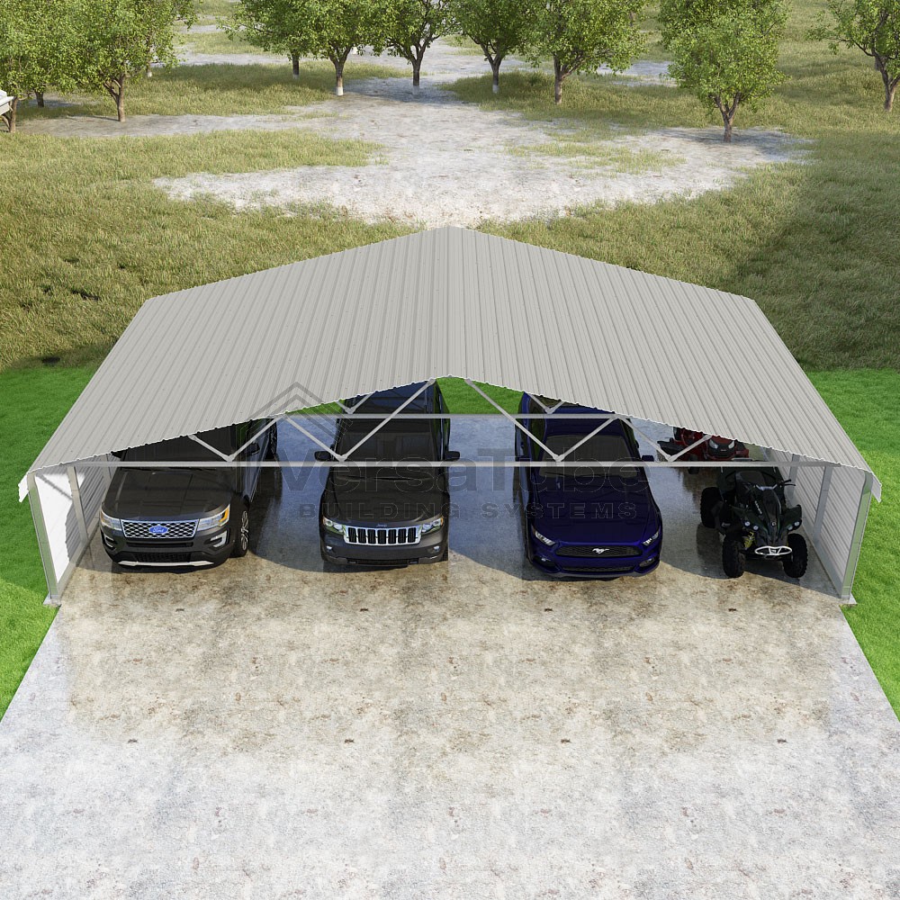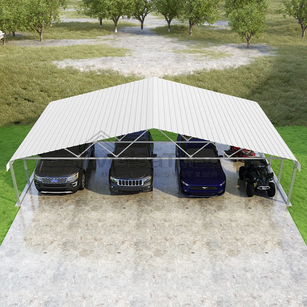 Classic Series DIY carport kit features horizontal application of sheet metal panels with the extra protection of rounded eaves.
