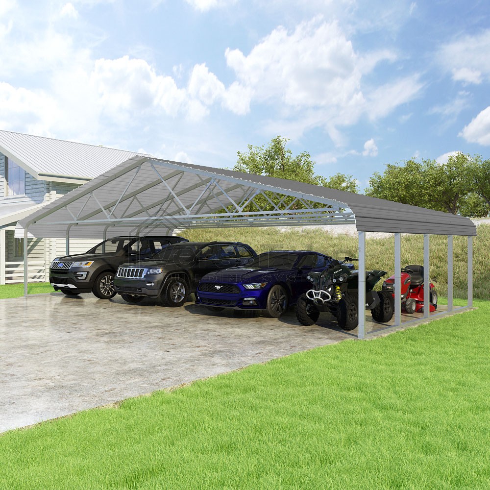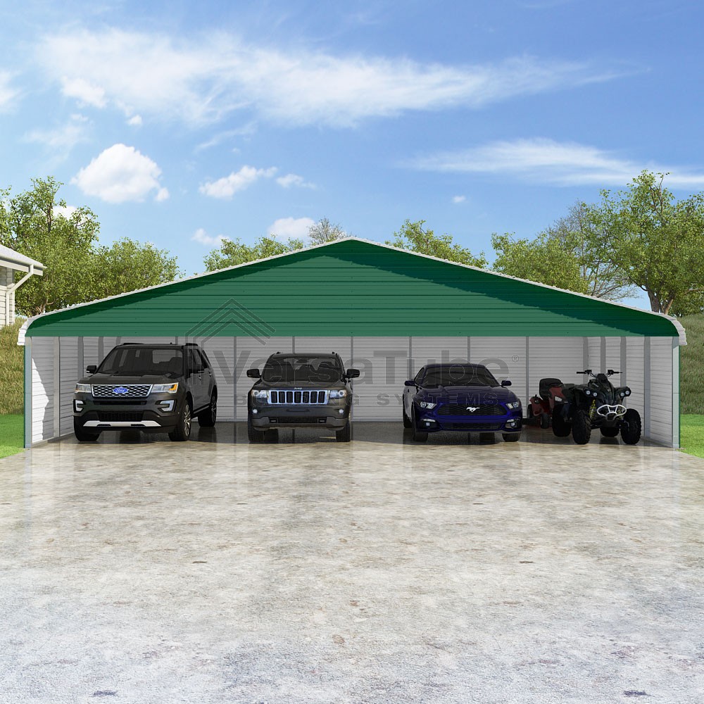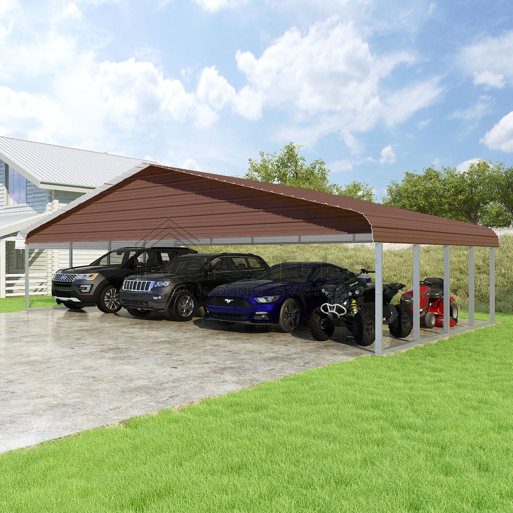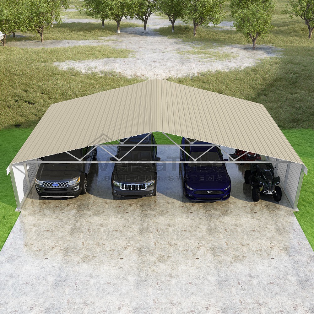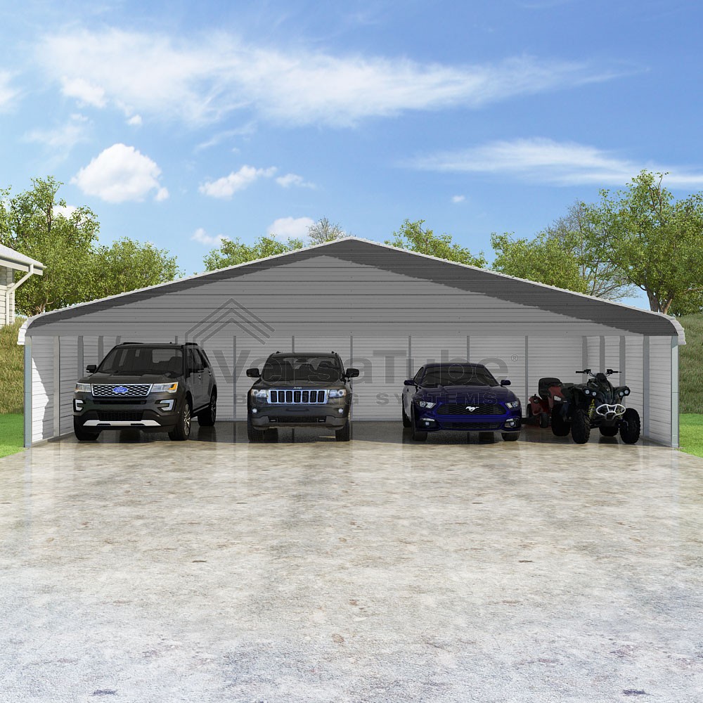 Classic Series DIY carport kit features horizontal application of sheet metal panels with the extra protection of rounded eaves.