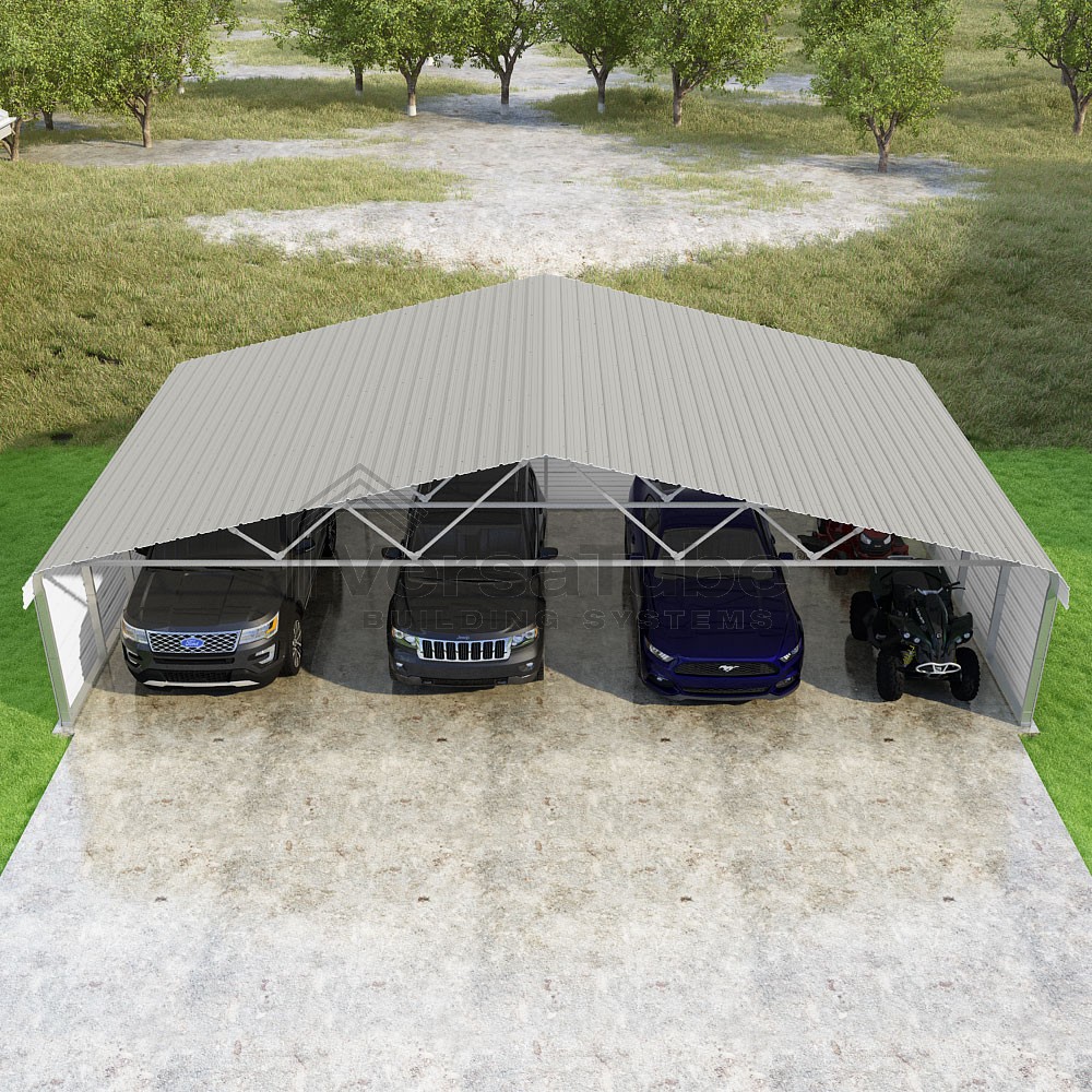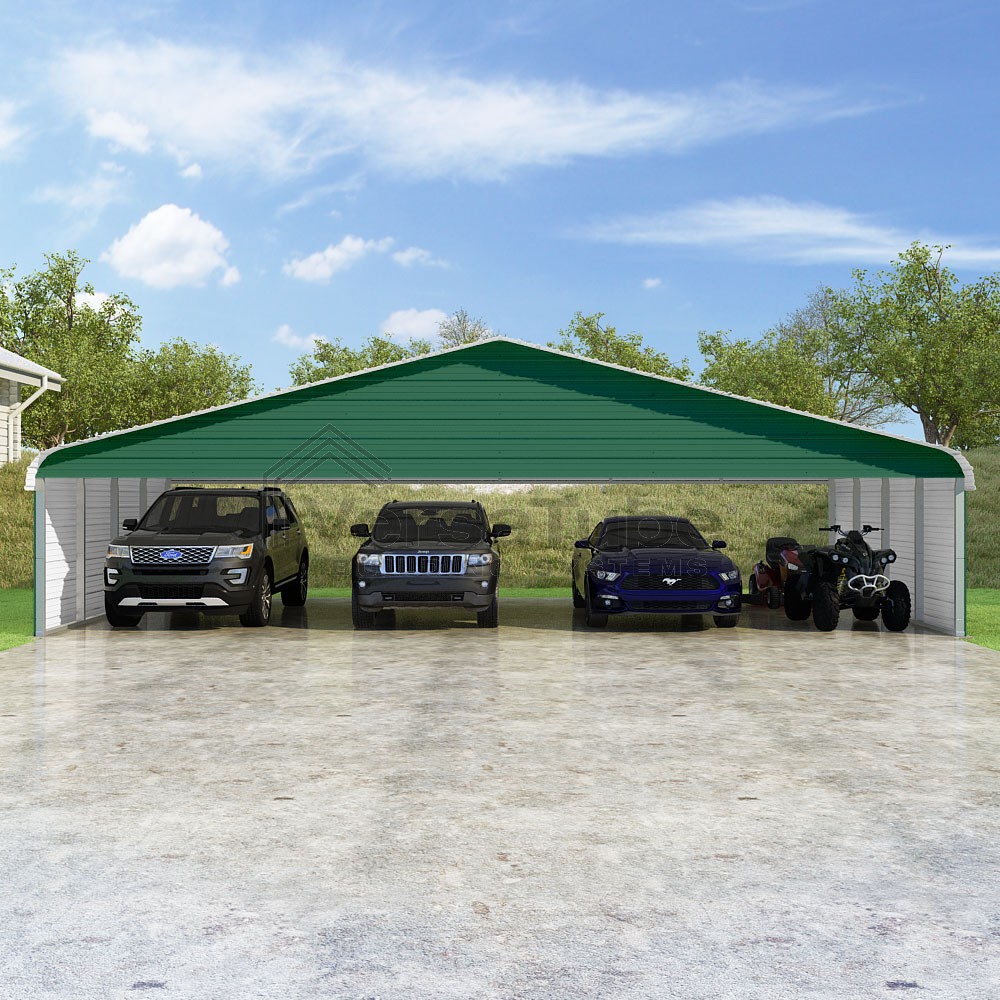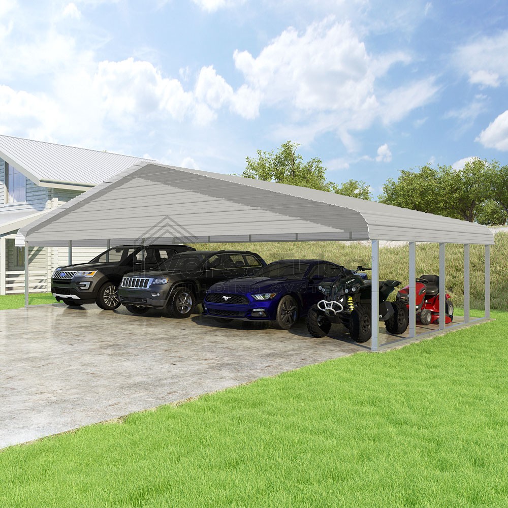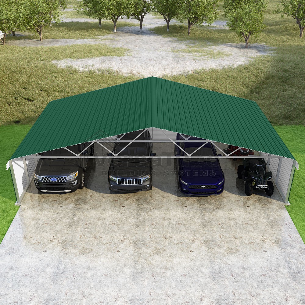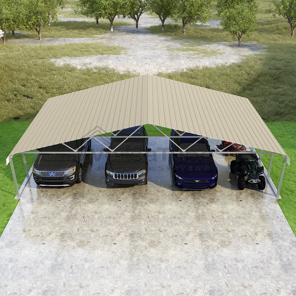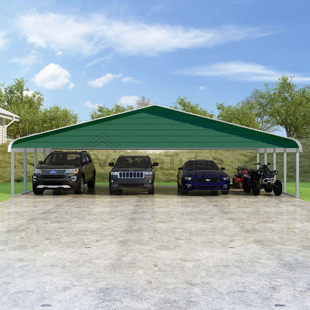 Classic Series DIY carport kit features horizontal application of sheet metal panels with the extra protection of rounded eaves.