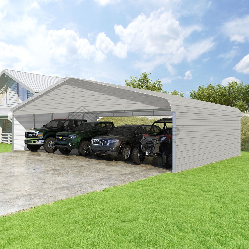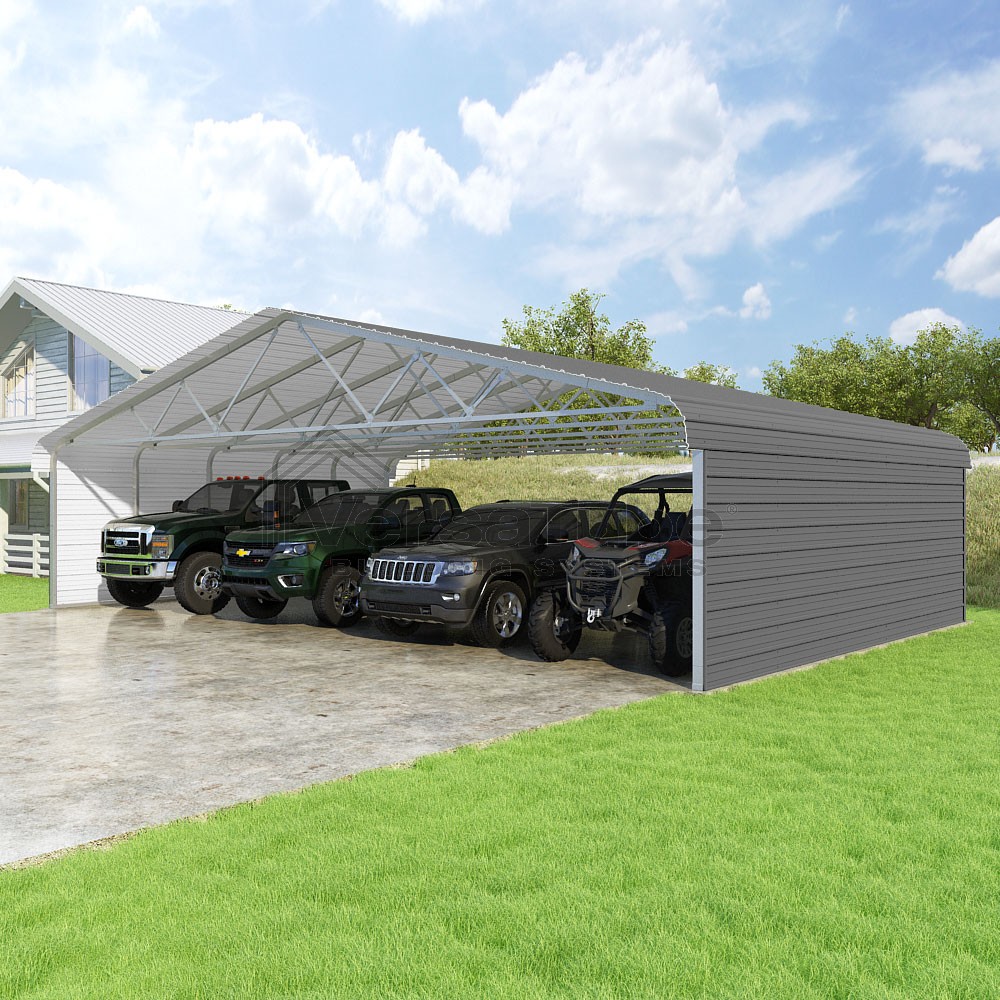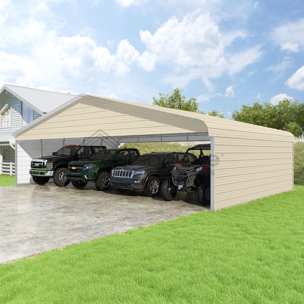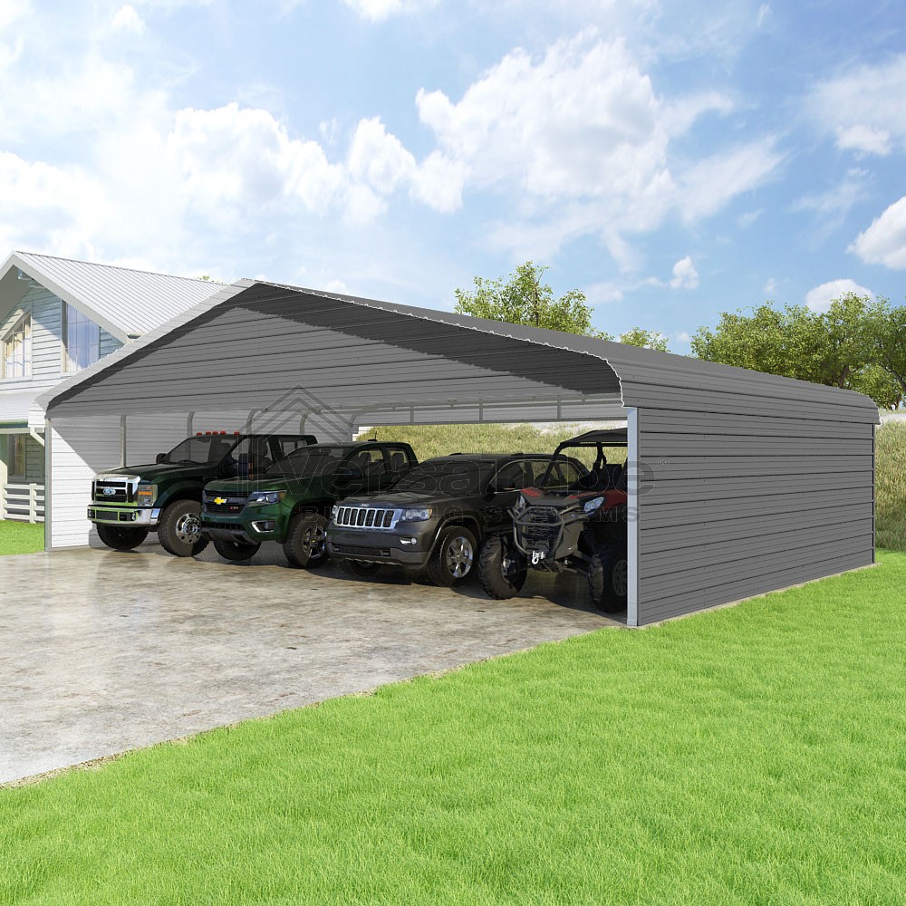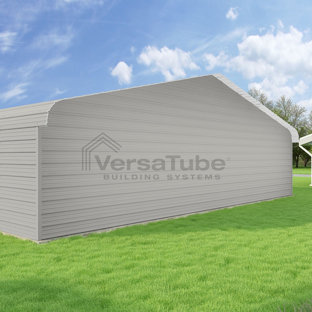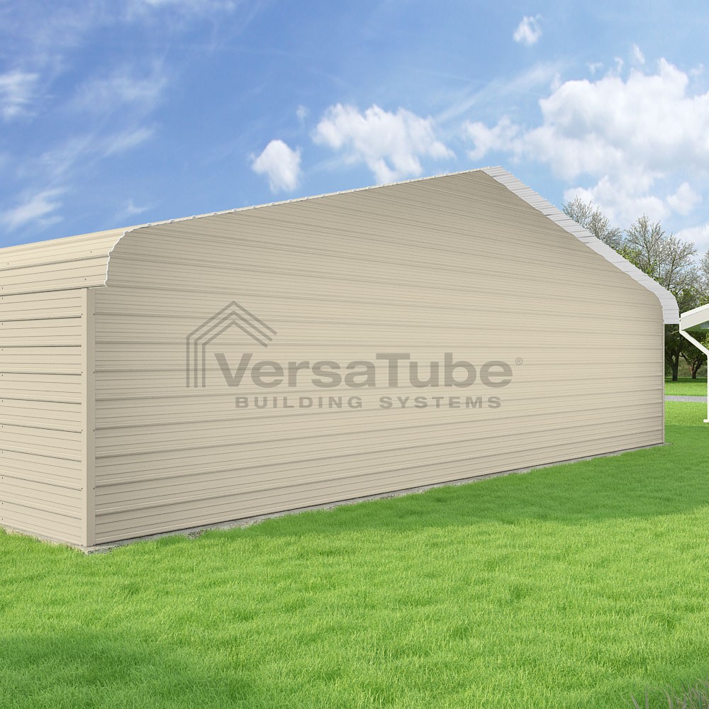 Classic Series DIY carport kit features horizontal application of sheet metal panels with the extra protection of rounded eaves.